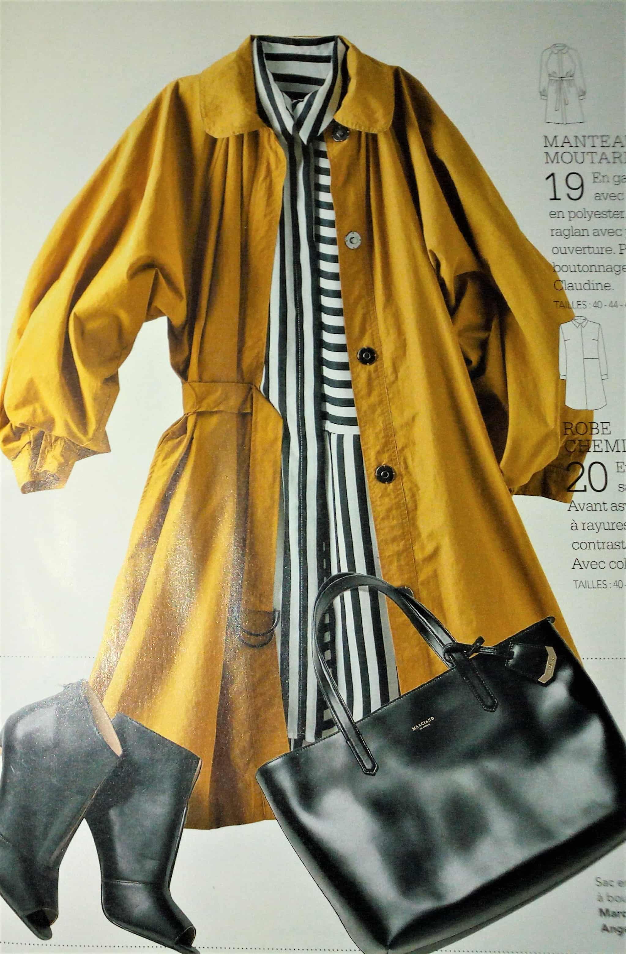 16 – Gilet en suédine tailles 40 – 44 – 48 19 – Manteau moutarde tailles 40 – 44 – 48