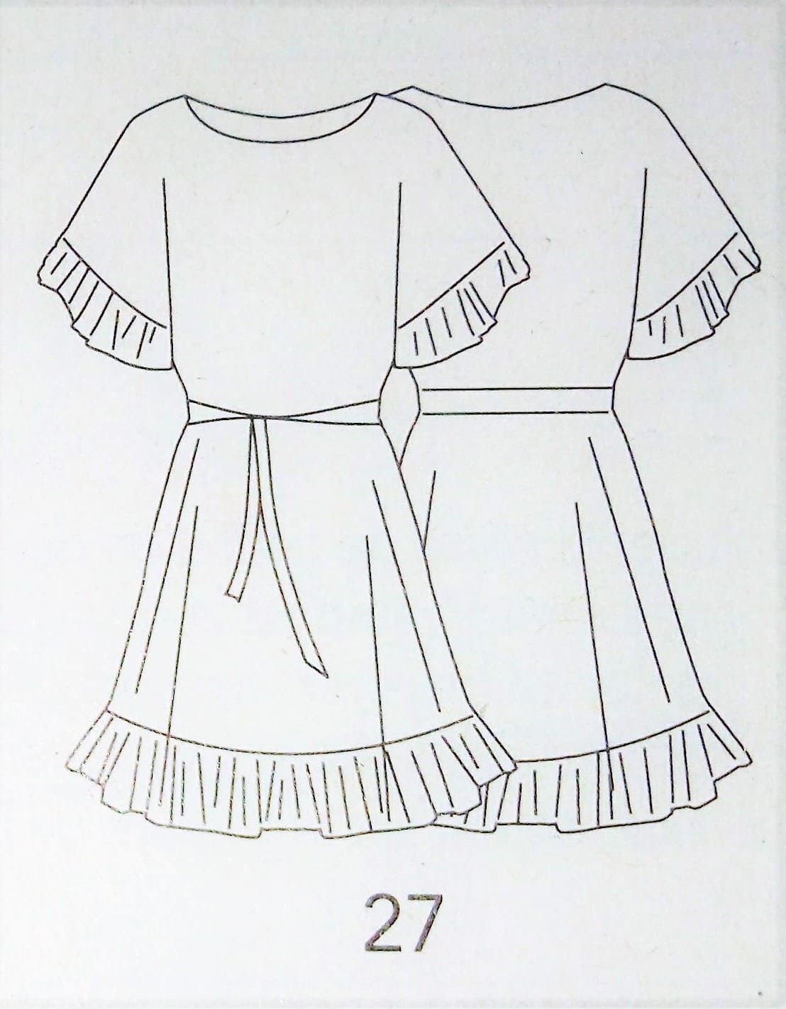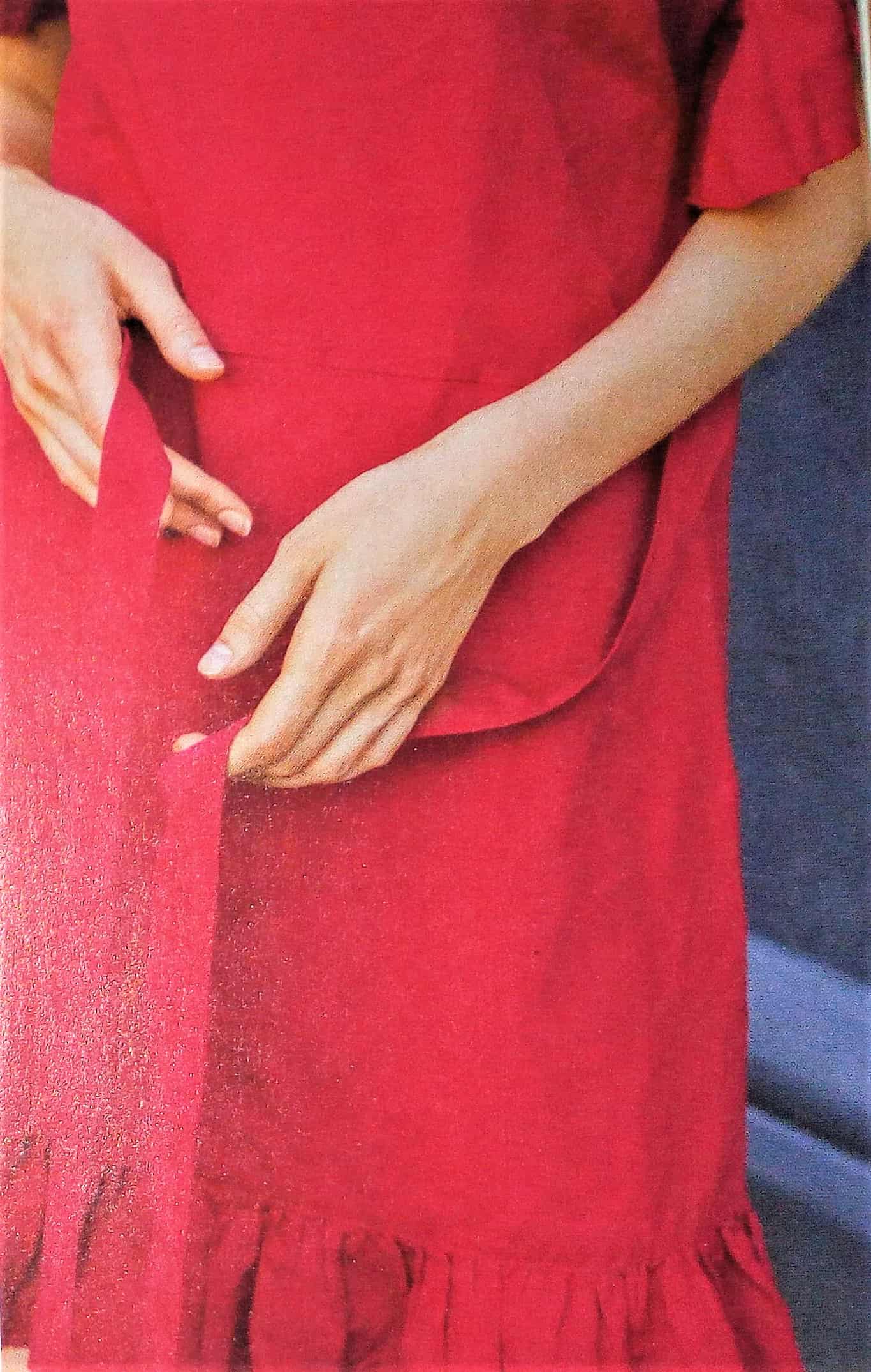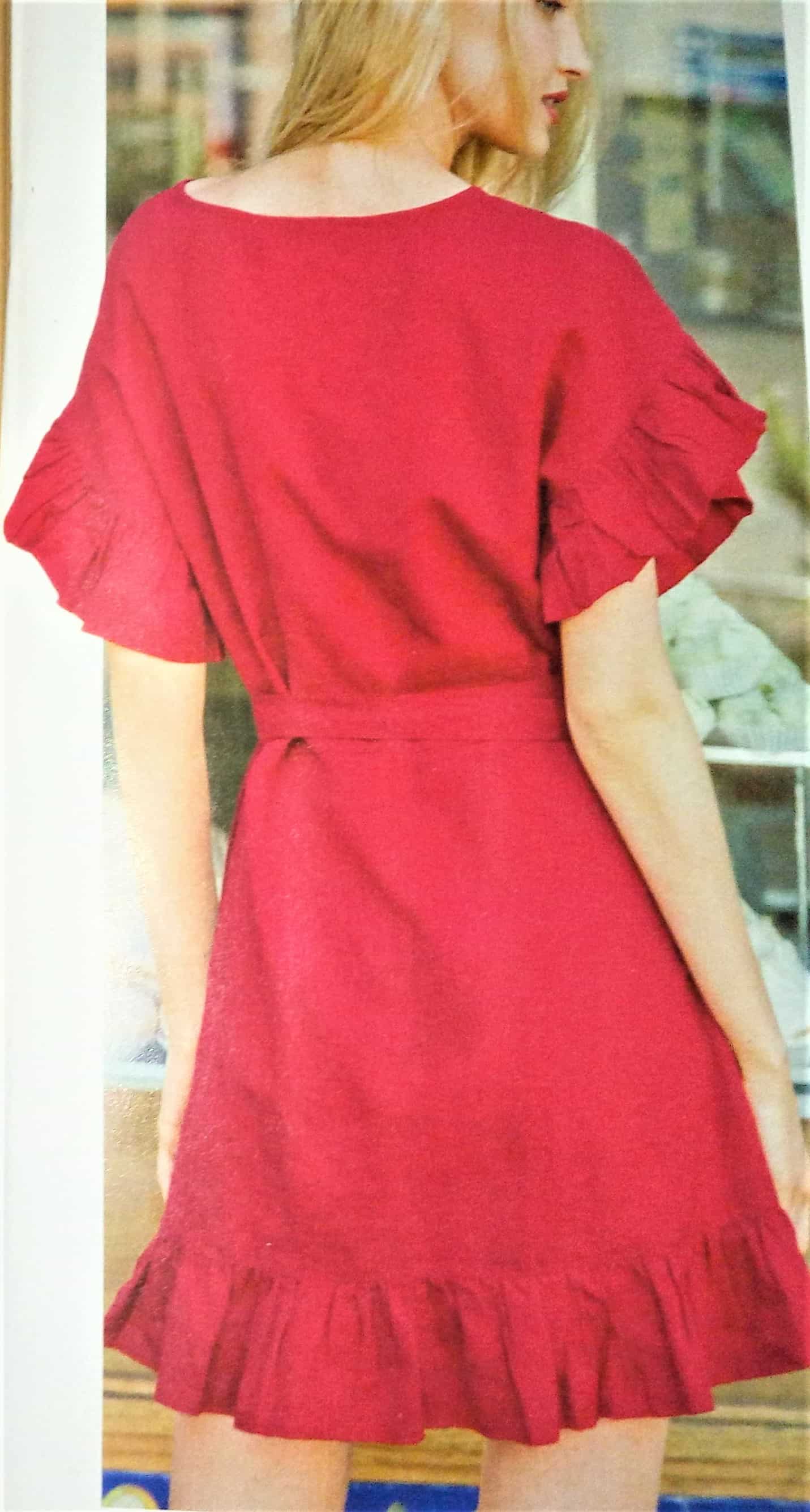 Des volants! Ce sont les grandes vedettes depuis quelques temps dans la mode. Ici on trouve une robe toute simple avec un volant sur l’ourlet des manches et de la robe. Une ceinture nouée vient marquer la taille. Elle va de la taille 38 – 42 – 46.