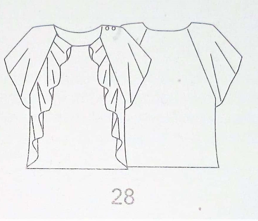 Ce haut est très original avec ses manches raglans papillons et ses volants qui partent de l’encolure pour se terminer à l’ourlet. Il est en taille 38 – 42 – 46.