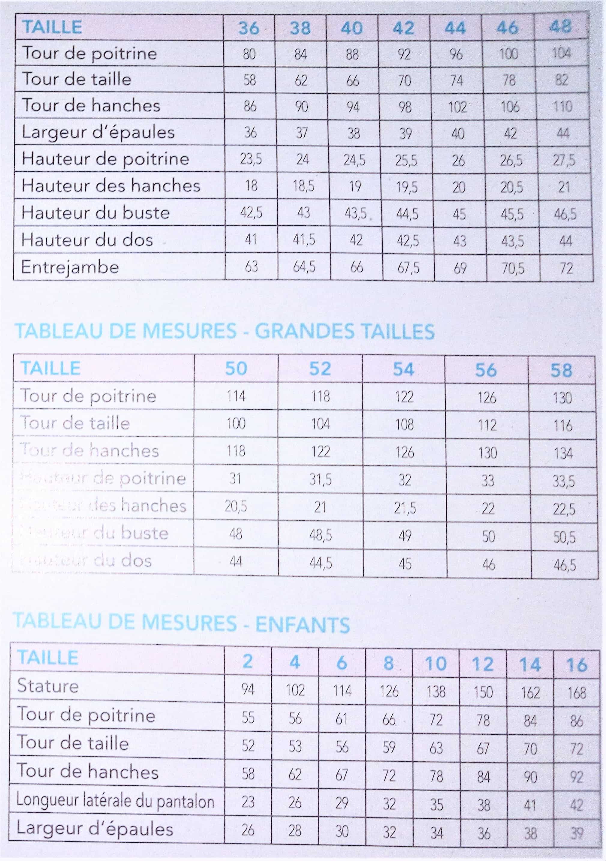 Le tableau des tailles