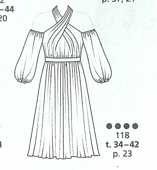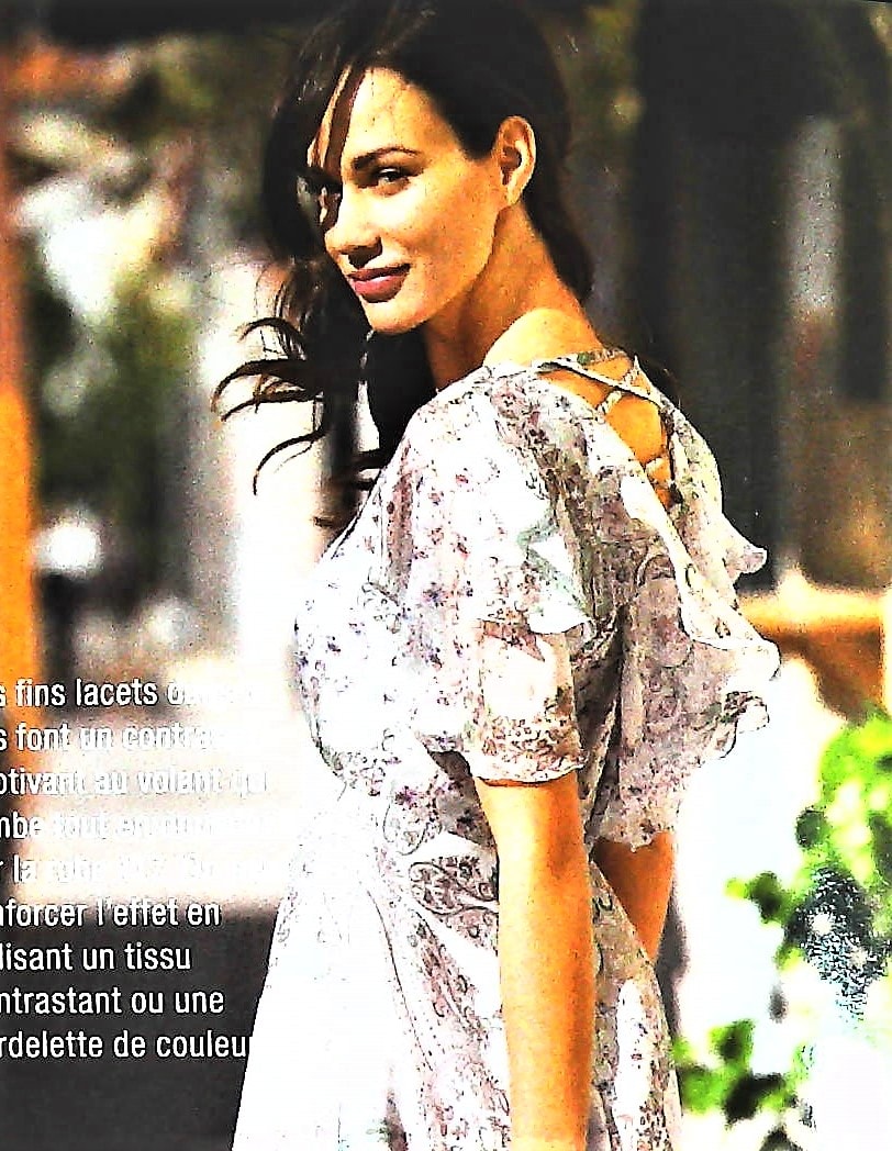 Celle ci est délicate, toute en fluidité, avec ses manches papillons, sa forme empire, sa jupe est ample et virevoltera au gré de nos pas.l’encolure devant est en V tout comme le dos mais la surprise réside dans le laçage et le volant qui le borde. Elle va de la taille 36 au 44.