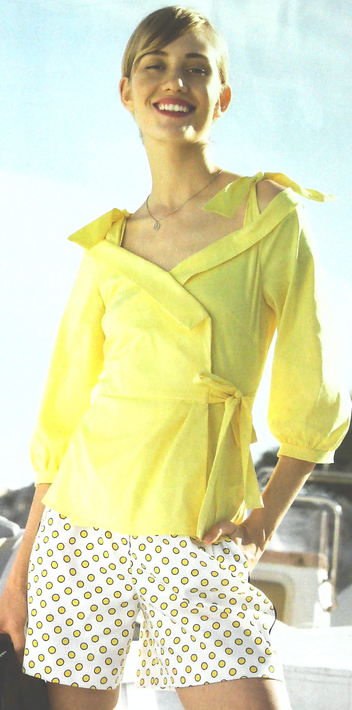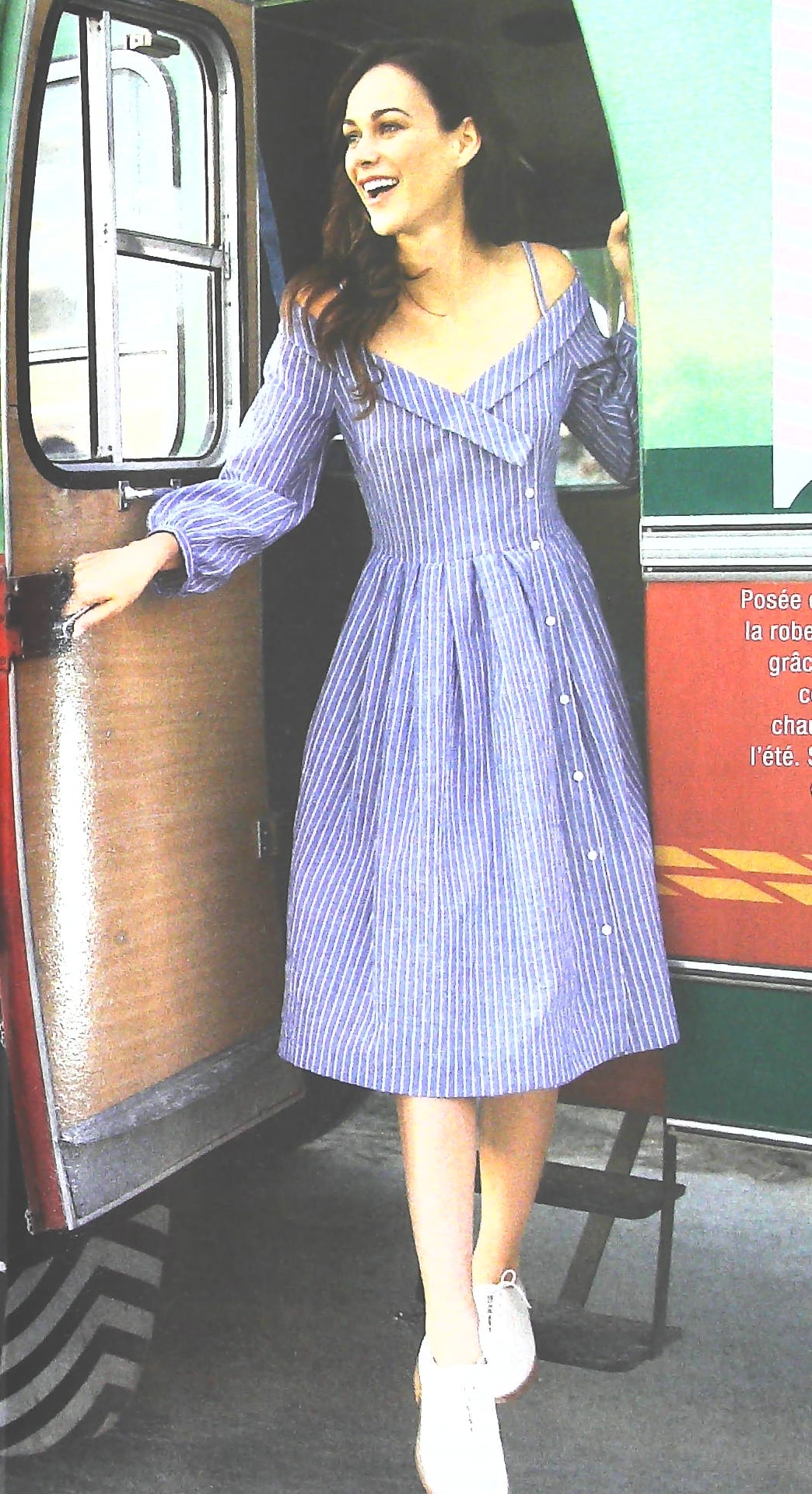 Que pensez vous de cette robe chemisier aux épaules nues, l’encolure en V profond est bordé d’un petit revers. Elle est boutonnée sur toute sa longueur. En version robe, le bas est orné d’une série de plis couchés qui donne de l’ampleur à la jupe.Les manches sont trois quart, et sont terminées froncées par une bande de poignet. Ils vont du 36 au 44.
