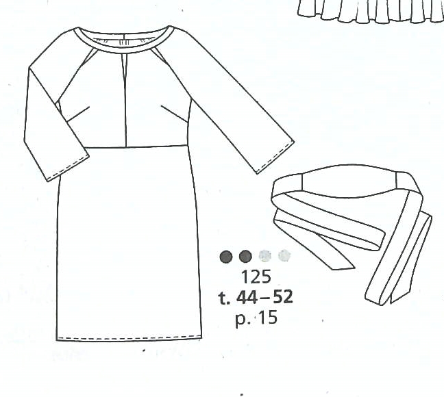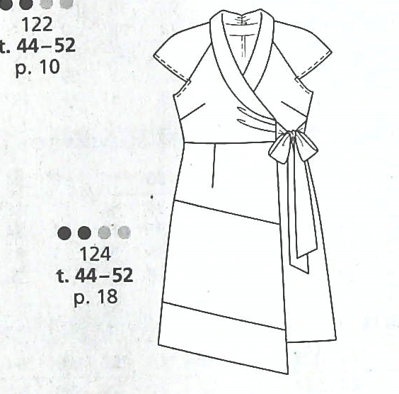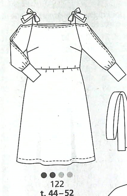 Encore une robe, ses bretelles sont nouées ce qui permet de jouer avec la profondeur du décolleté. Les épaules sont dégagées et les manches à poignets sont fendues sur leur longueur. La taille est marquée à l’aide d’une ceinture à nouer. Elle va de la taille 44 au 52.
