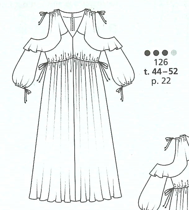 Le charme des années 70 se retrouve complètement dans cette robe. Elle semble flotter autour de la silhouette. Elle possède un grand décolleté en V. La couture d’épaule est froncée à l’aide d’un lien sous coulisse qui rajoute encore de la légèreté. Les Manches sont ouvertes et bordées d’un grand volant de l’épaule jusqu’au dessus du coude. Le corps de la robe est de forme empire. Elle est superbe dans la version courte comme plus longue.Elle va du 44 au 52.