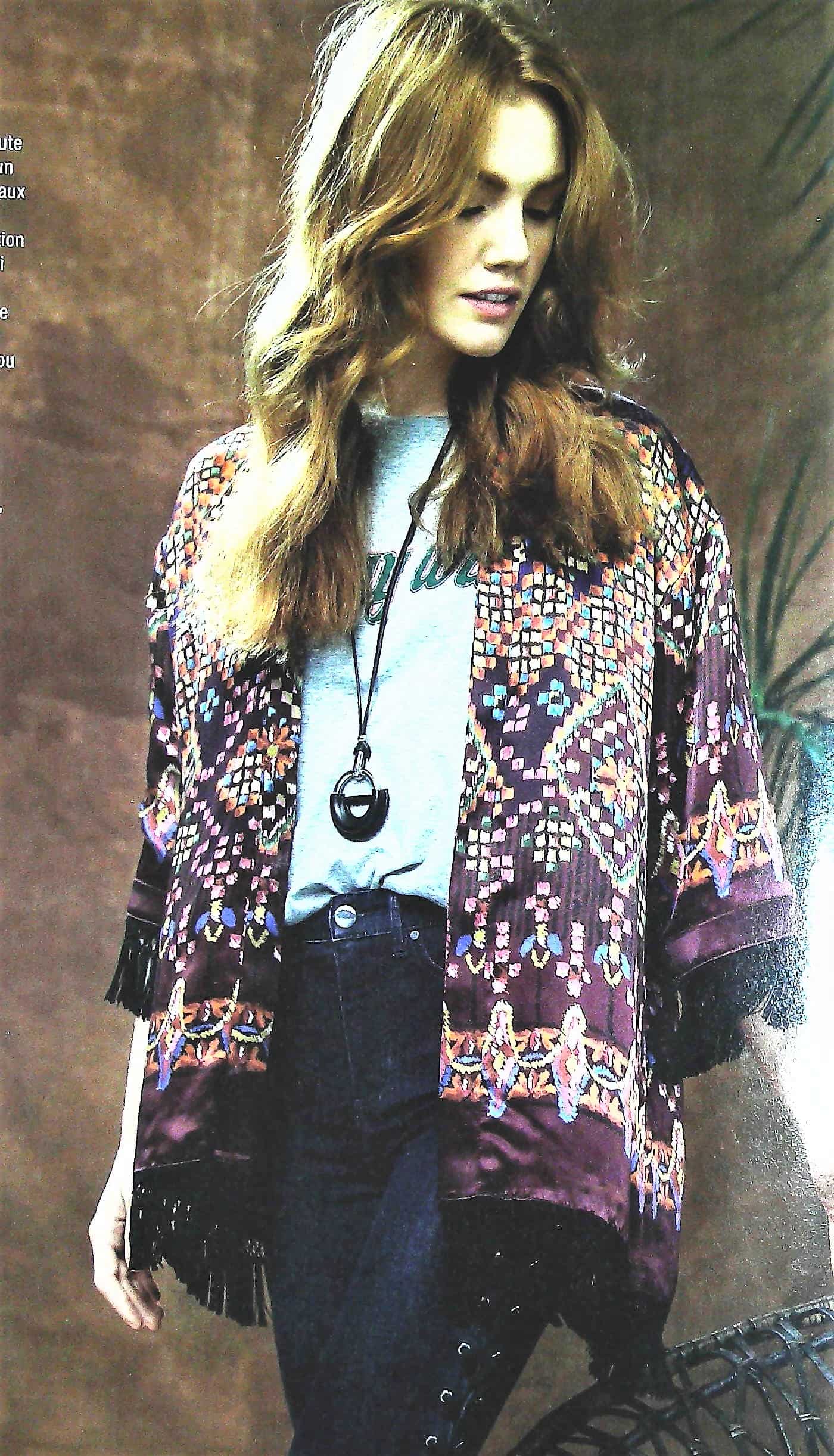 J’aime beaucoup celle ci, un peu moins le tissus choisi. Elle est de forme porte feuille, ornée d’un col Châle, avec des mancherons raglans. Le panneau asymétrique est ornée de découpes, c’est idéal pour jouer avec les couleurs et les matières. Elle va de la taille 44 au 52.