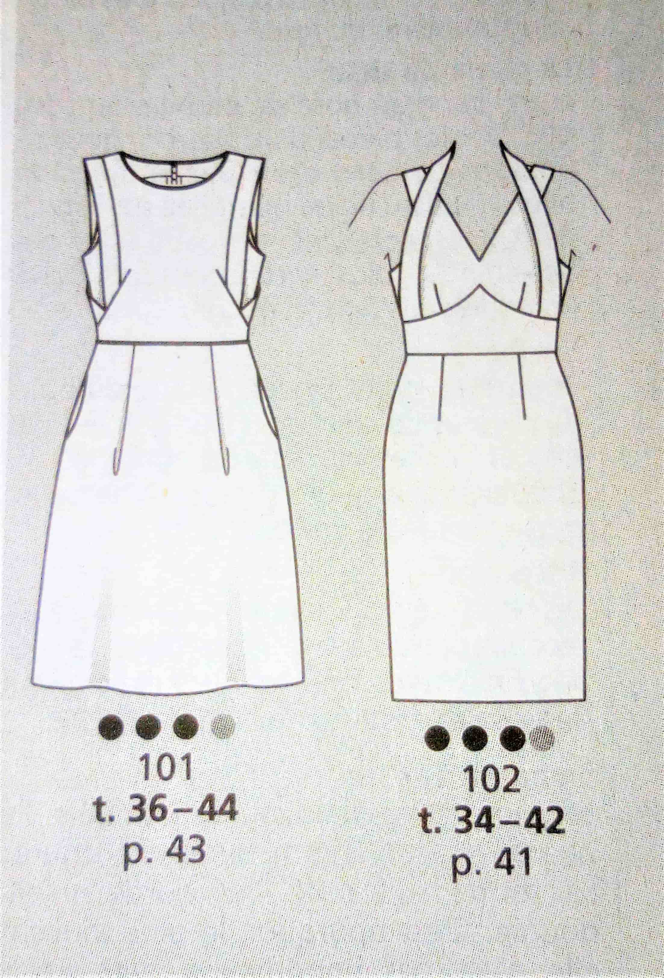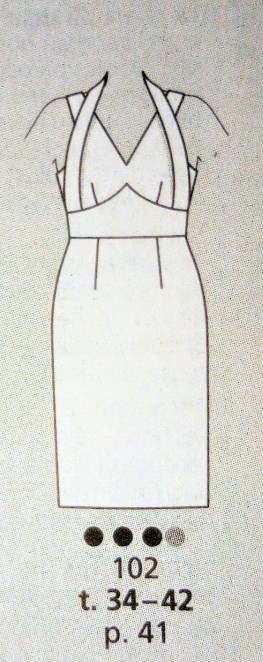 L’originalité de cette robe réside dans son buste. Un bustier à emmanchures américaines, avec deux larges bretelles. L’empiècement de taille se termine en pointe pour mettre l’accent sur le bustier. La robe va de la taille 34 au 42.