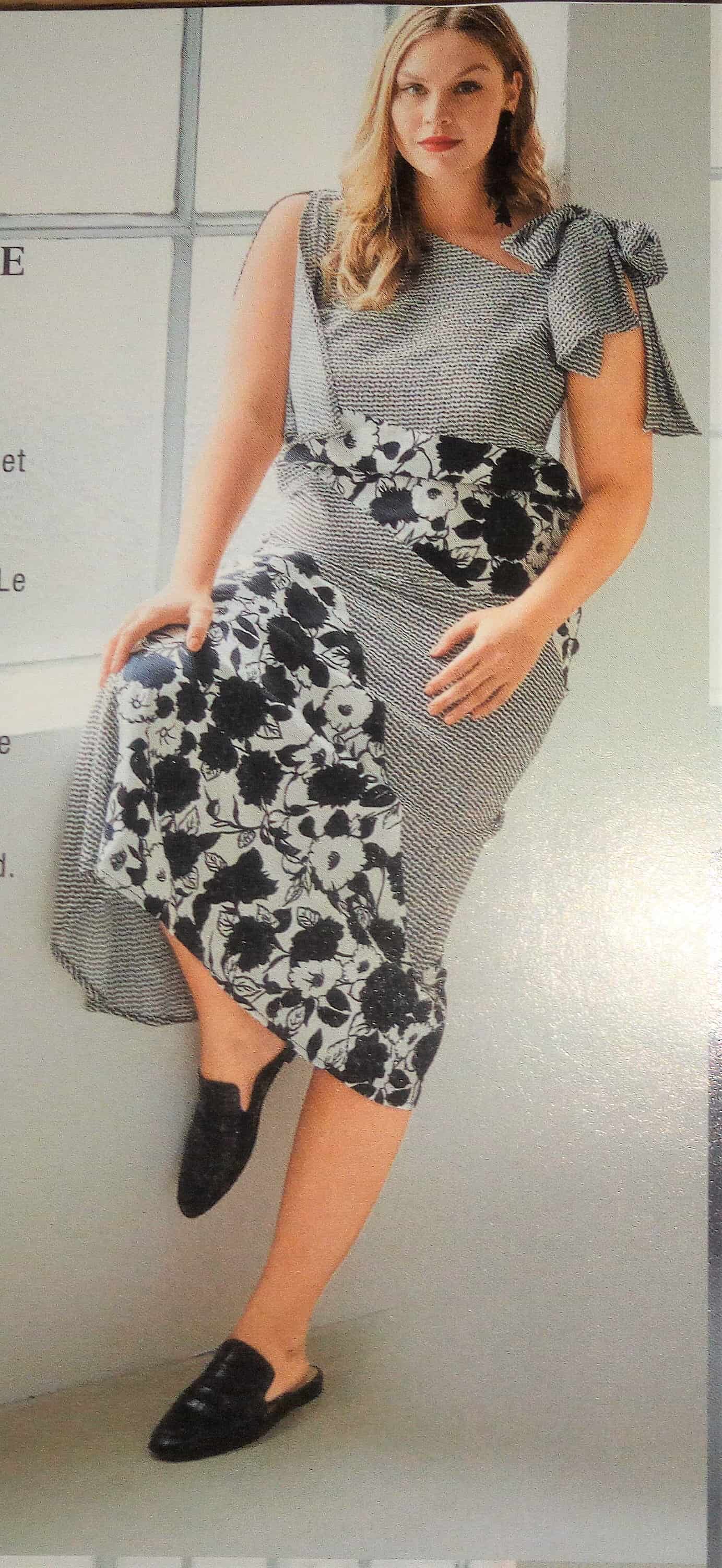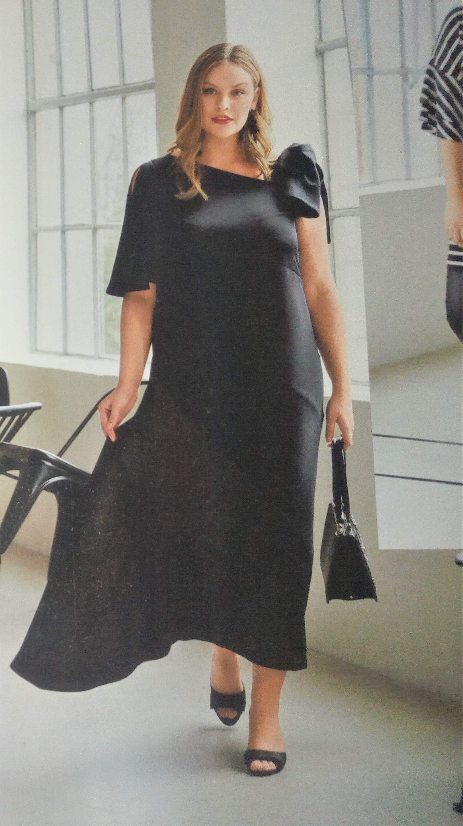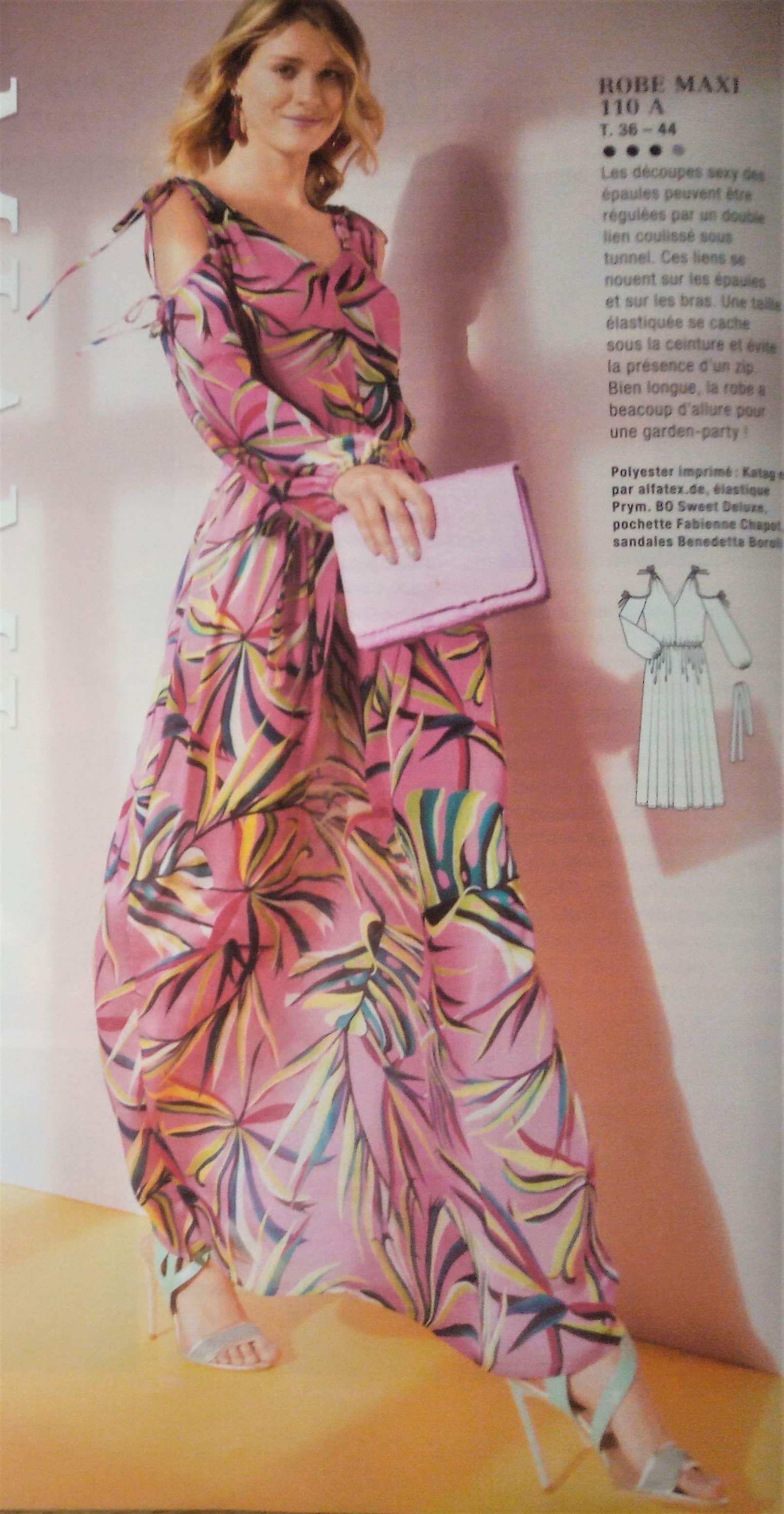 J’adore cette robe longue avec son décolleté asymétrique. Il possède une manche papillon d’un côté et de l’autre une large bretelle à nouer. Son originalité est accentuée par le mix de tissus imprimés. La jupe est droite avec un godet sur le côté. Elle va de la taille 44 au 52.