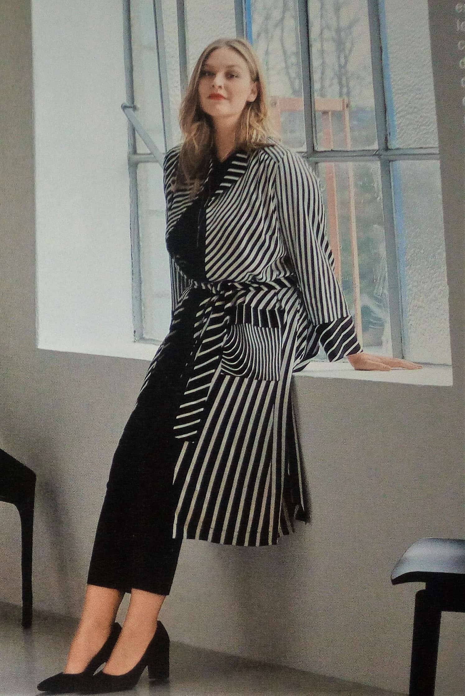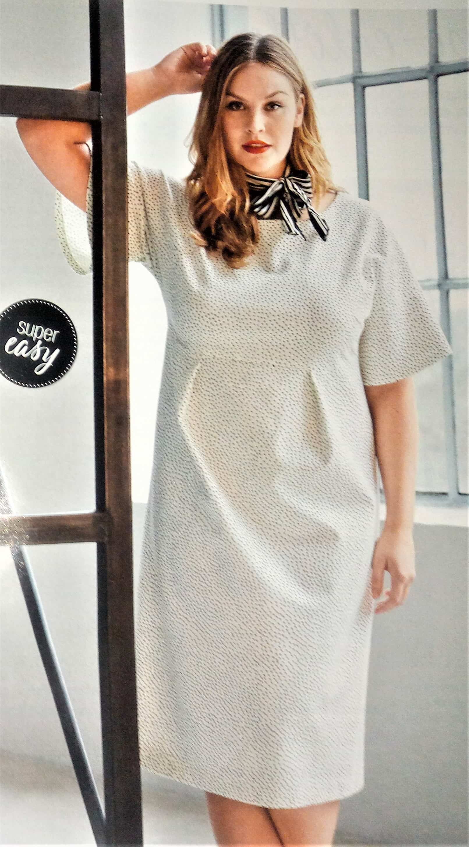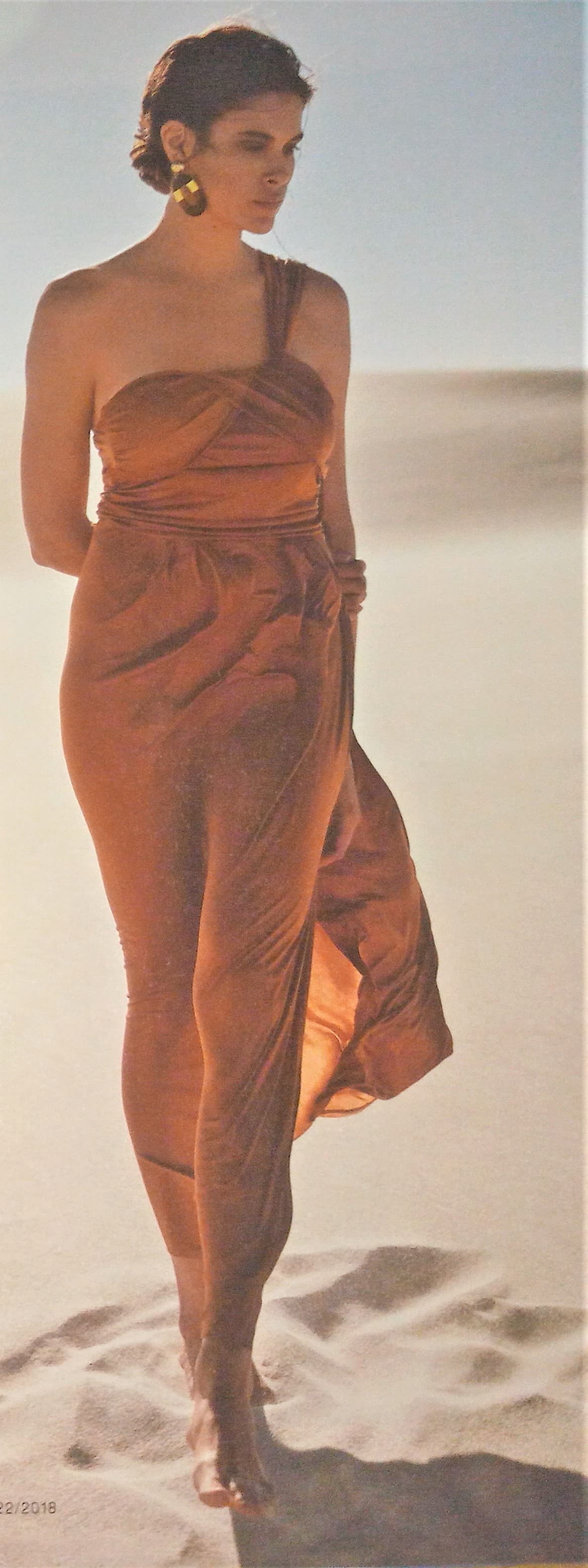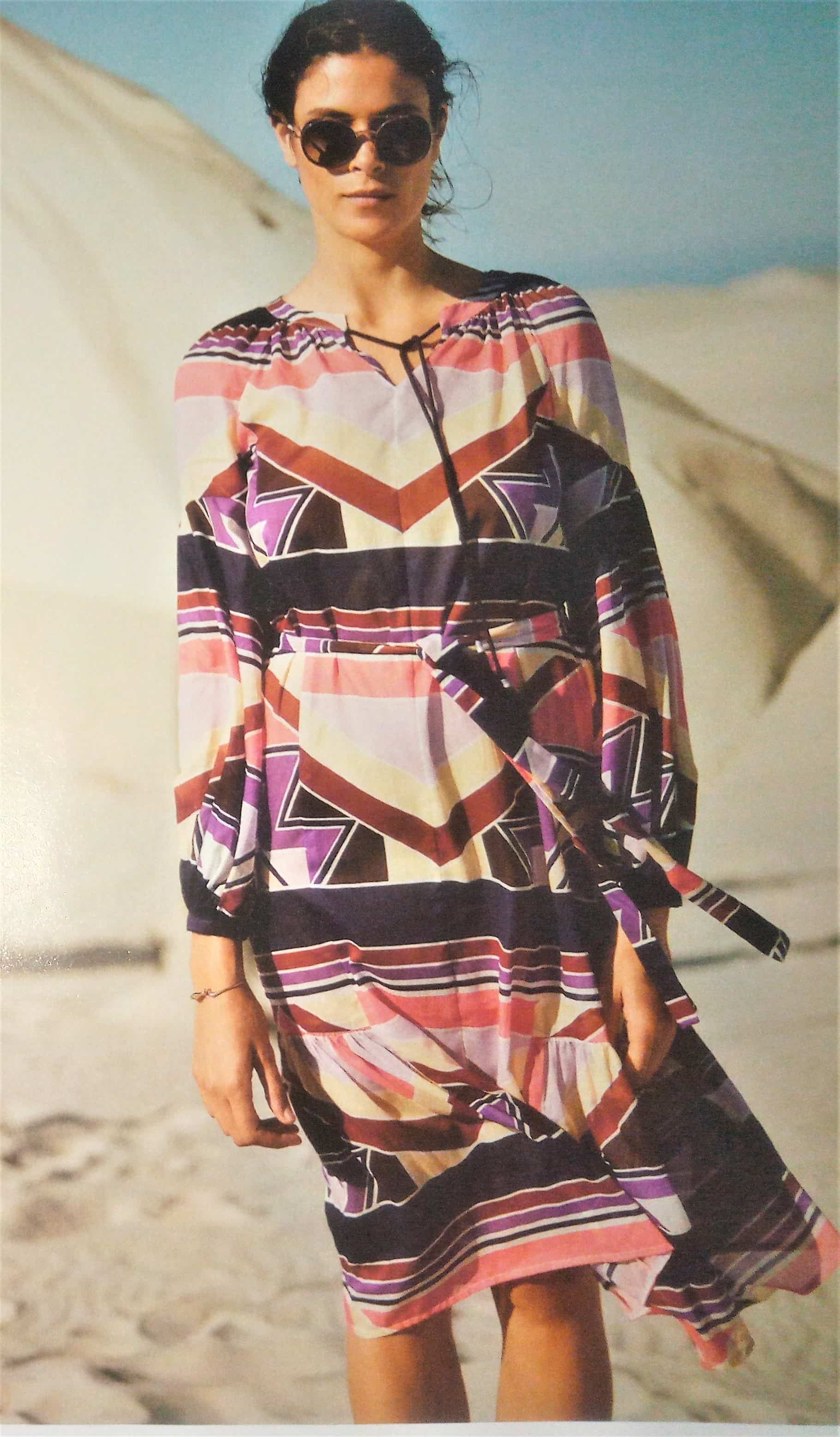 J’adore cette robe longue avec son décolleté asymétrique. Il possède une manche papillon d’un côté et de l’autre une large bretelle à nouer. Son originalité est accentuée par le mix de tissus imprimés. La jupe est droite avec un godet sur le côté. Elle va de la taille 44 au 52.