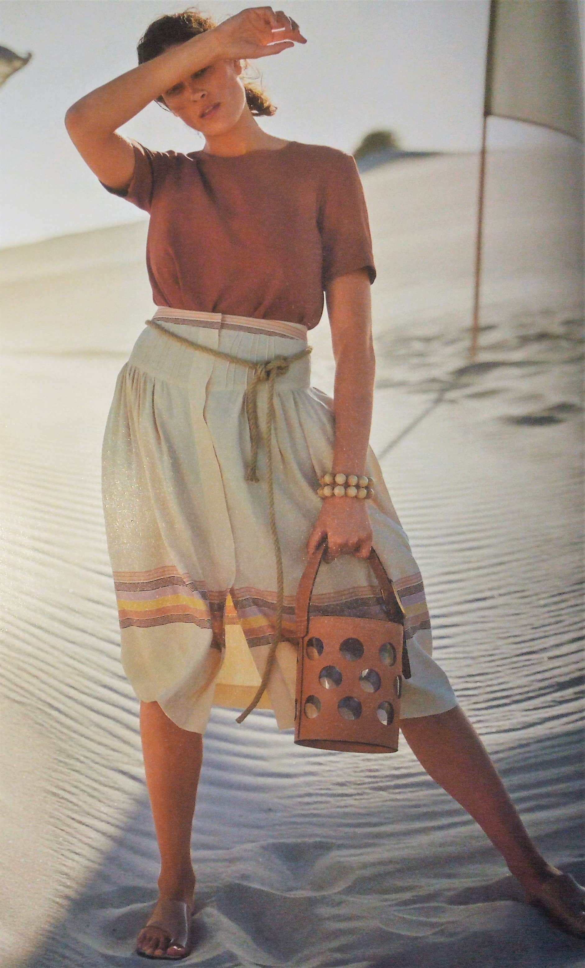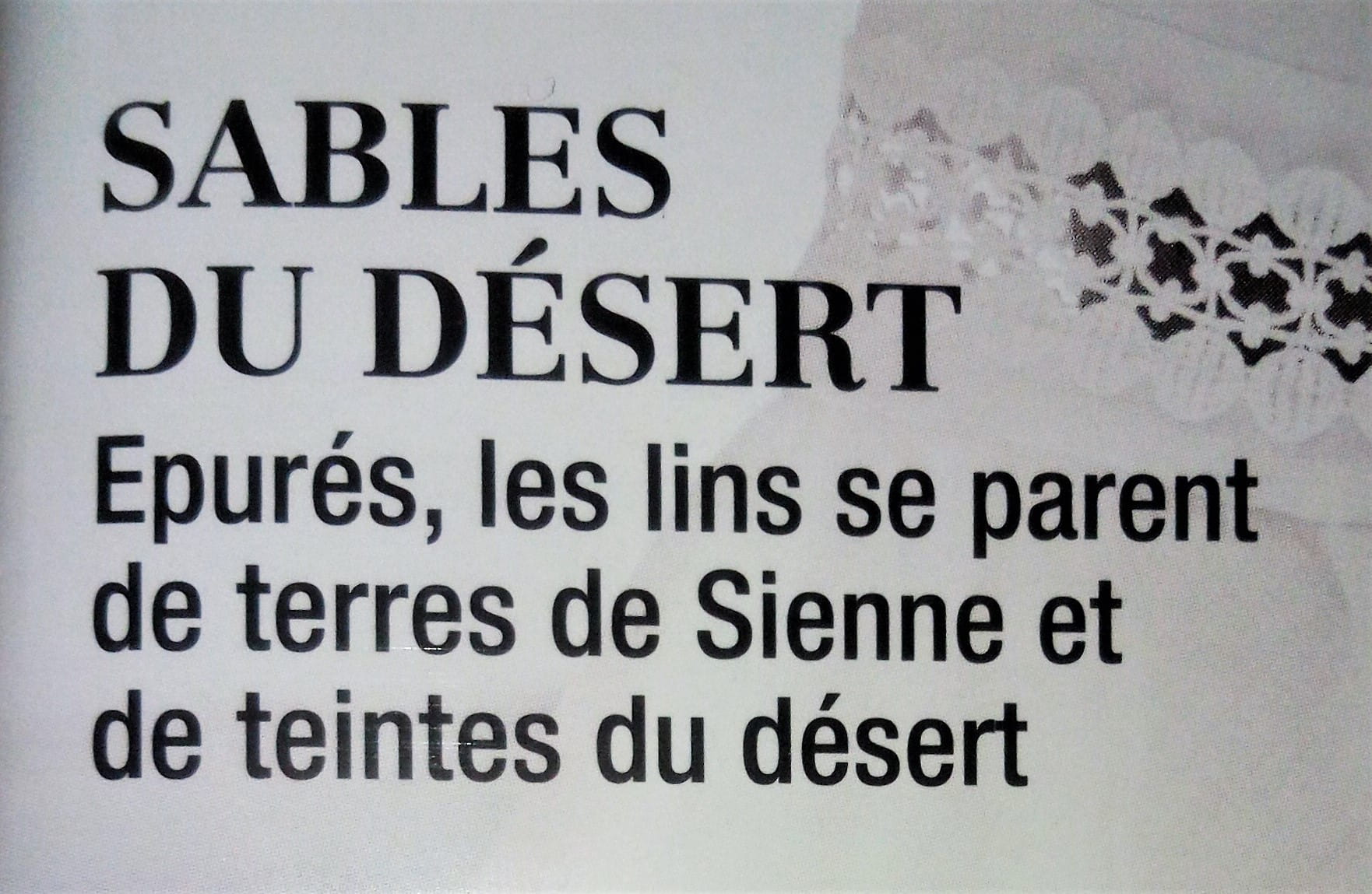Nous trouverons une mode inspirée du désert, tant par ses coloris que ses formes. Des coupes flottantes, épurées et sobres mais aussi du lin, du coton se pareront de teintes comme le terre de sienne, et du désert. Ces couleurs mettront en valeur votre peau hâlée par le soleil.
