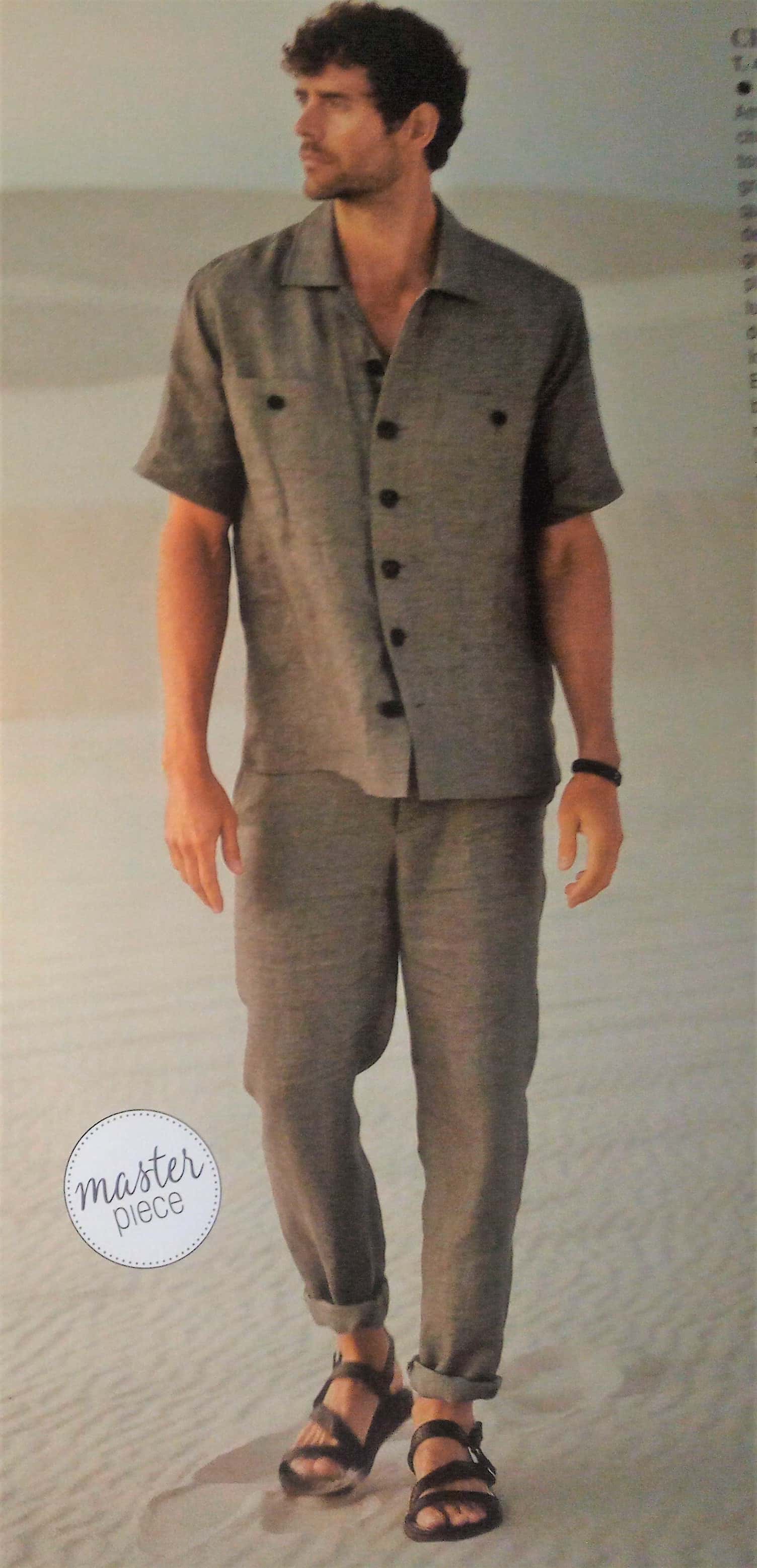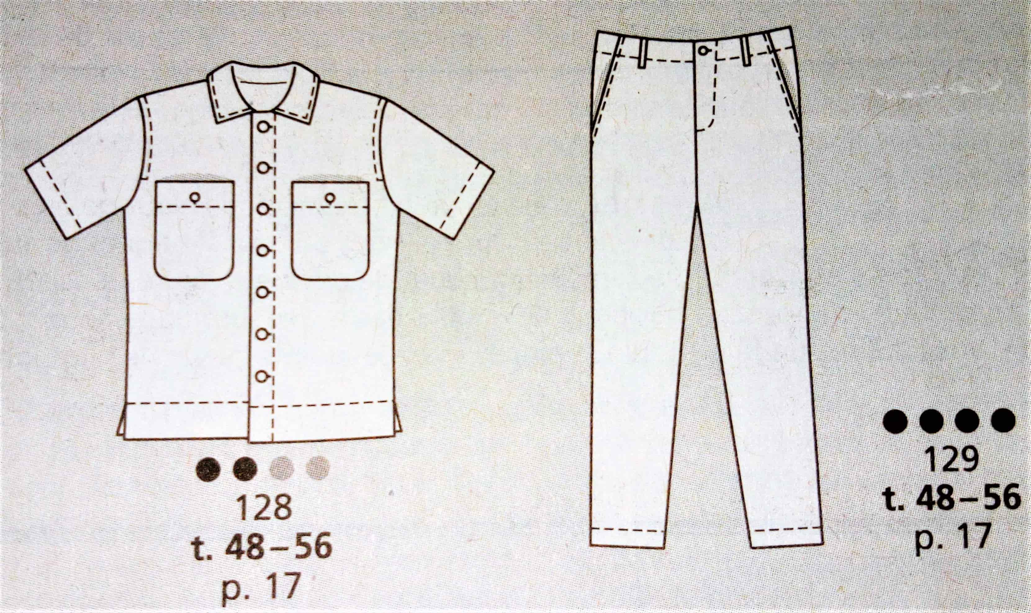 Les derniers de mon top sont deux vêtements hommes, une chemise à manches courtes. Avec deux grandes poches plaquées. Le pantalon est coupé comme un jean , avec une braguette boutonnée et des poches italiennes surpiquées. Ils vont tous les deux du 48 au 56.