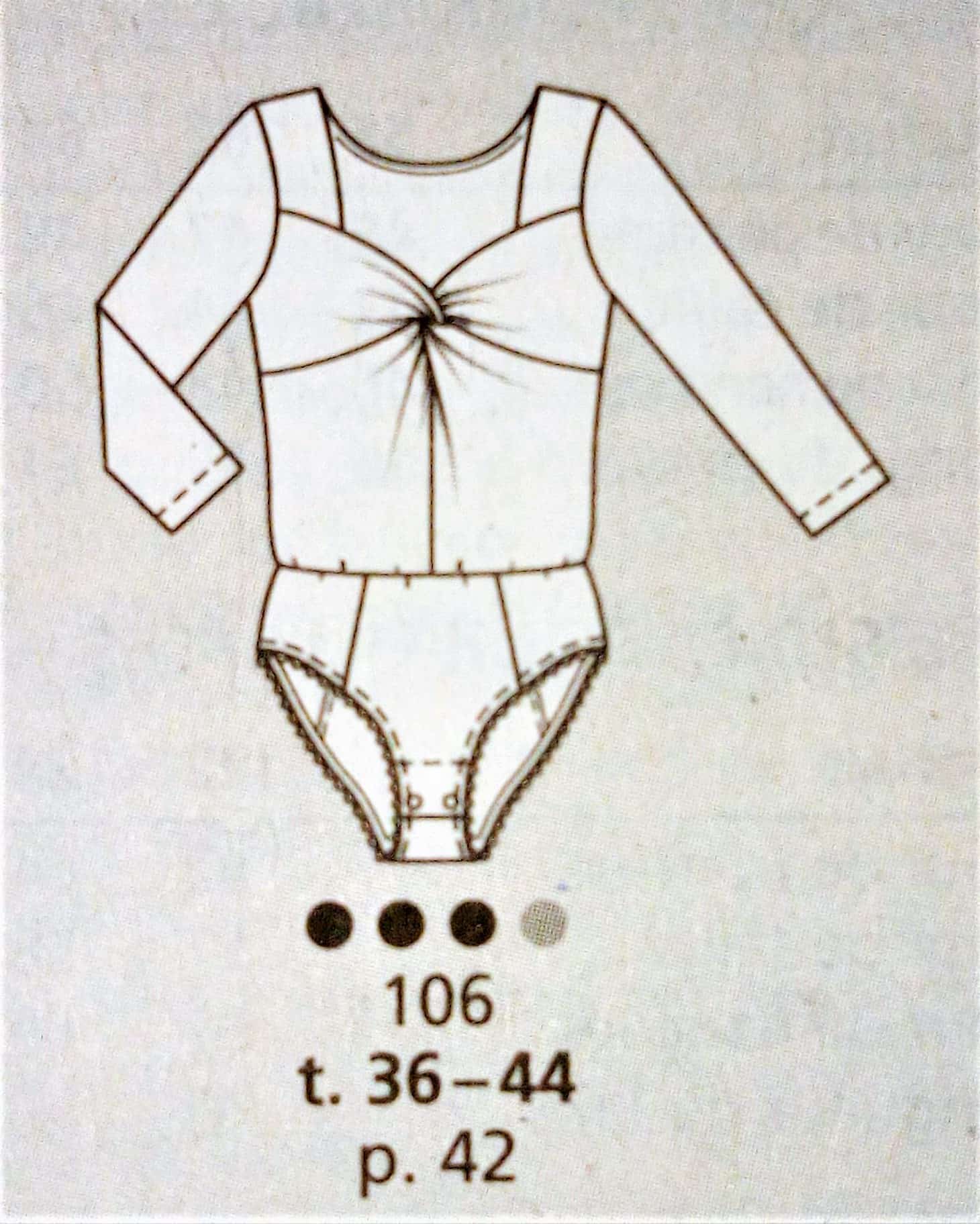 Ce body est ravissant, avec son nœud drapé à la poitrine sur le décolleté coeur. Les manches sont trois quart. La culotte est pressionnée à l’entrejambe. Il va de la taille 36 au 44.