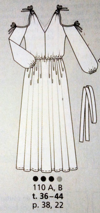 D’inspiration années 70, cette robe est superbe. La profondeur du décolleté peut être modulée par les liens sur les épaules. Les manches longues sont ouvertes pour dévoiler le haut du bras. La taille est élastiquée pour pouvoir se passer d’un zip. Elle va du 36 au 44.