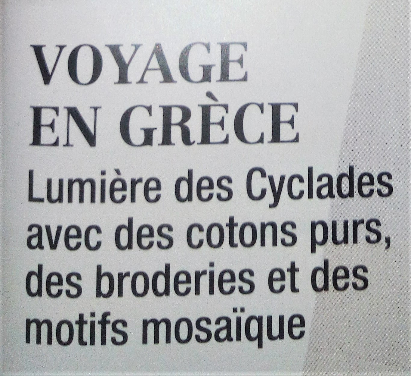 Ici nous trouveront une mode inspirée des Cyclades, avec beaucoup de blanc de broderies colorées, et de motifs mosaïque tels qu’on les trouve dans les maisons typiques.