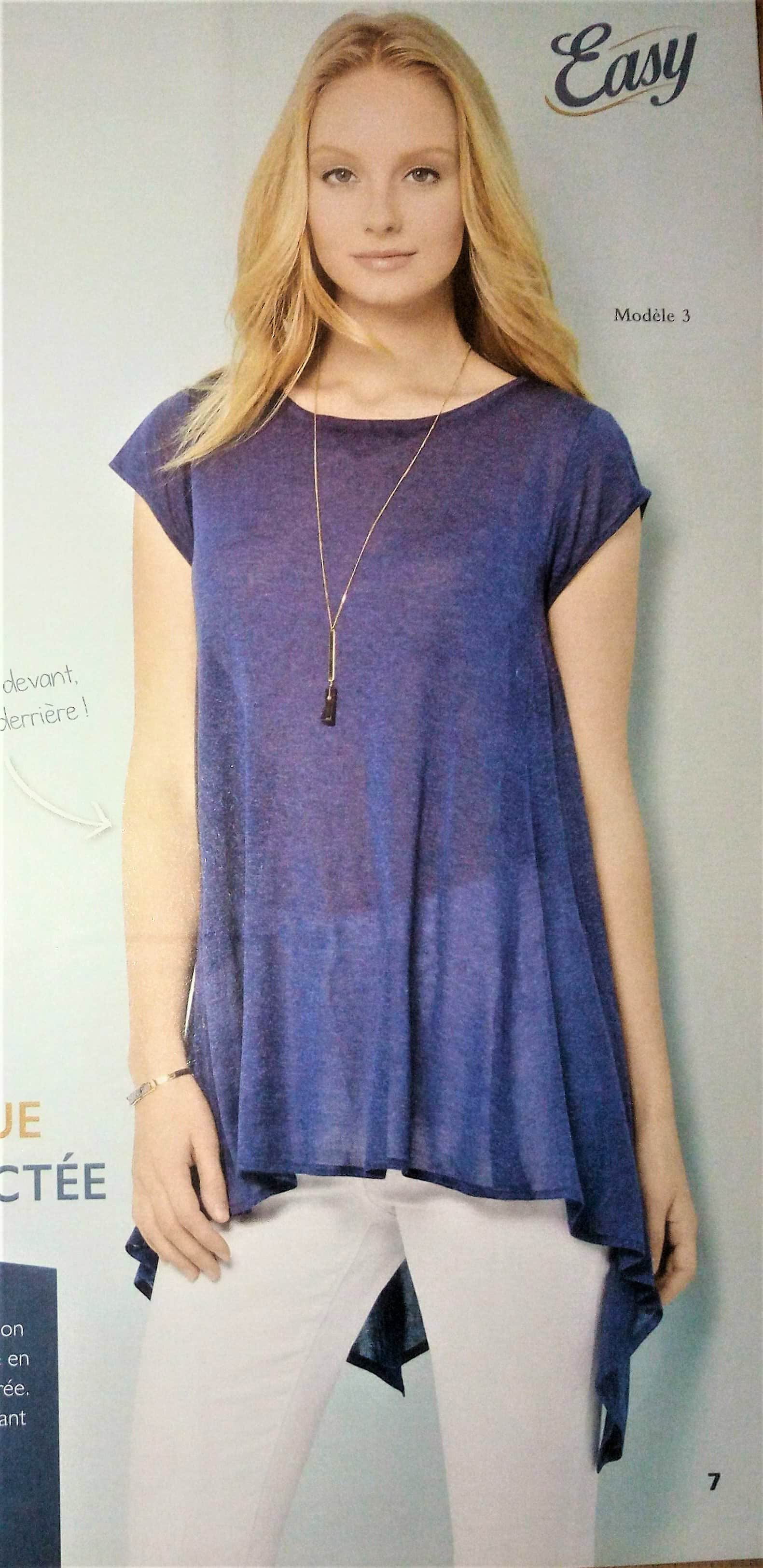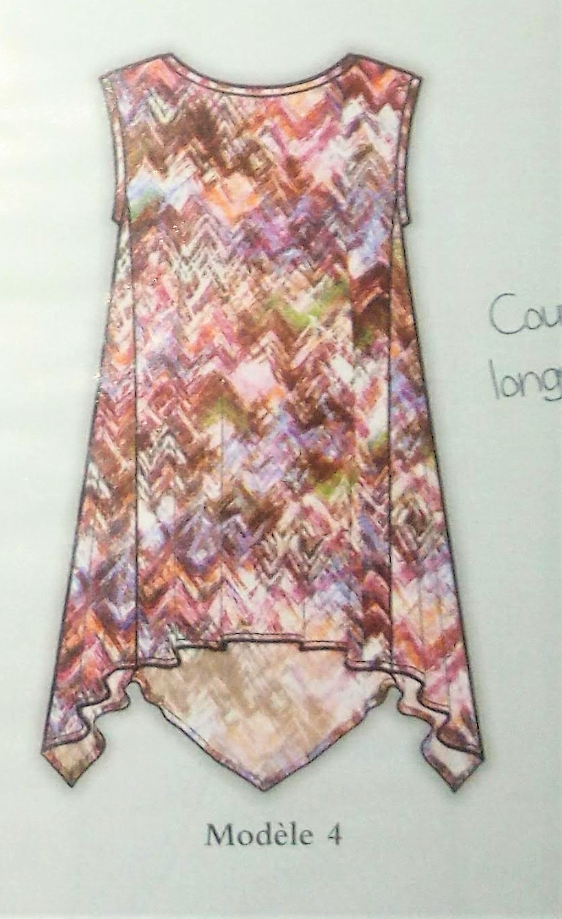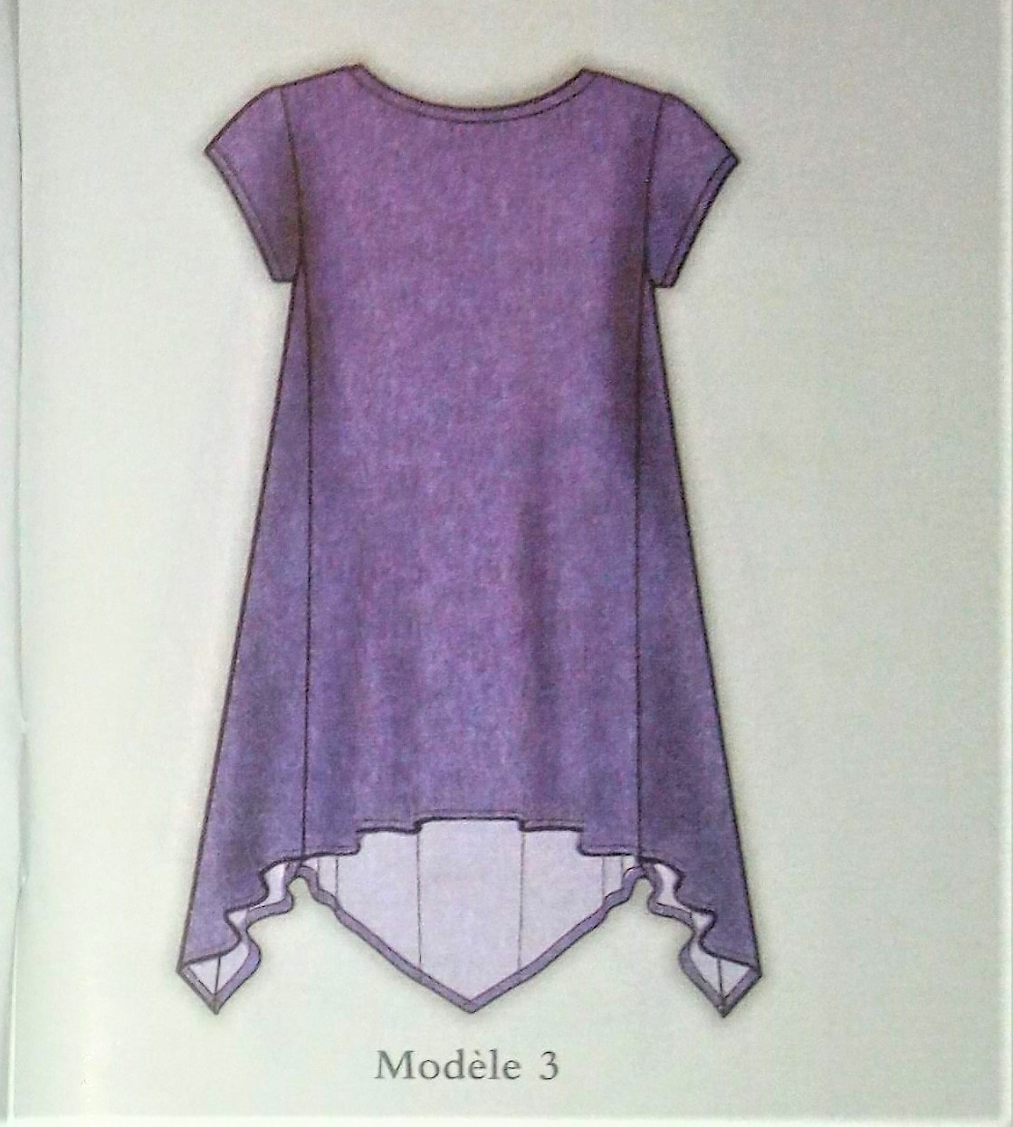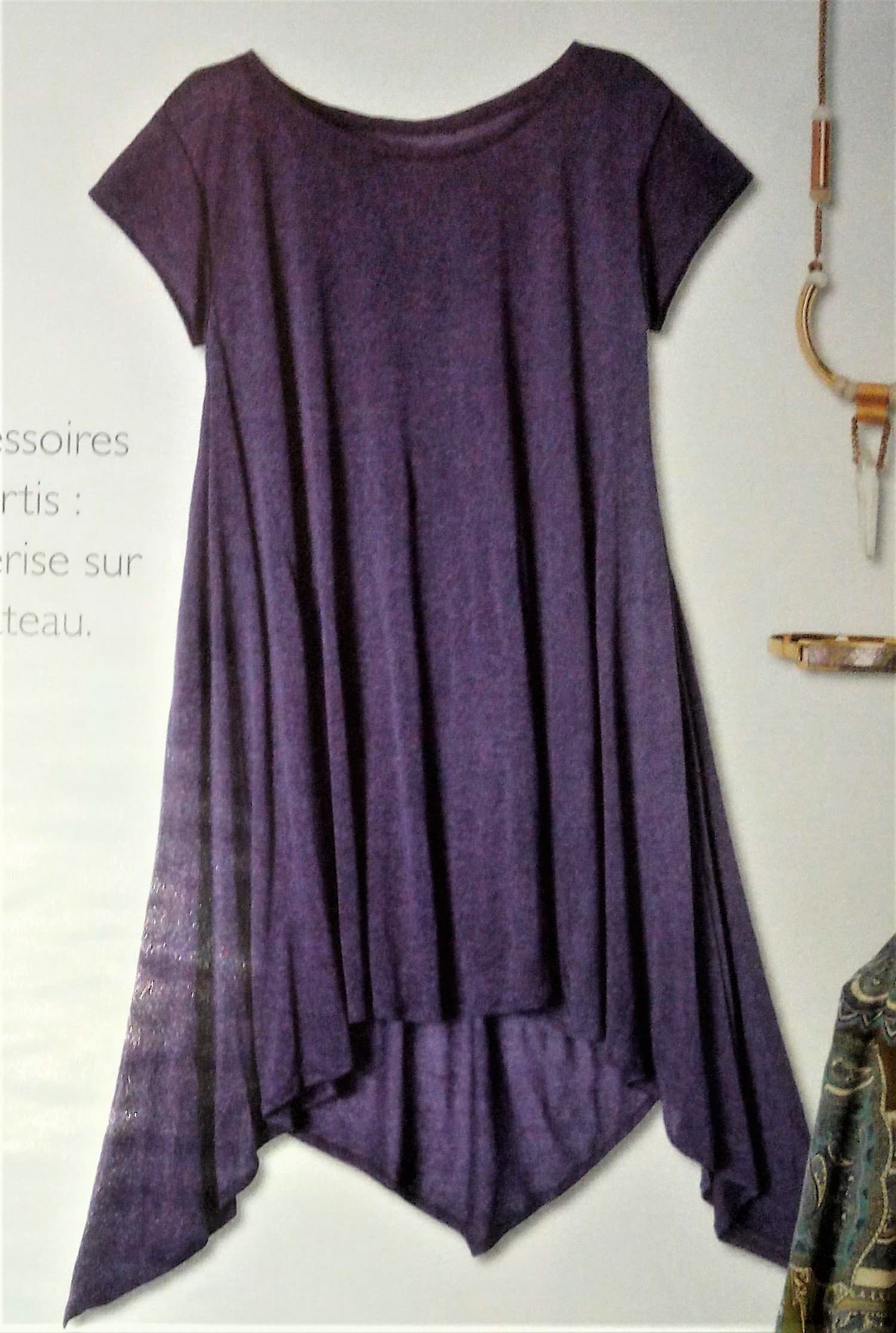 J’adore cette tunique à pans. Elle est plus courte devant que derrière. Elle est superbe que ce soit avec les petits mancherons ou sans manches. L’ourlet et les pans rapportés des côtés se terminent en pointe. Elle est en tailles 36/38 – 40/42 – 44/46.