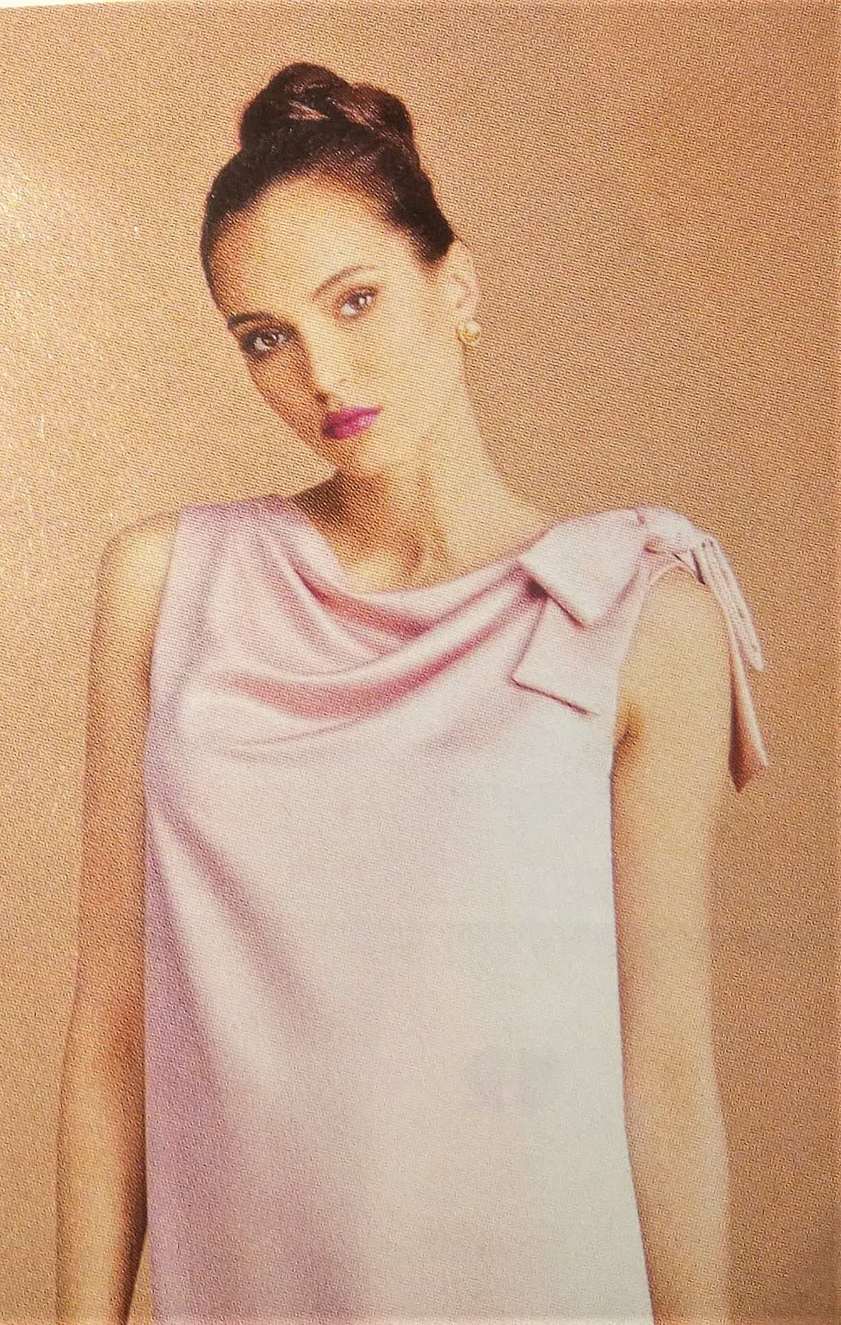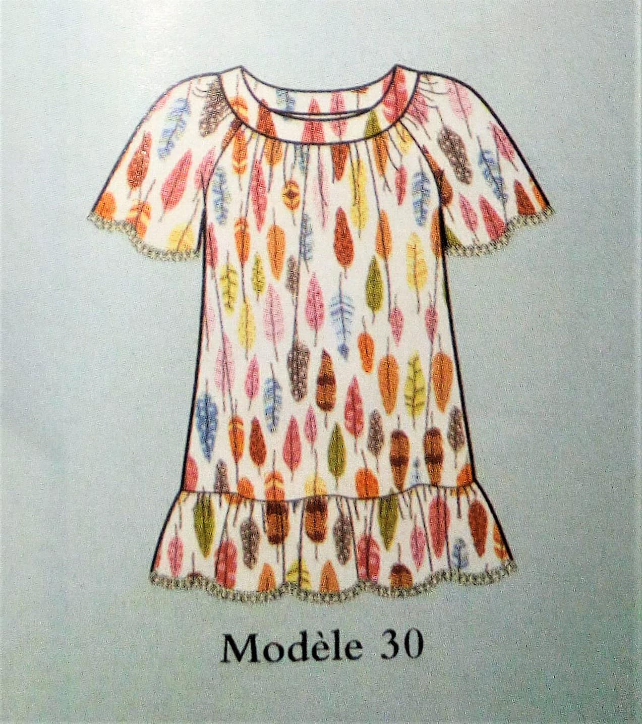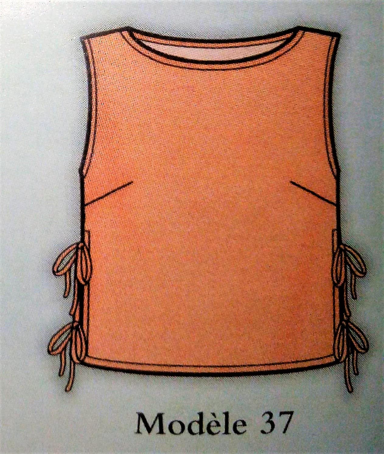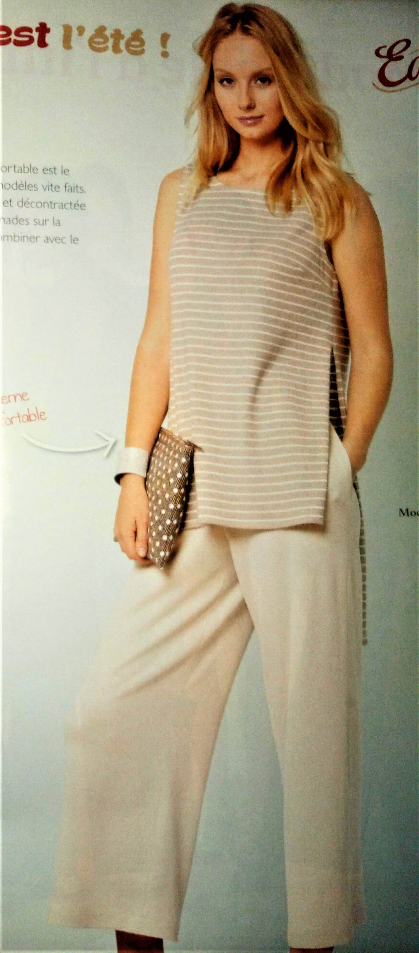 J’adore cette tunique à pans. Elle est plus courte devant que derrière. Elle est superbe que ce soit avec les petits mancherons ou sans manches. L’ourlet et les pans rapportés des côtés se terminent en pointe. Elle est en tailles 36/38 – 40/42 – 44/46.