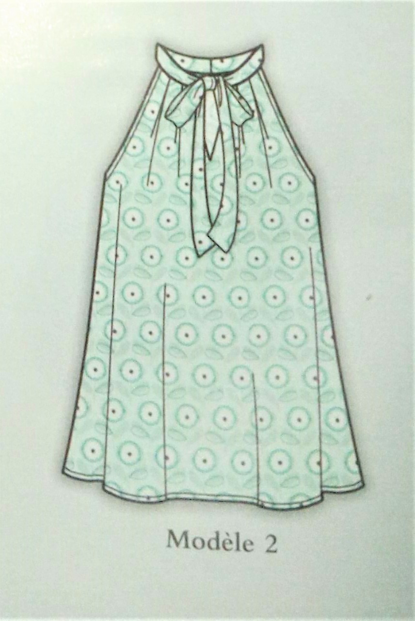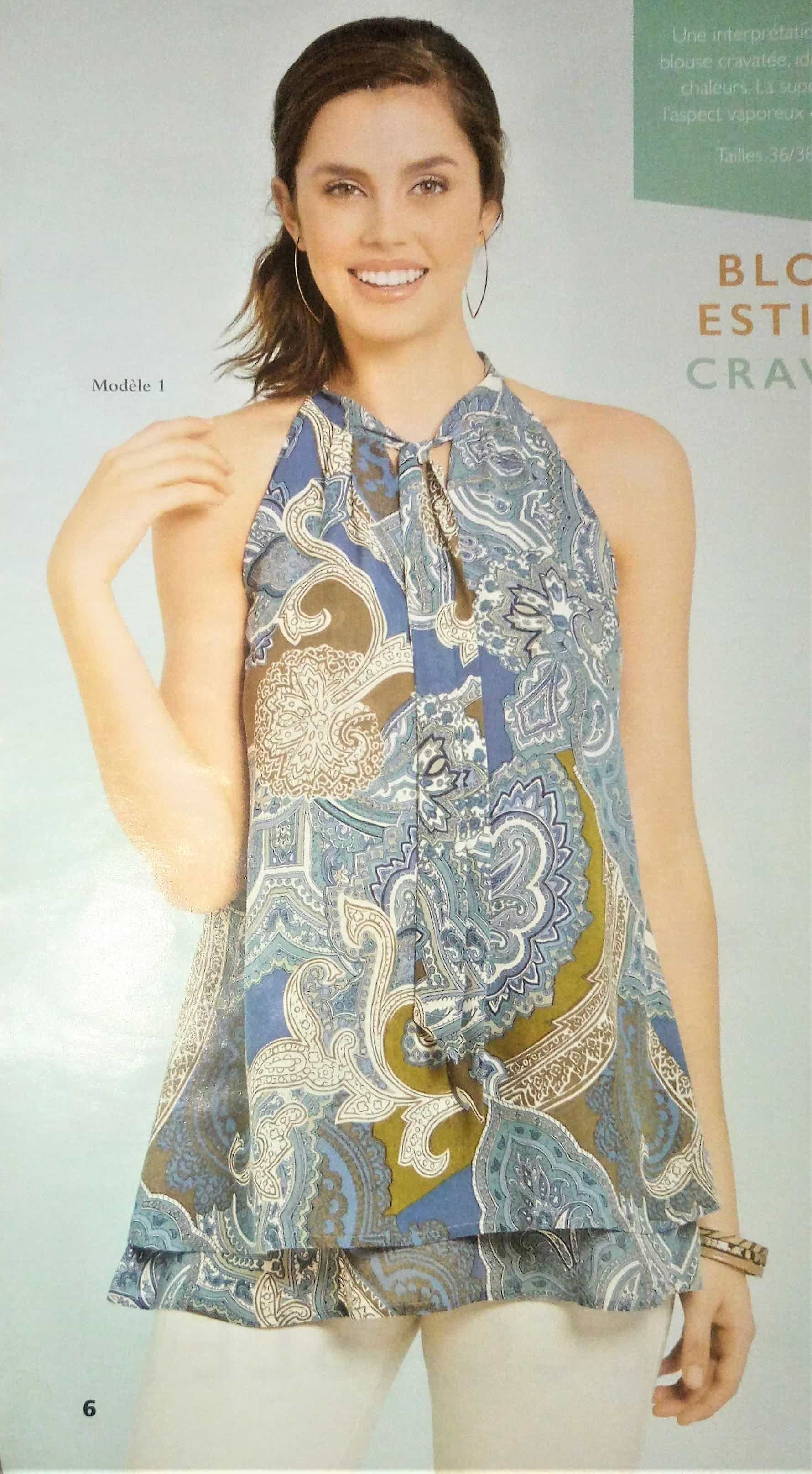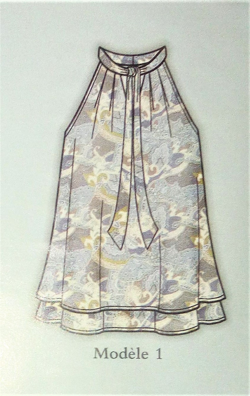 J’aime beaucoup cette blouse à lavallière. Les épaules sont dégagées. Ce haut est évasé pour lui donner un côté aérien, souligné par l’effet de superposition.Des petits plis partent du col. Le décolleté est en V. Il est en tailles 36/38 – 40/42 – 44/46.