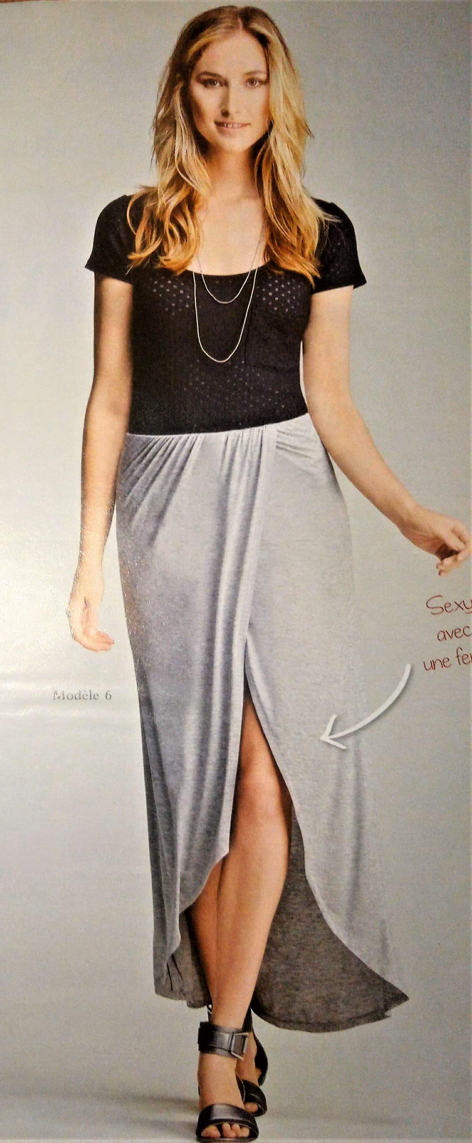 J’aime beaucoup cette jupe aussi. Elle est de forme portefeuille plus longue dans le dos que sur le devant. Le côté sexy est accentué par la fente du devant. La jupe est réalisée en jersey/ Elle est en taille 40/42, 44/46 ,48/50.