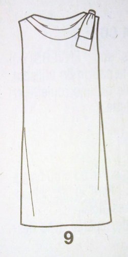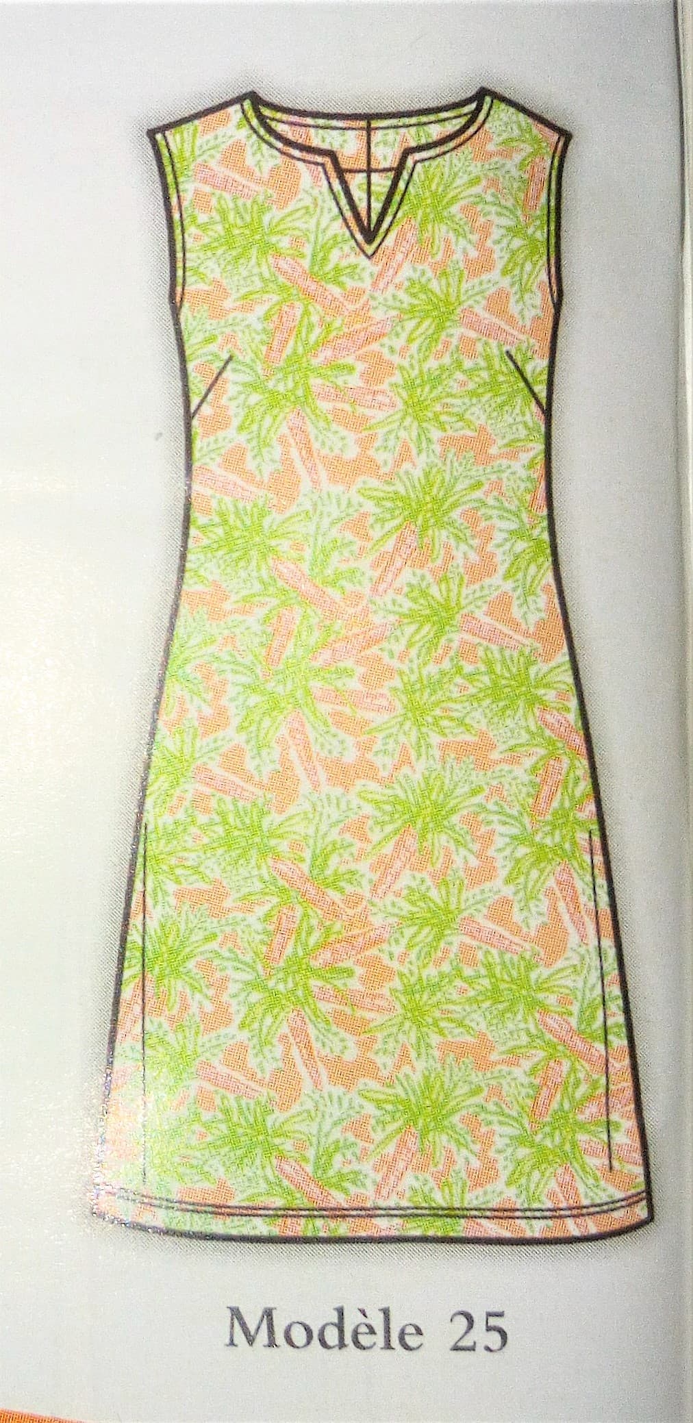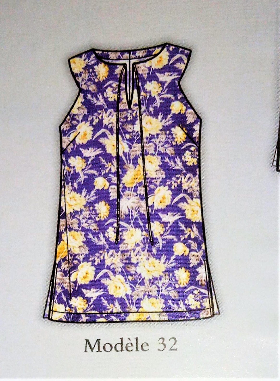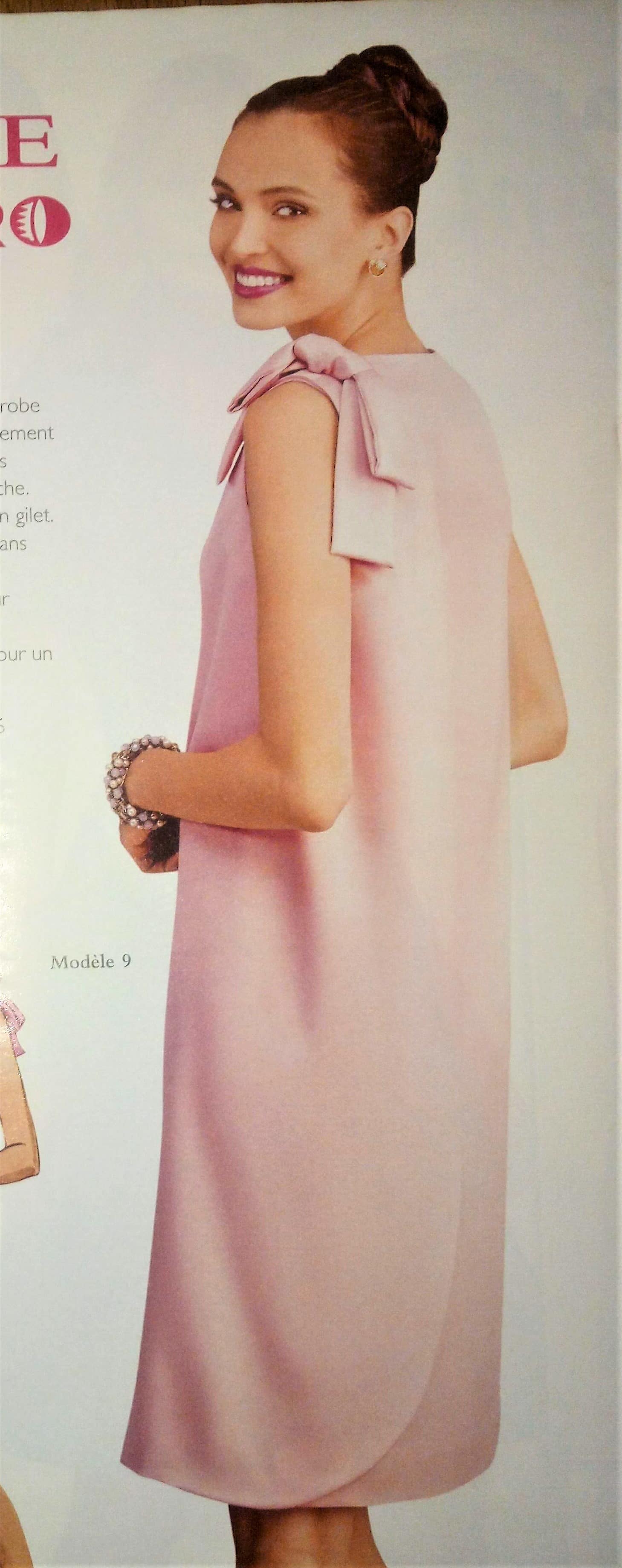 Voici une robe rétro remise au goût du jour. Elle s’enfile comme un gilet et le pan du devant passe sur le bras pour être boutonné sur l’épaule. Elle est sans manche et l’encolure bateau du devant est légèrement drapée. Les tailles sont 36/38 – 40/42 – 44/46.