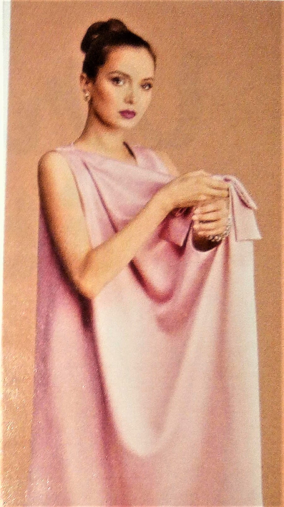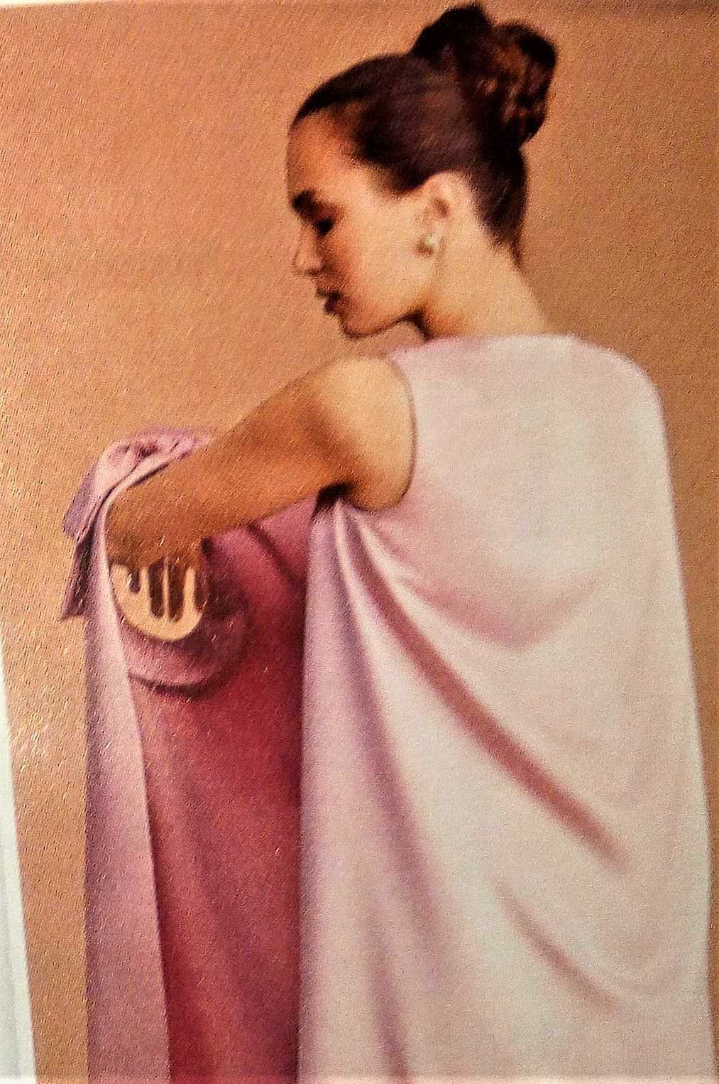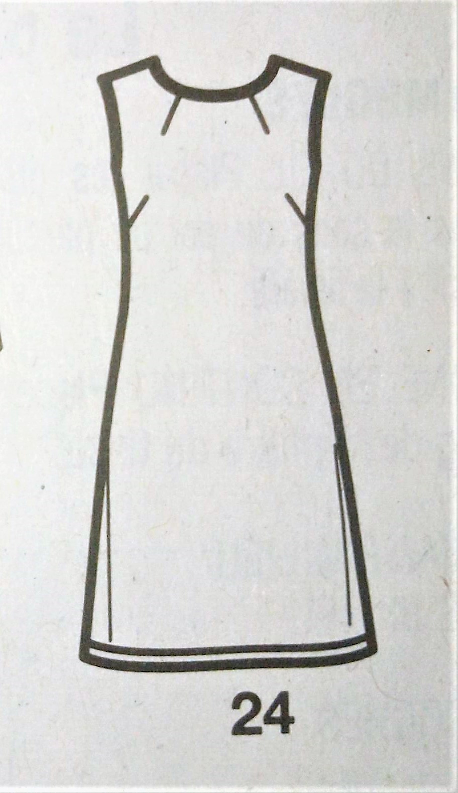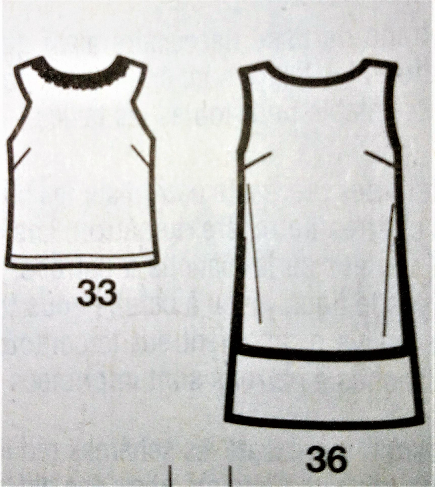Voici une robe rétro remise au goût du jour. Elle s’enfile comme un gilet et le pan du devant passe sur le bras pour être boutonné sur l’épaule. Elle est sans manche et l’encolure bateau du devant est légèrement drapée. Les tailles sont 36/38 – 40/42 – 44/46.