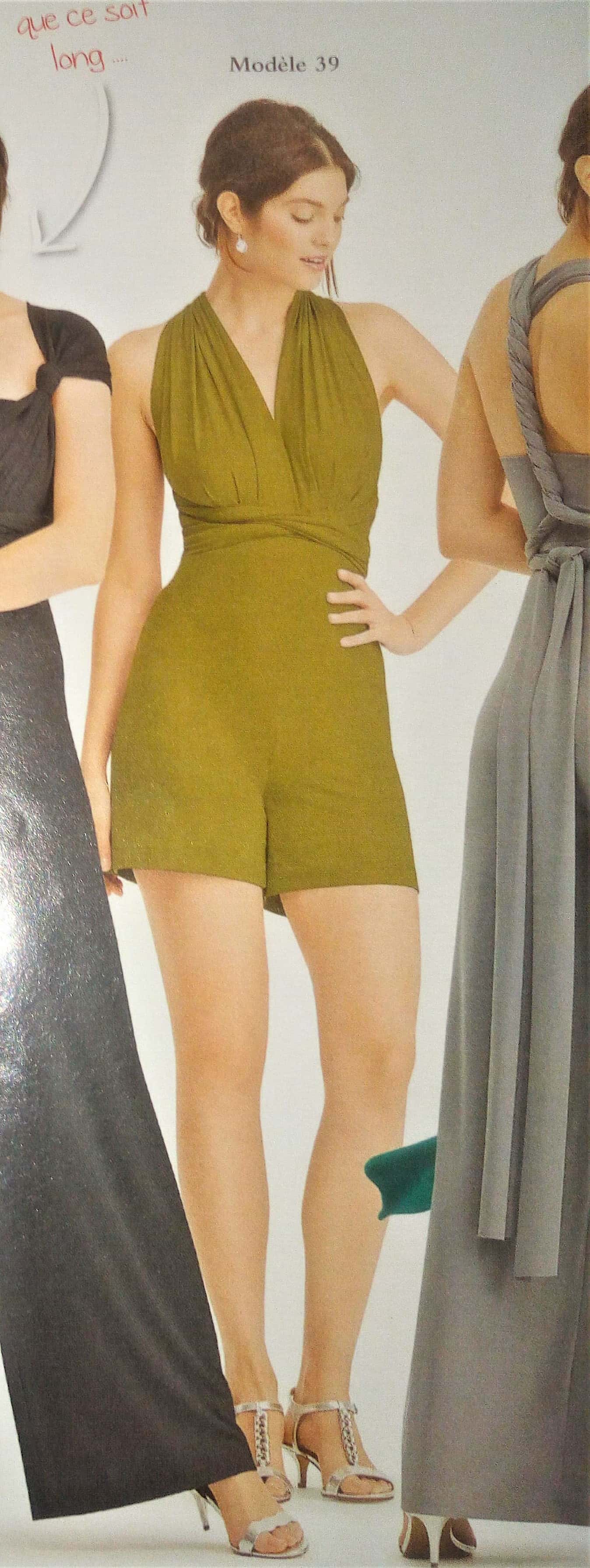 Vous connaissiez la robe infinie? Voici la combinaison short ou pantalon. On peut nouer le haut de multiples façons. Sage ou sexy à vous de choisir. Elle est en taille S – M – L.