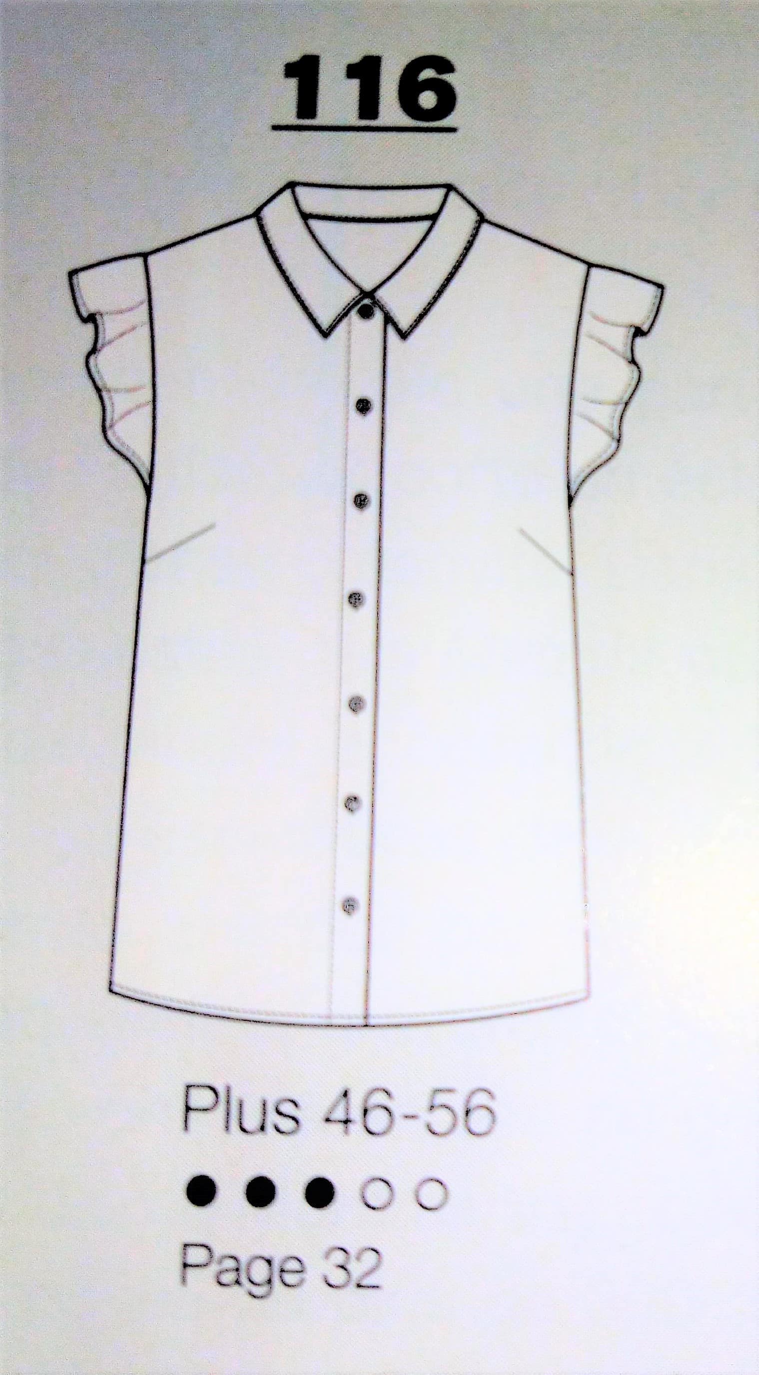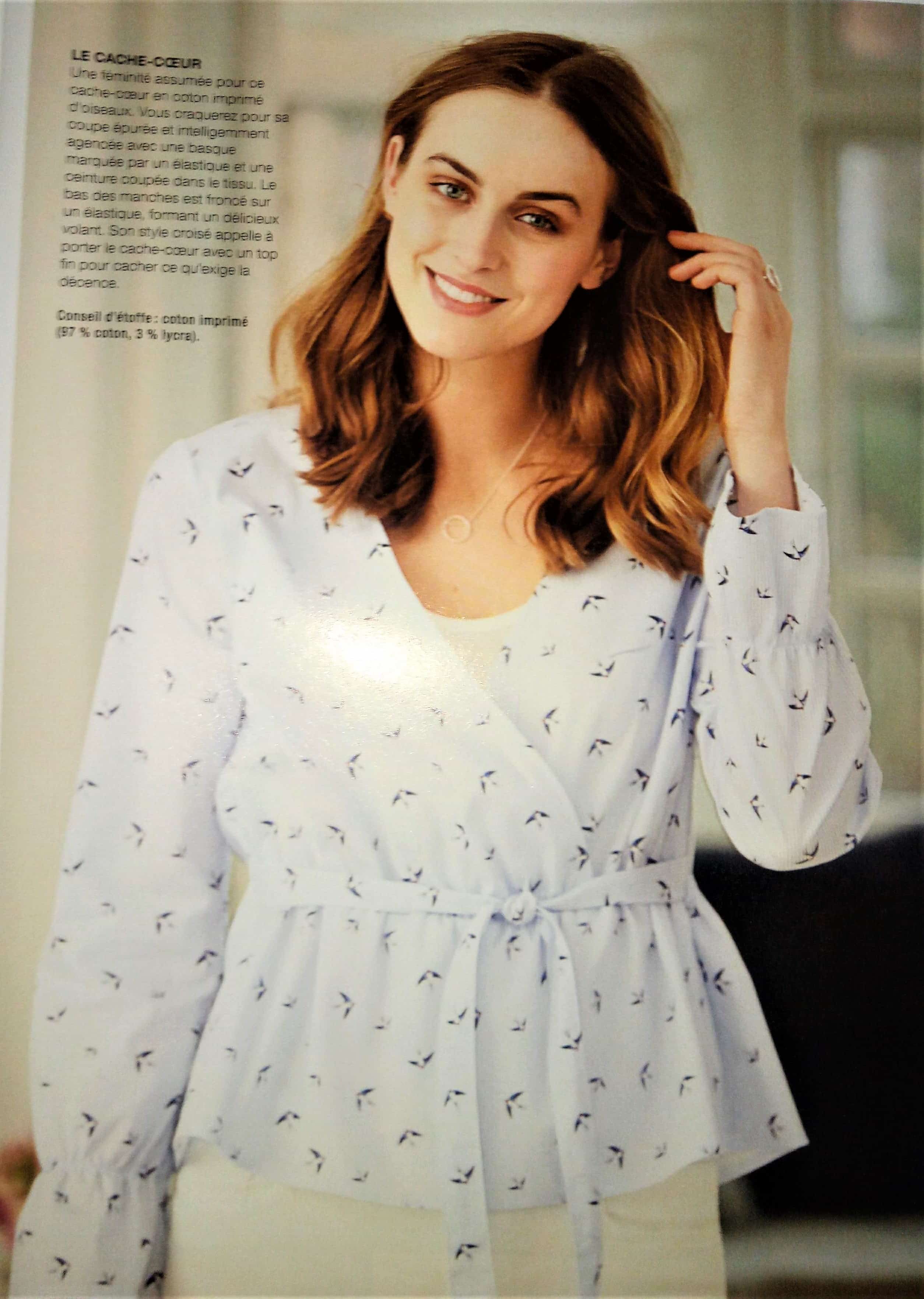 Je ne sais pas vous mais j’aime beaucoup les cache-coeur. Ils sont très féminins et élégants comme celui-ci. Le devant est croisé jusqu’à la taille élastiquée, et se termine avec une basque. Les manches longues sont resserrées dans le bas à l’aide de fronces qui forment un volant. Il va de la taille 36 au 46.