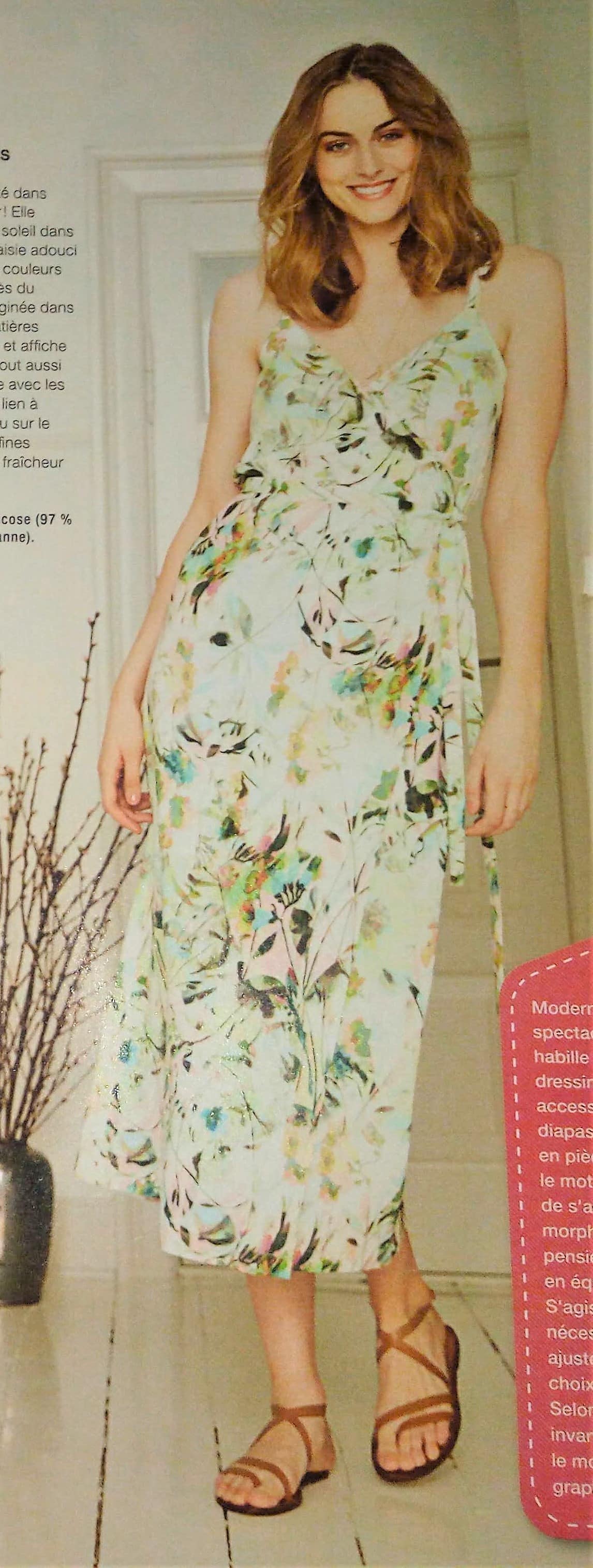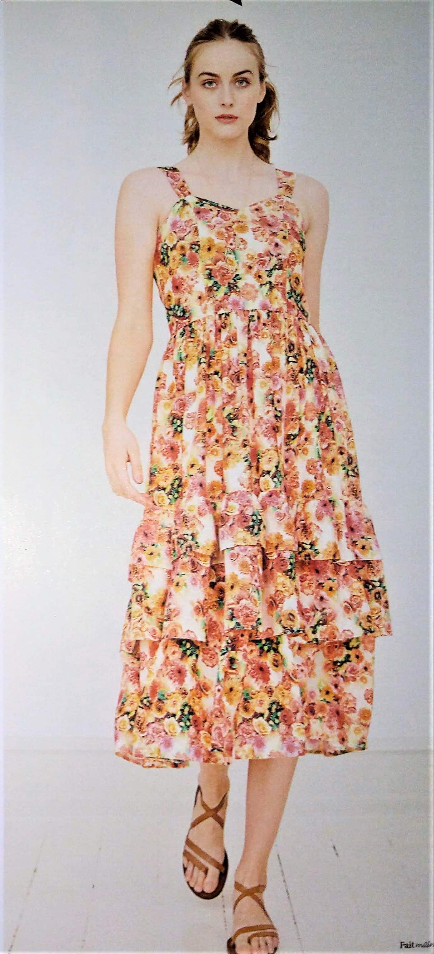 Voici une robe romantique à souhait. Le bustier est cintré à l’aide de découpes. La jupe est froncée à la taille et garnie de volants eux aussi froncés. Ils lui donnent l’ampleur et le volume idéal. Elle va de la taille 36 au 46.