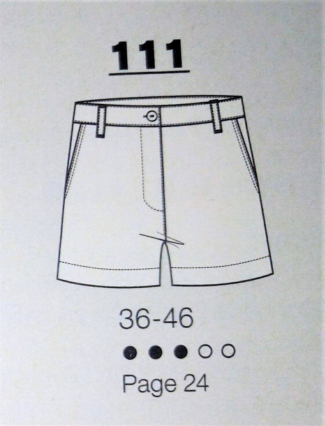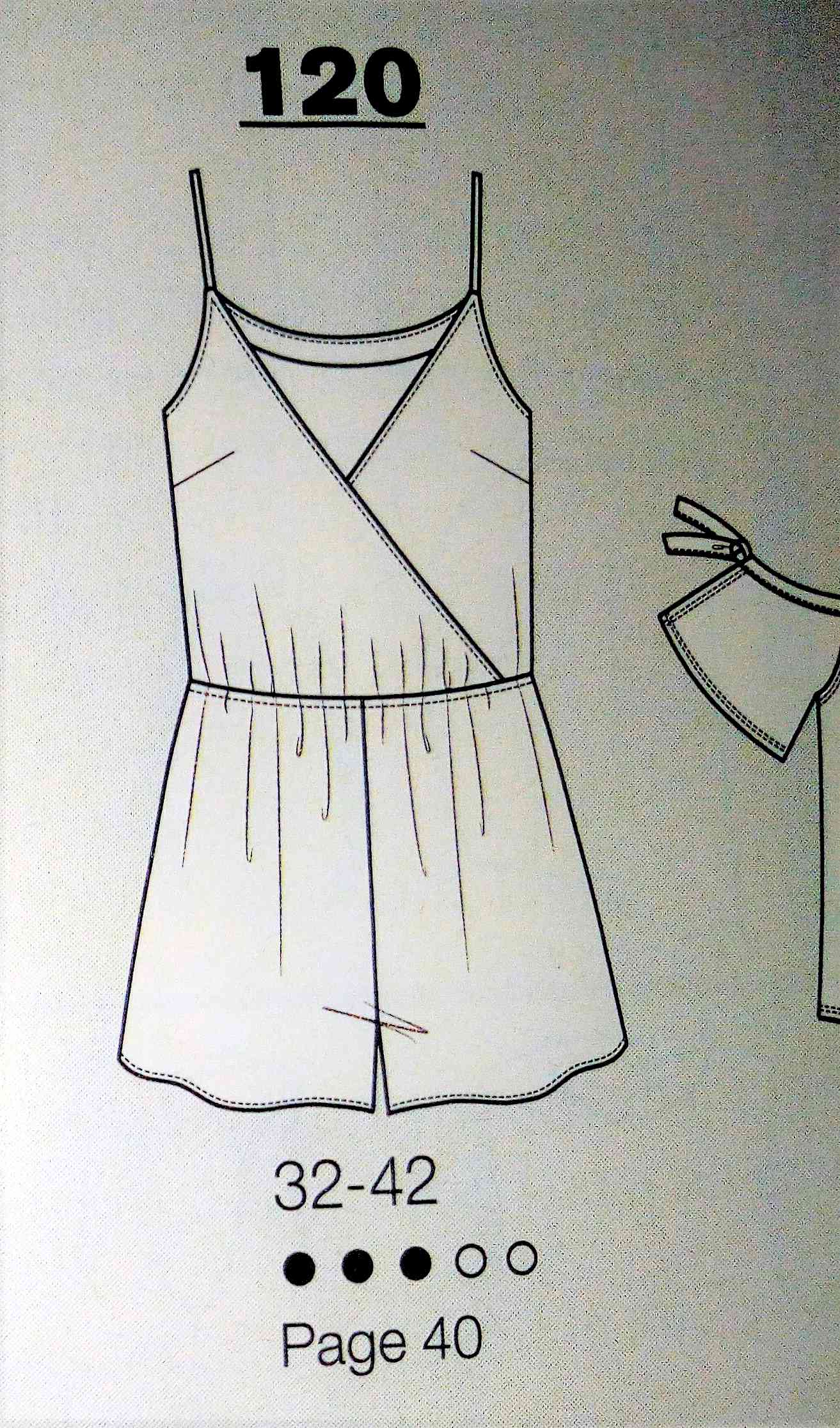 Ici j’apprécie l’originalité de ce top et ce short. Le top est d’apparence classique sur le devant. Le dos est en deux morceaux qui sont vrillés. Une immense goutte XXL rajoute beaucoup de peps. Le short est lui classique sur le dos mais original sur le devant. Deux pans pris dans la couture de côté se croise légèrement sur le devant, façon jupette. Ils vont du 36 au 46.
