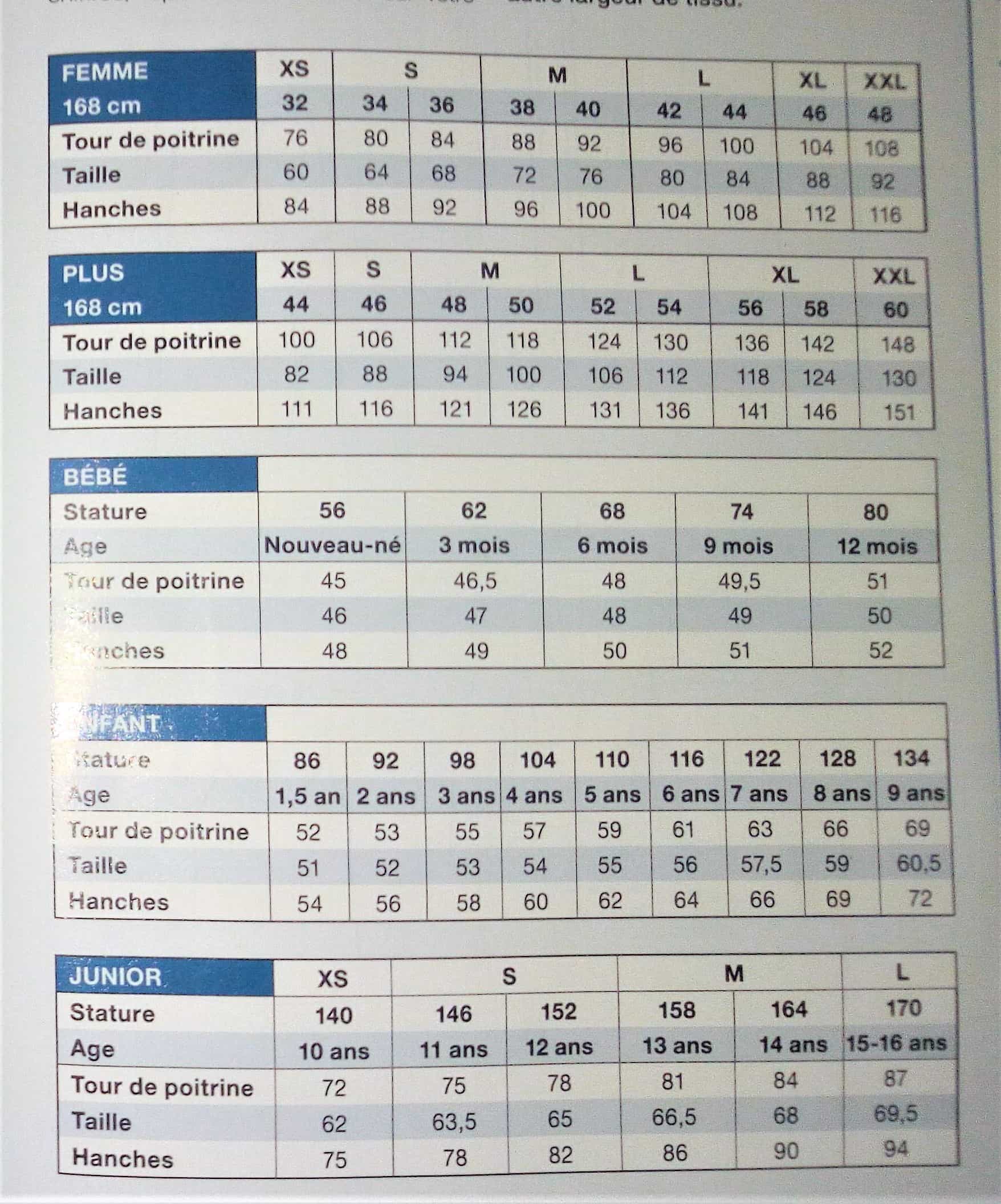 Le tableau des tailles