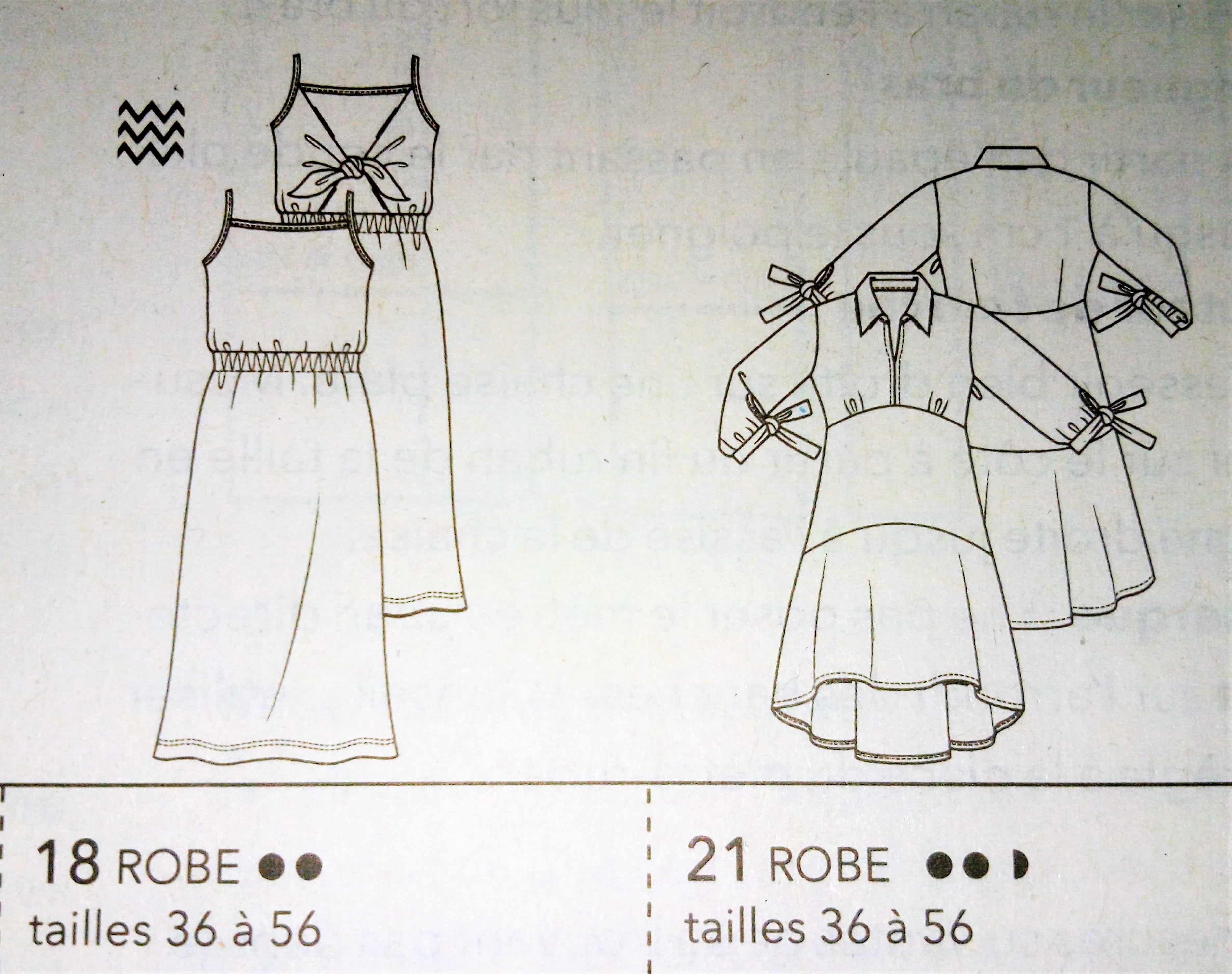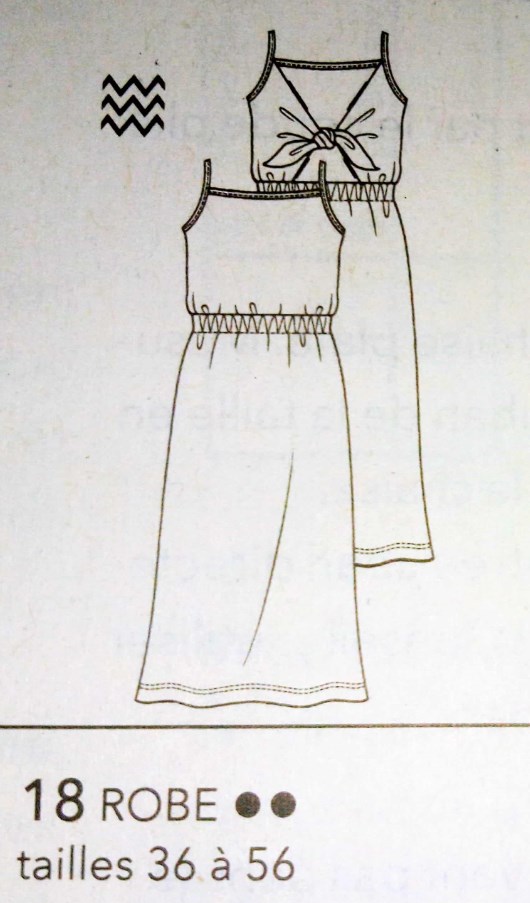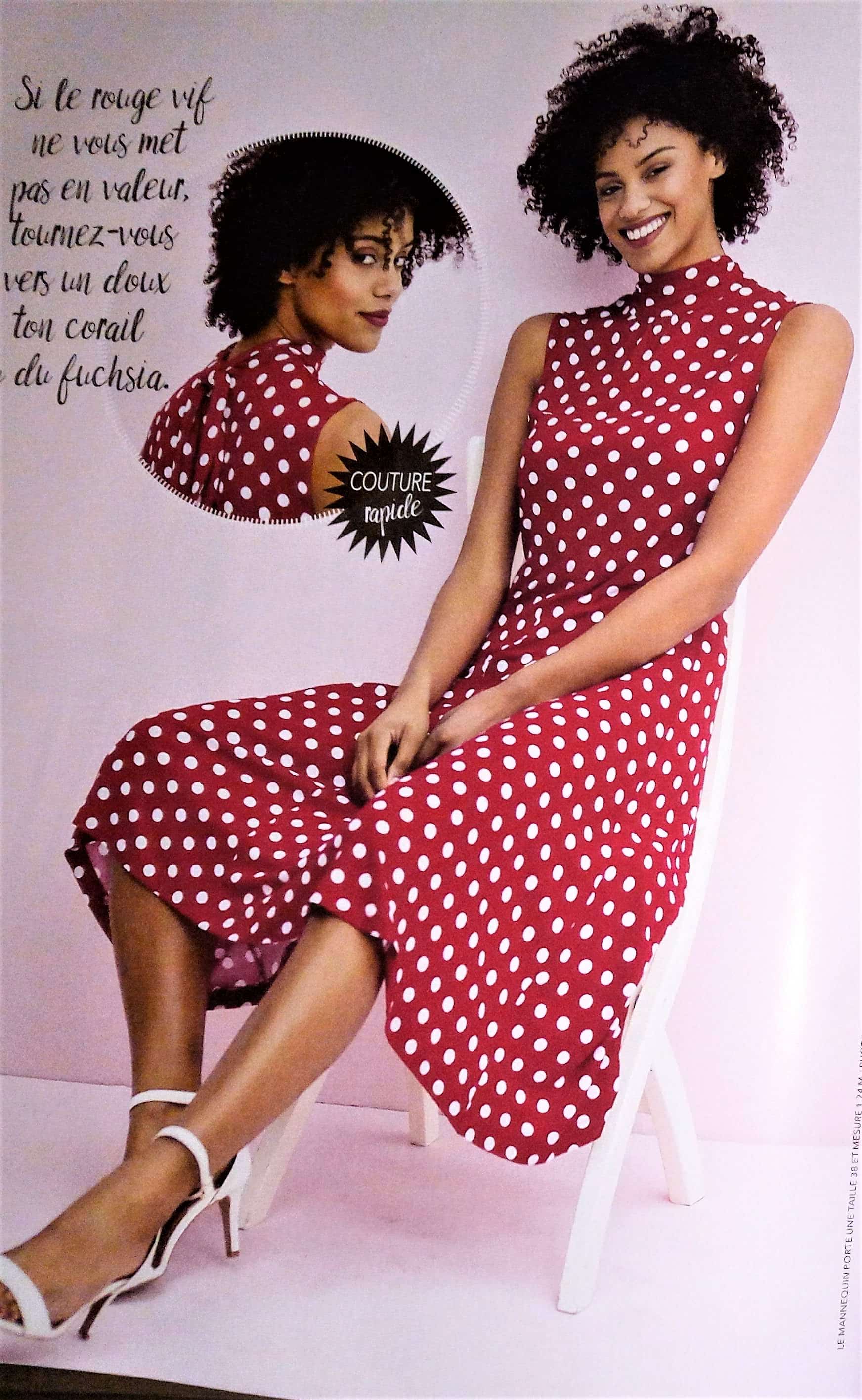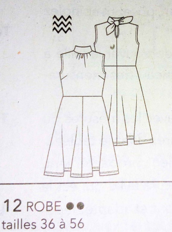 Que dire sur cette robe, un brin rétro, mais très féminine. Il dispose d’une bordure d’encolure relevée à nouer dans le dos sur une fente. Le corsage est sans manches prés du corps, il est ajusté à l’aide de pinces poitrine. La jupe est de forme corolle.