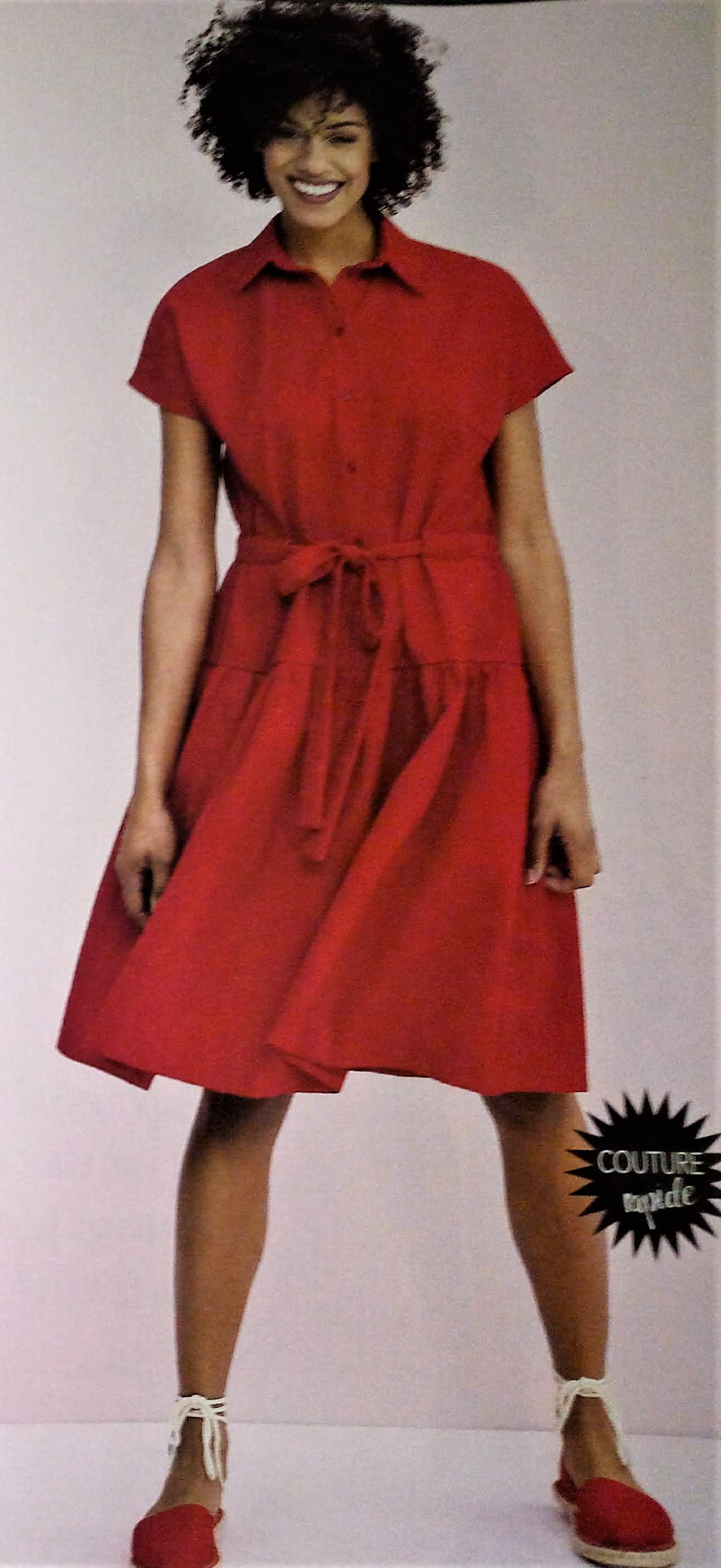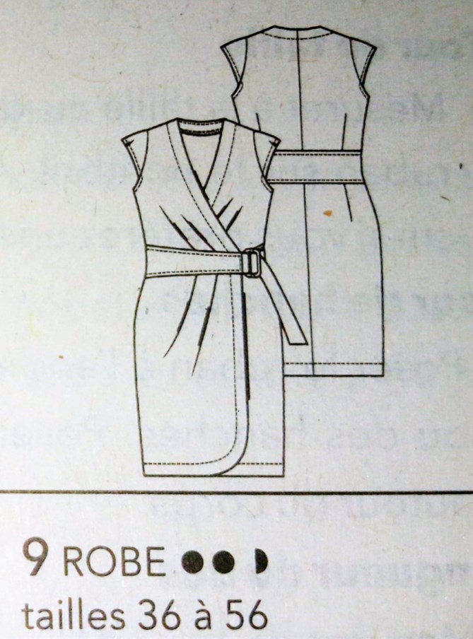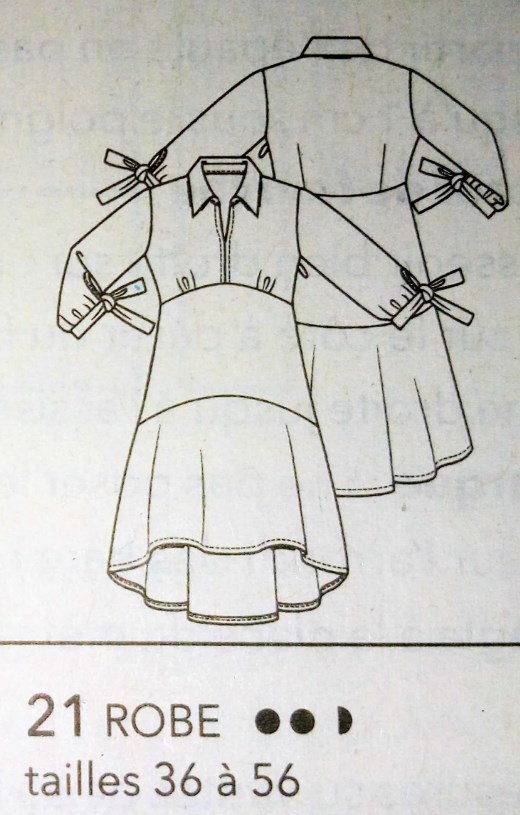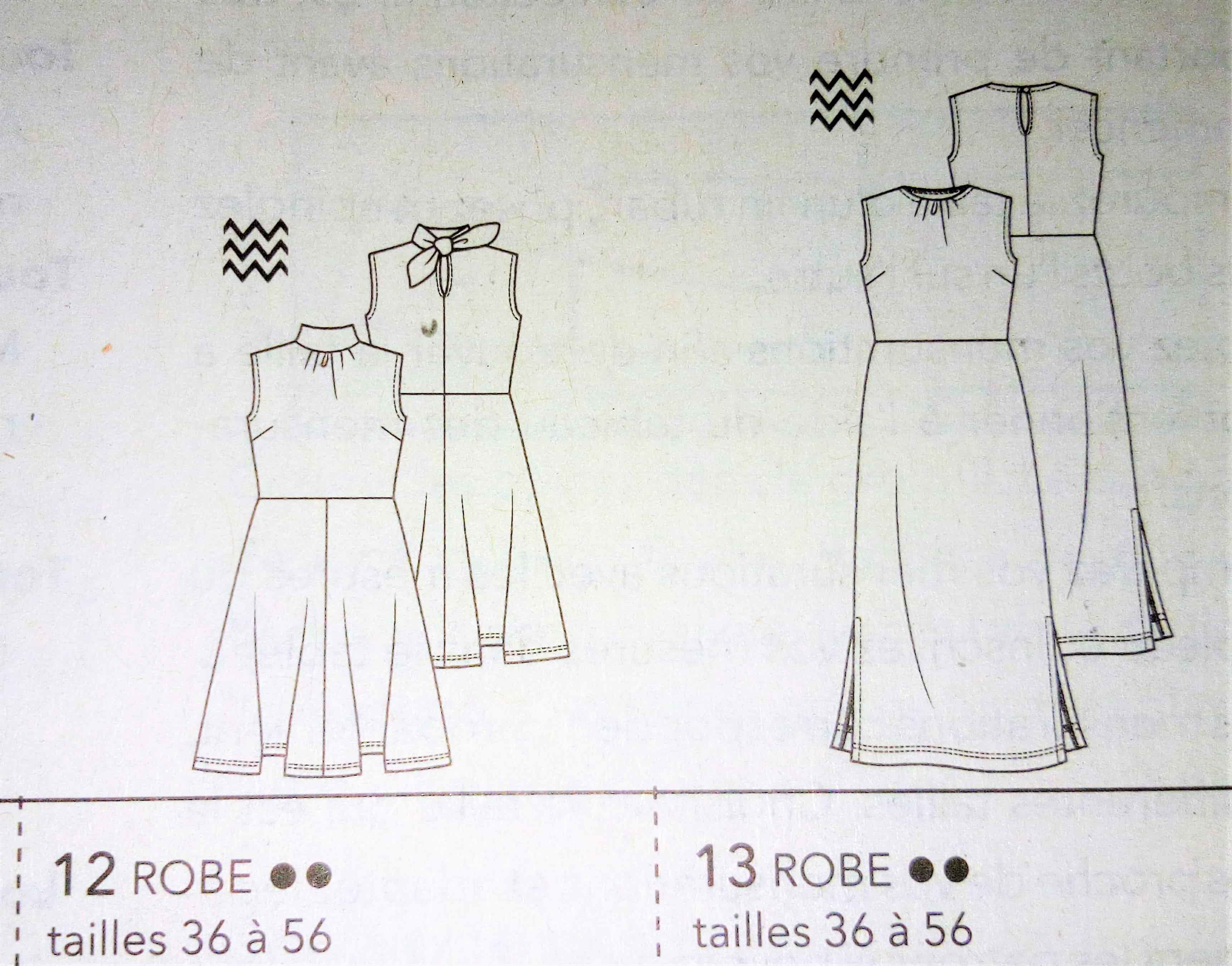 Que dire sur cette robe, un brin rétro, mais très féminine. Il dispose d’une bordure d’encolure relevée à nouer dans le dos sur une fente. Le corsage est sans manches prés du corps, il est ajusté à l’aide de pinces poitrine. La jupe est de forme corolle.