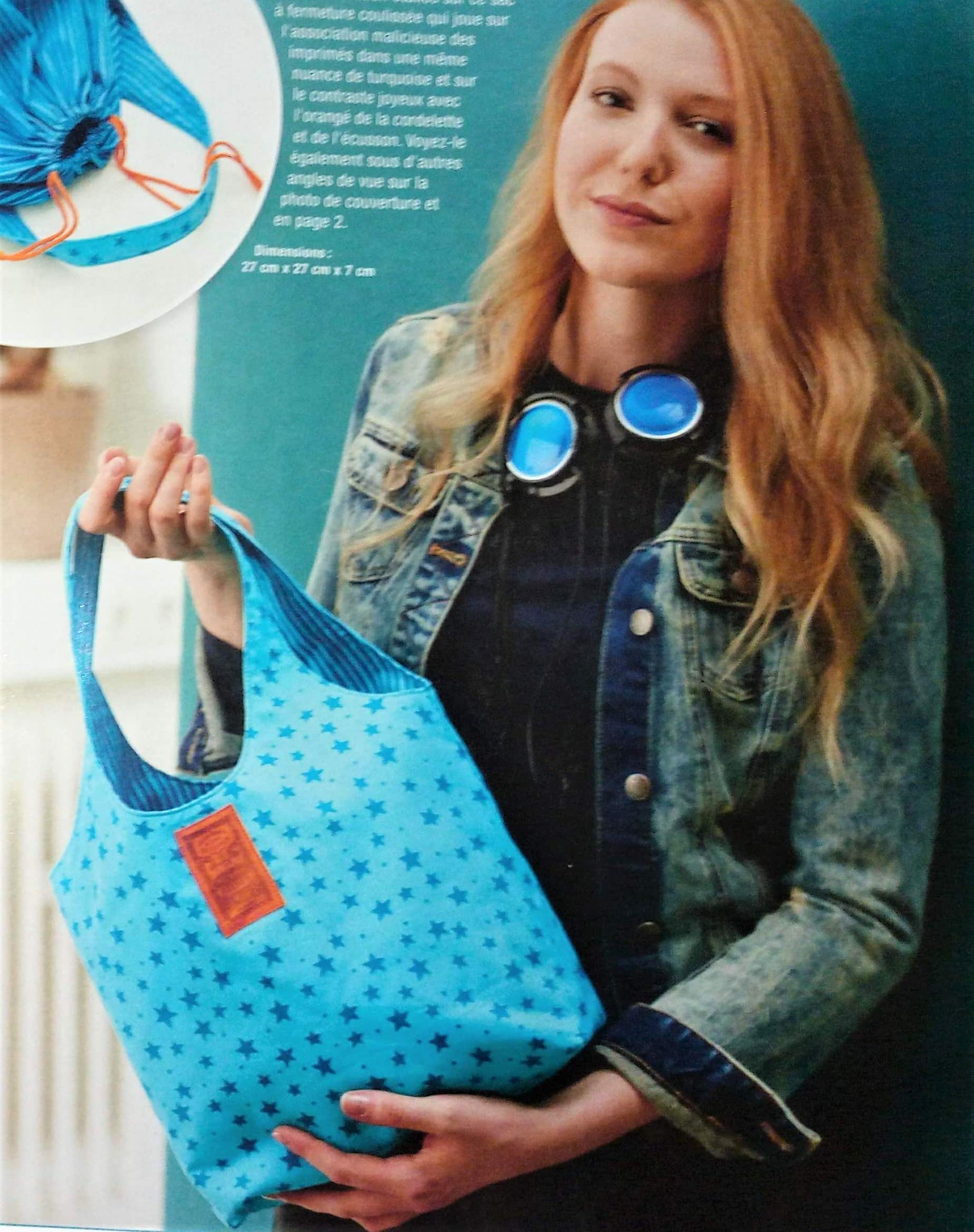 Je trouve ce sac très sympa, l’astuce de la doublure coulissée permet d’augmenter astucieusement son volume. Le jeu des tissus avec des imprimés différents est original.