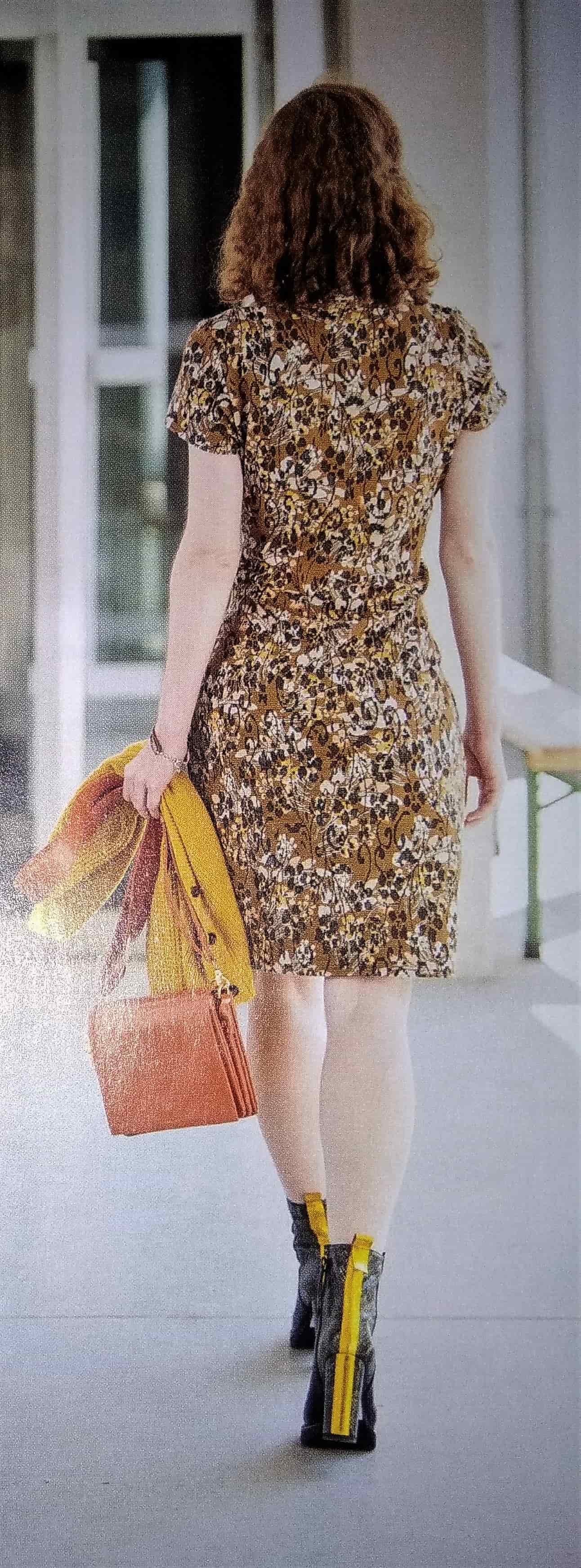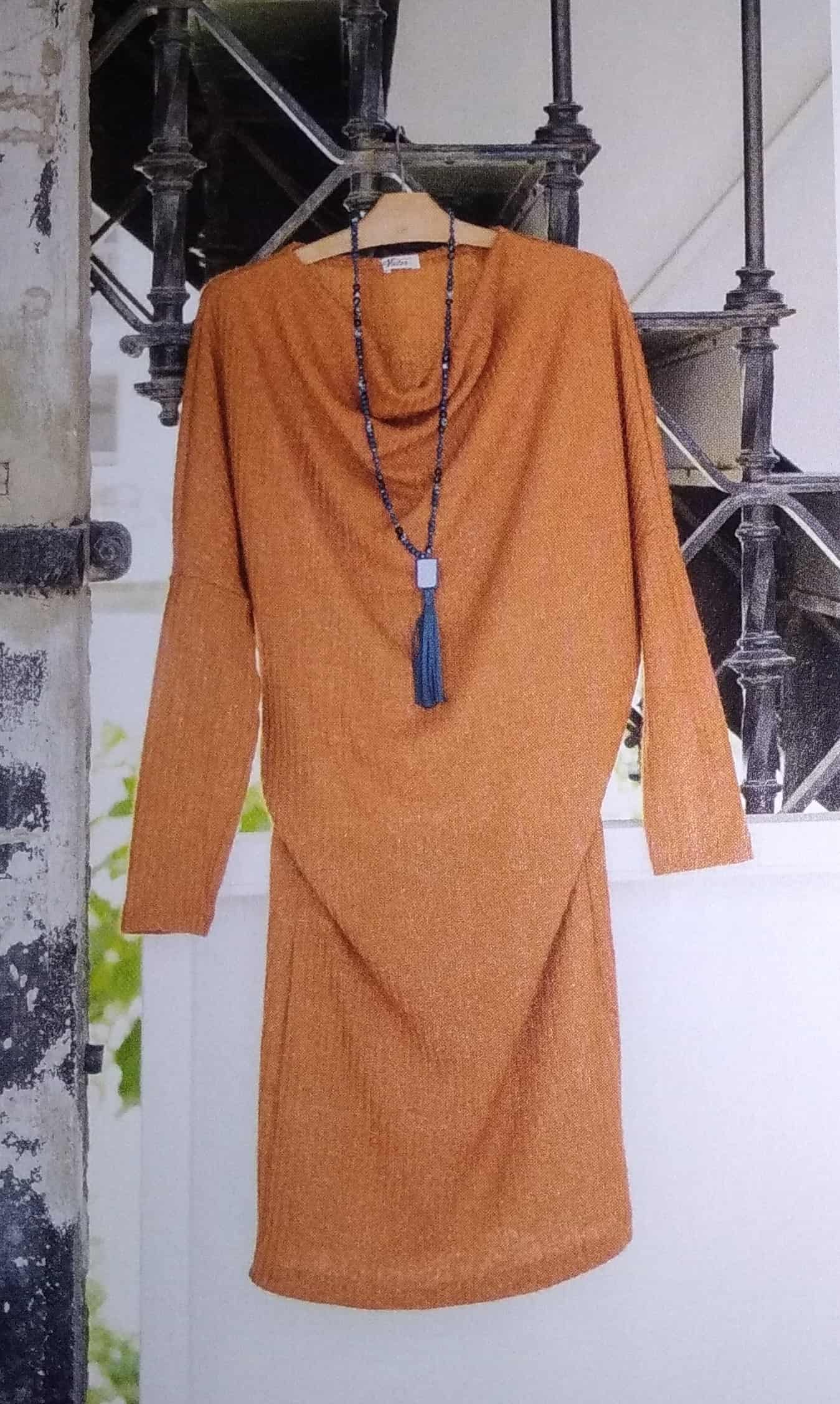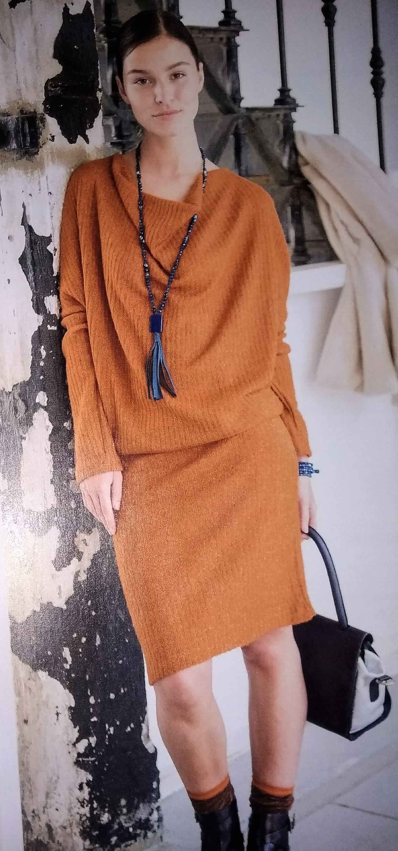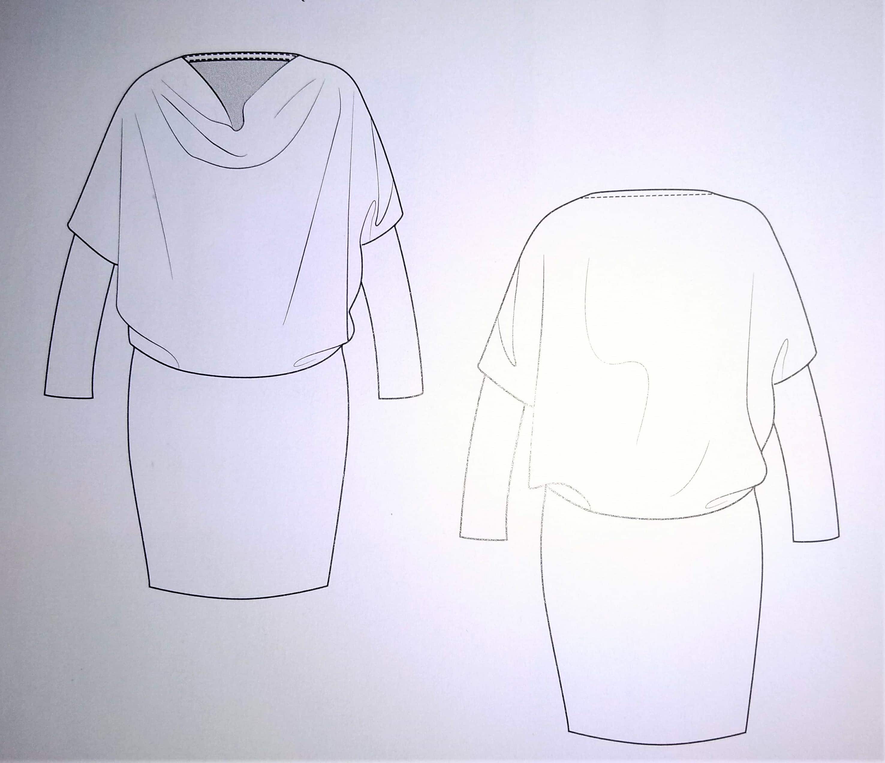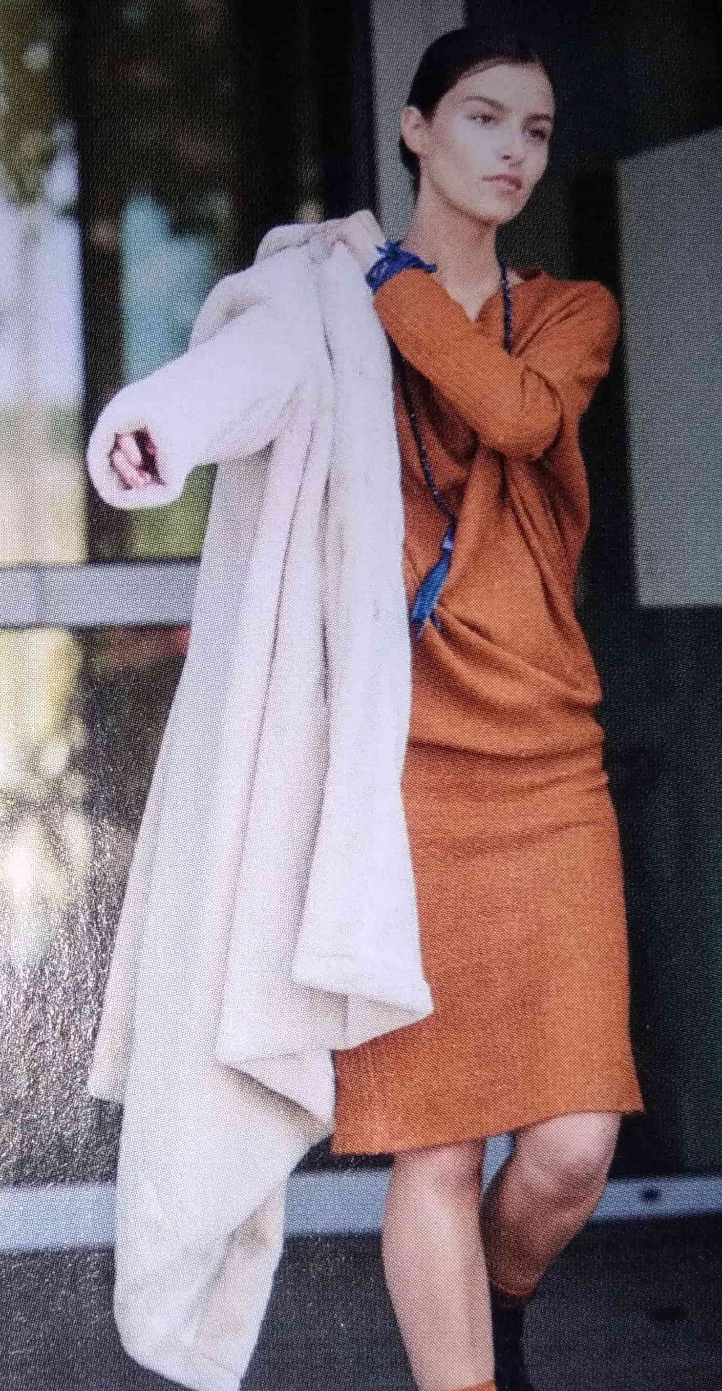 Voici mon premier et gros coup de coeur. Il s’agit d’une robe-sweat facile à coudre. Elle est réalisée en tricot léger. Son encolure est drapée. Les manches sont basses. Le corsage est assez flou et vague et se termine avec une jupe moulante. Elle va du 34 au 56. Il va falloir que je regarde son métrage car je réaliserais bien un duo mère et fille pour les fêtes.