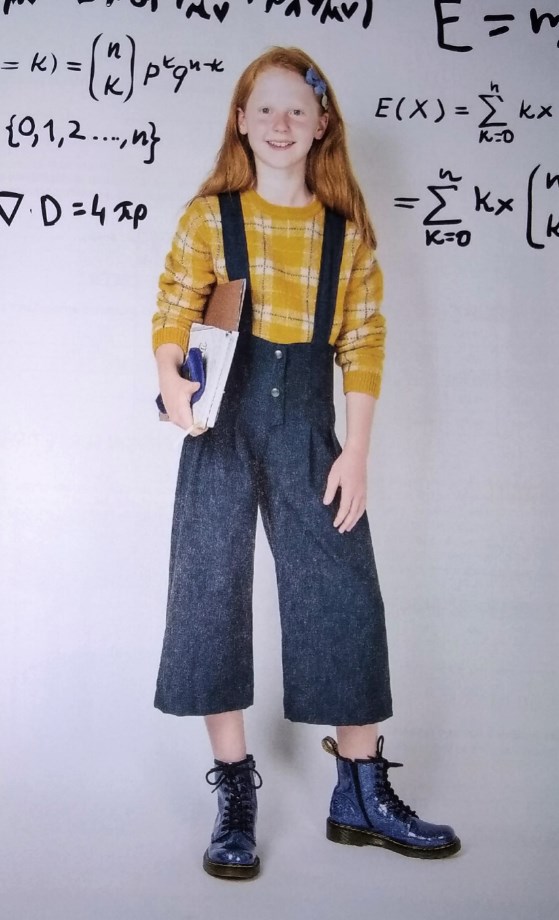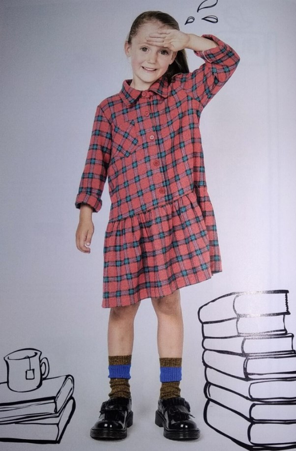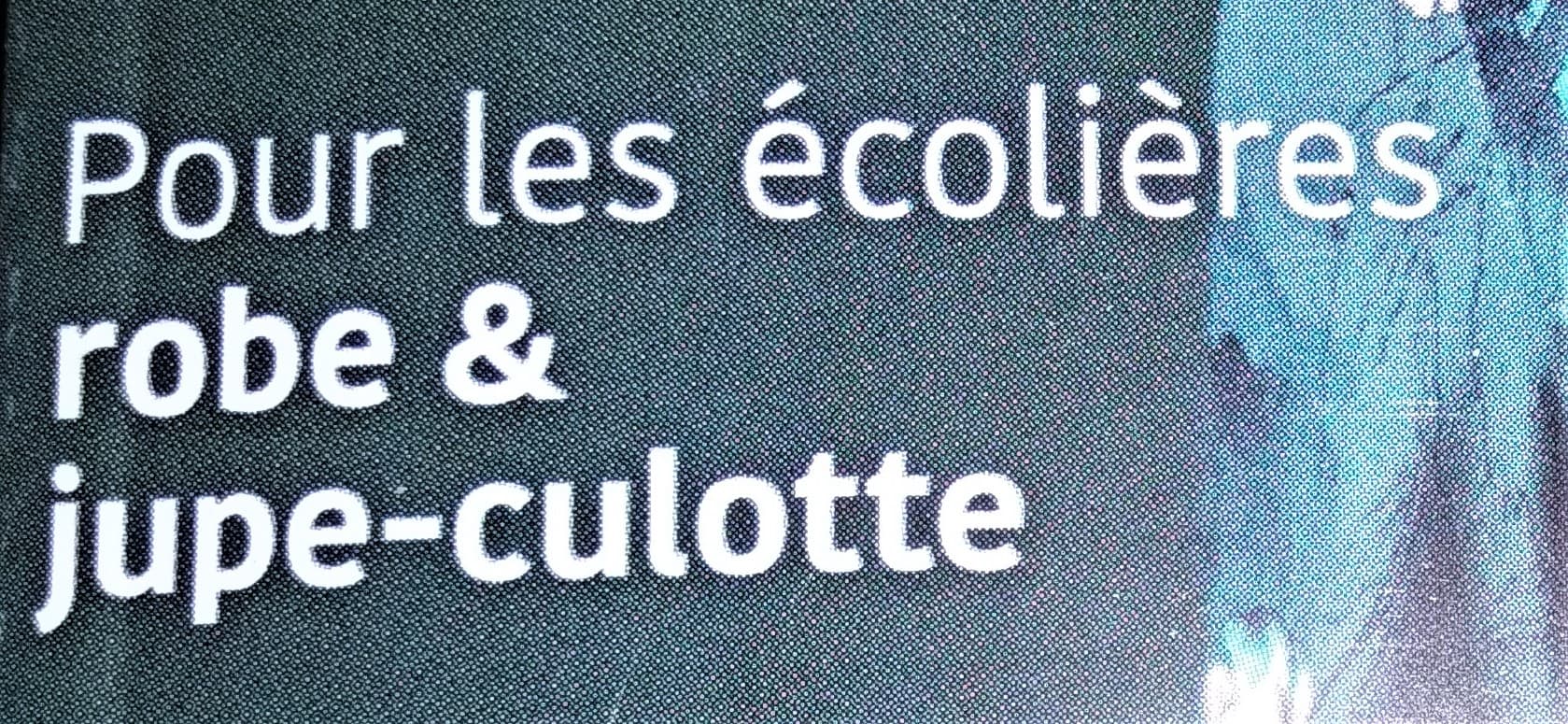 Nos écolières ne sont pas en reste, avec une robe et une jupe-culotte. Je dois reconnaître que personnellement j’ai du mal avec la deuxième. Ce n’est pas une pièce que vous trouverez dans mon armoire, ni dans celles de mes filles.