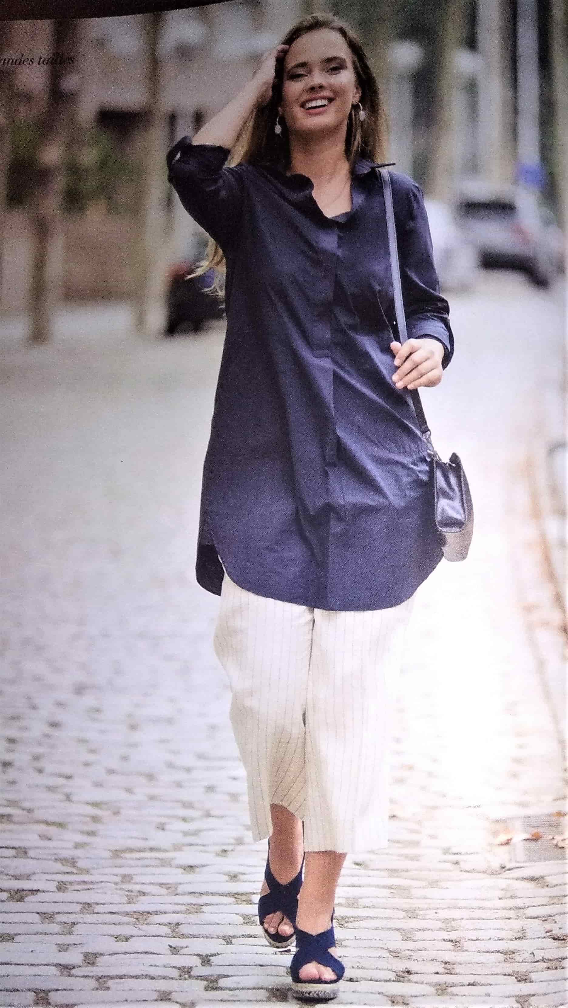 Je salue l’originalité discrète de ses deux pièces. La chemise classique à col chemisier et manches longues voit celles si être doté d’une patte chemisier allant jusqu’au coude. Le pantalon lui aussi est simple, avec ceinture élastiquée. Les bas d’ourlets sont arrondis, je trouve que ça donne beaucoup d’élégance à cette pièce confortable. Ils sont en tailles 50 – 54 – 58.