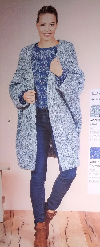 Ici, il s’agit d’un gilet réalisé en tissu à grosse mailles façon tricot. Le modèle est simple: un gilet avec des manches kimono. Il est parfait pour se lover dedans lorsqu’il fait un peu froid. Il est en tailles S/M/L et XL.