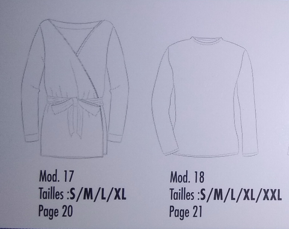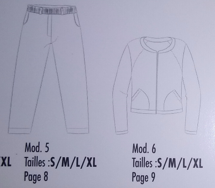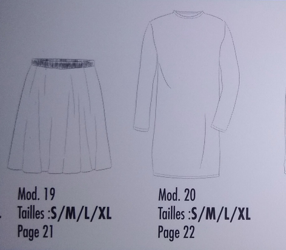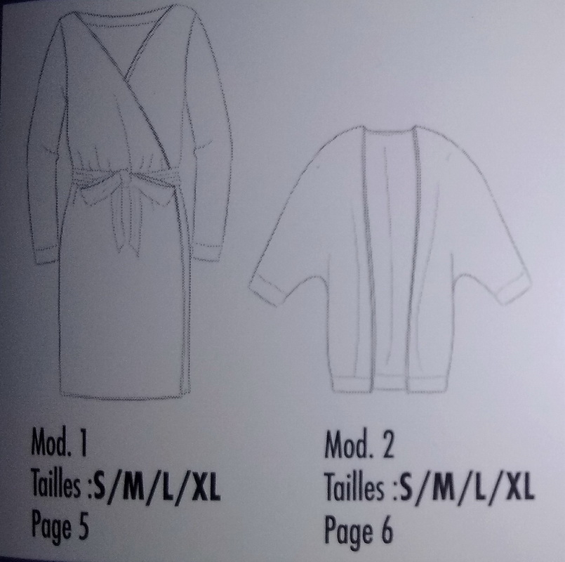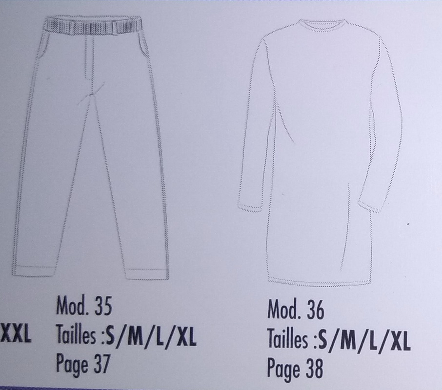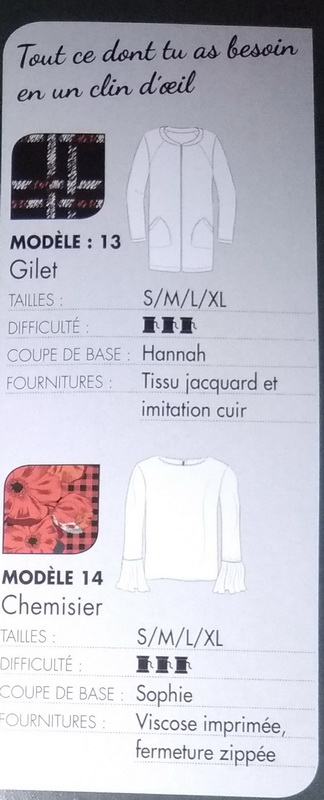 C’est tout bête mais j’aime beaucoup ces petits encarts à côté de chaque photo de vêtement. Ils nous indiquent le modèle de base utilisé, les tailles, la difficulté et le tissu utilisé.