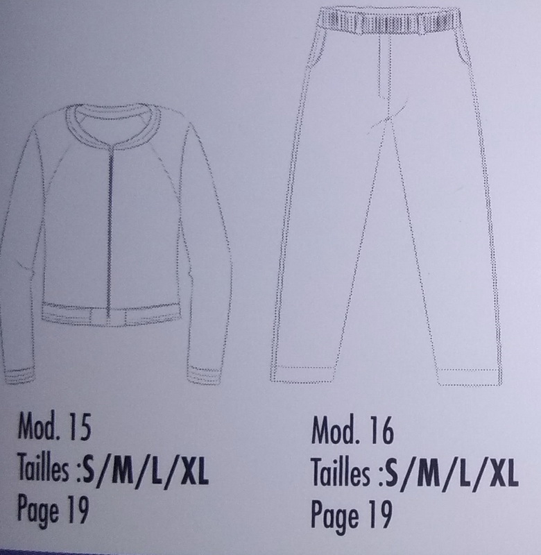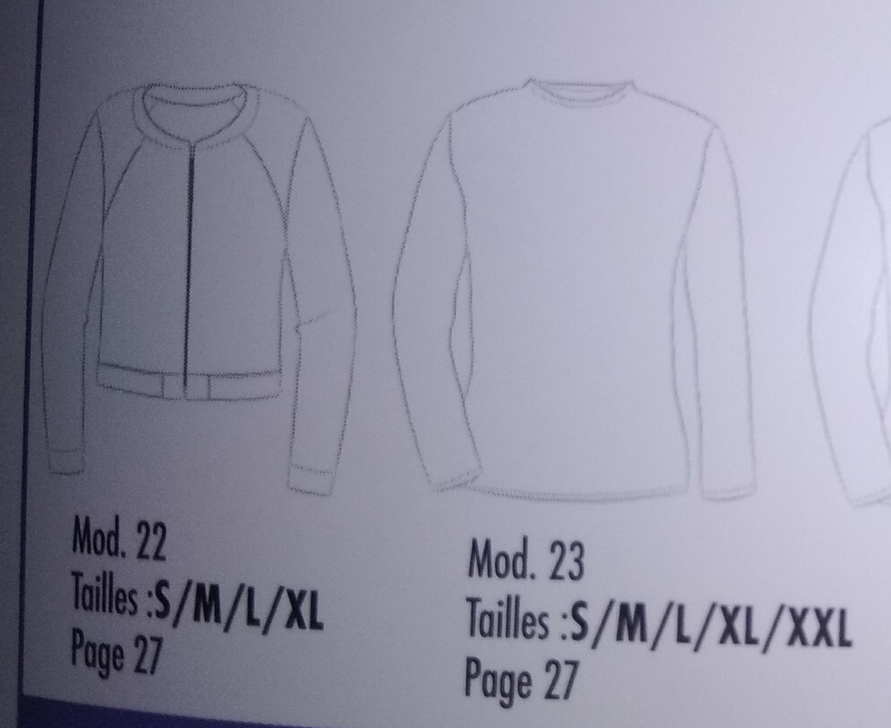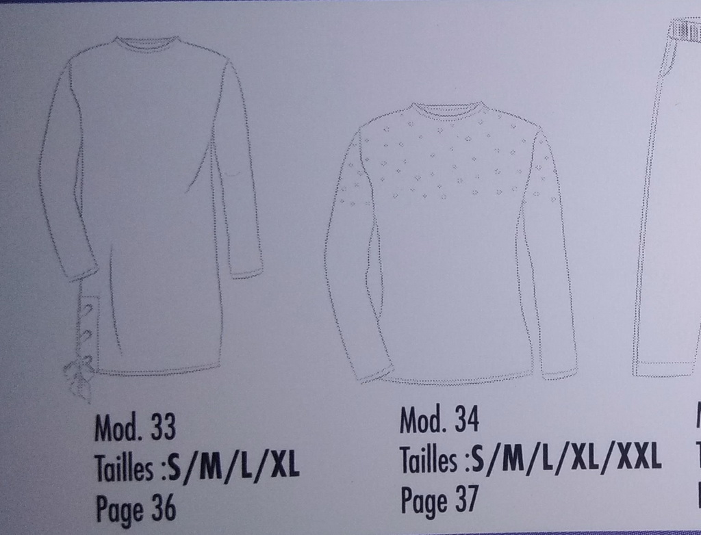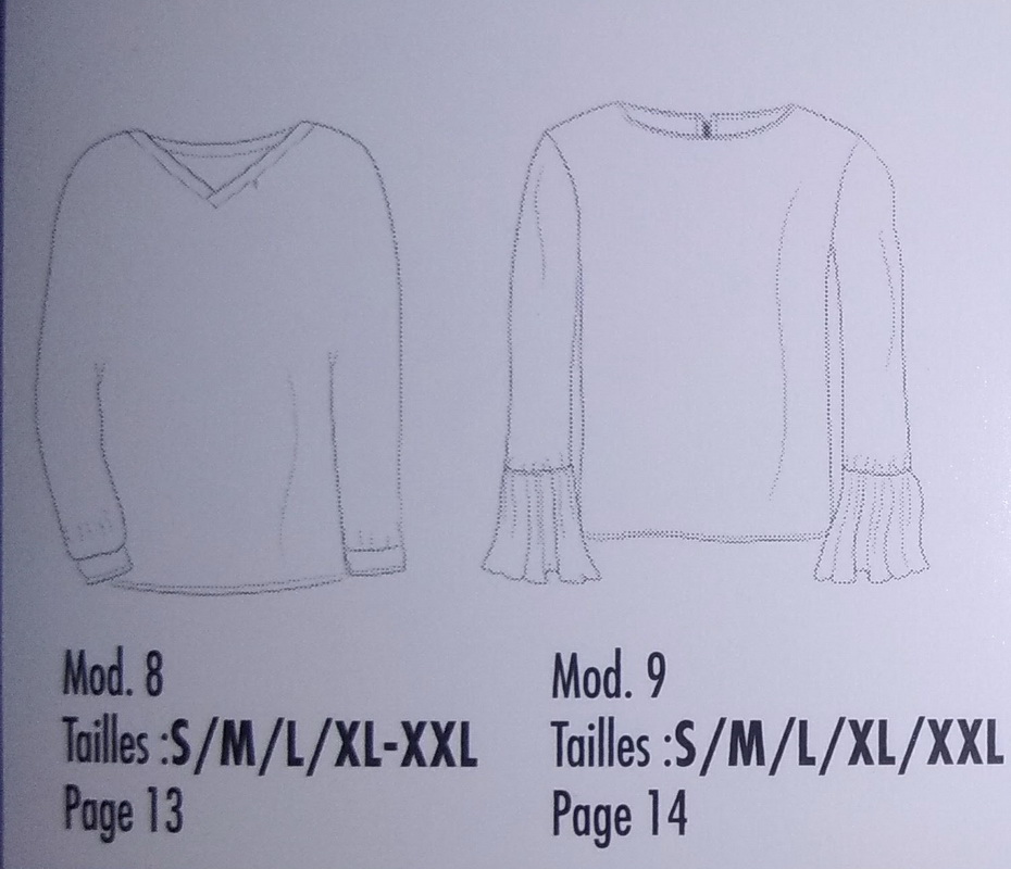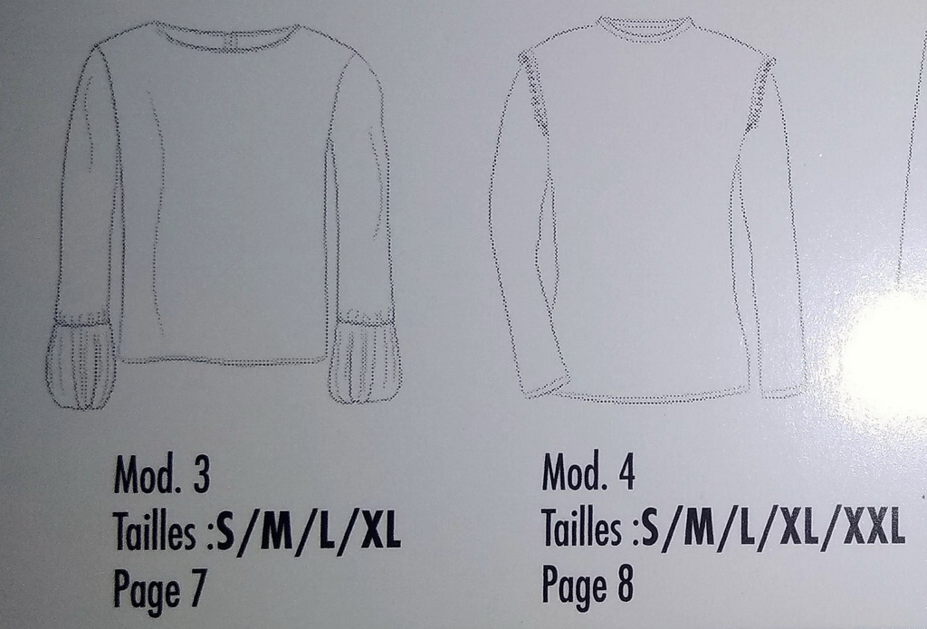 C’est tout bête mais j’aime beaucoup ces petits encarts à côté de chaque photo de vêtement. Ils nous indiquent le modèle de base utilisé, les tailles, la difficulté et le tissu utilisé.