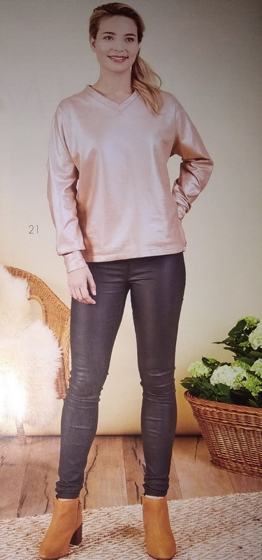 Mon dernier coup de cœur est pour cette tunique, plus particulièrement la version en tissu brillant. Les manches chauve-souris donnent beaucoup de confort et d’allure à ce vêtement. L’encolure est en V. Elle est en taille S/M/L/XL et XXL!