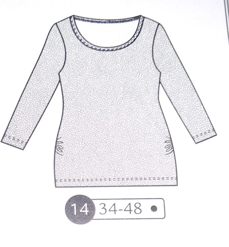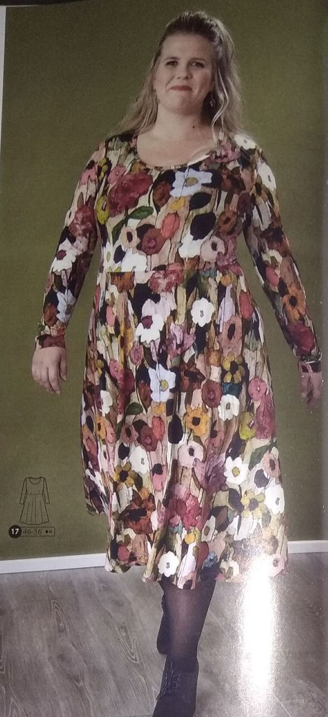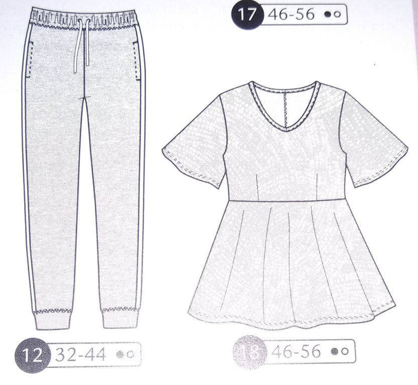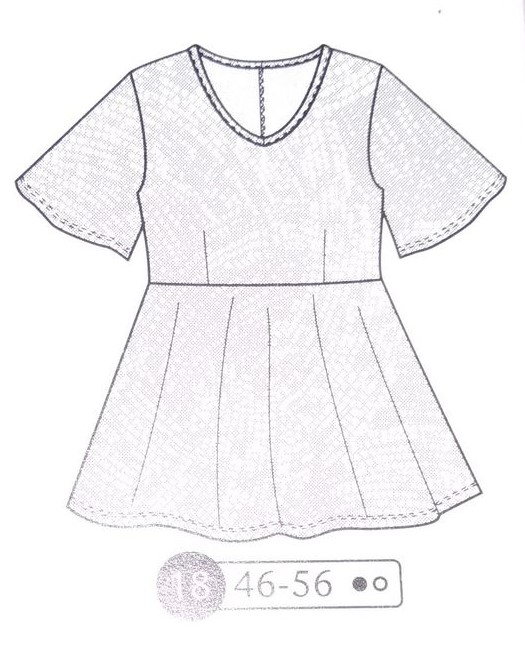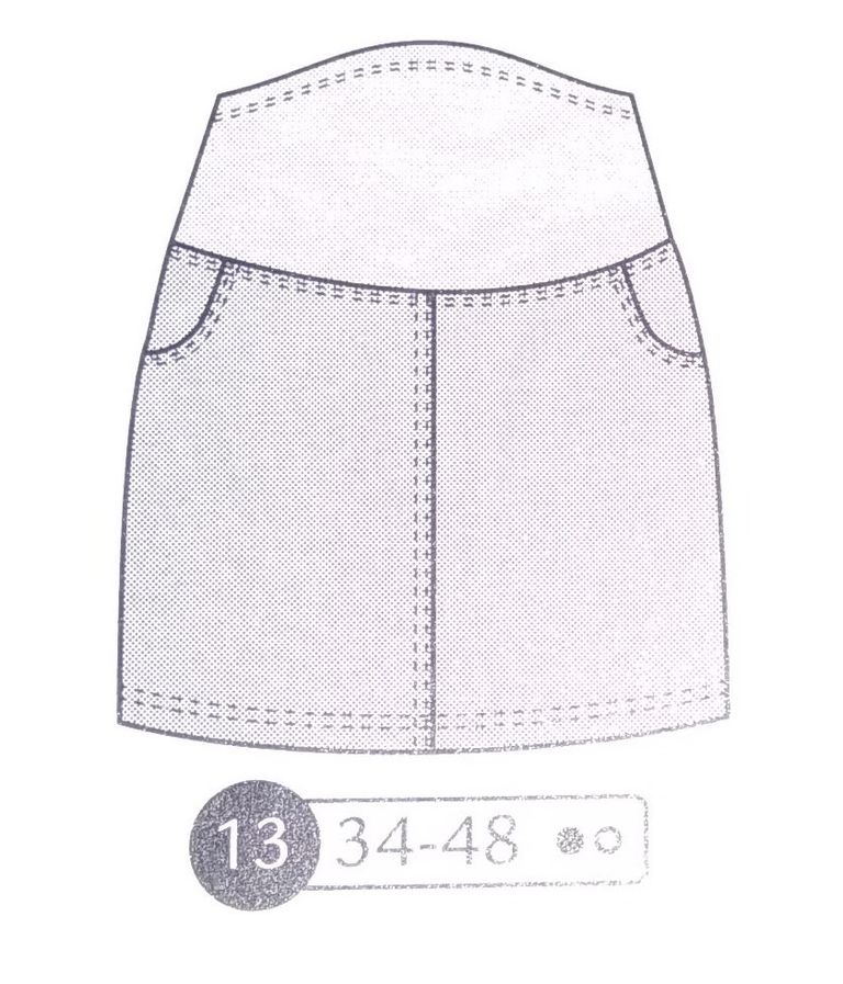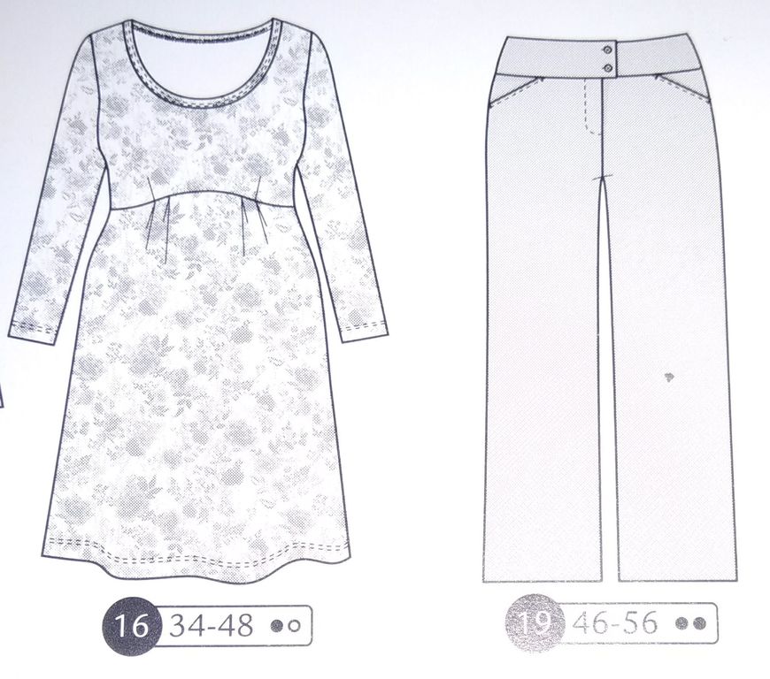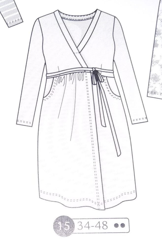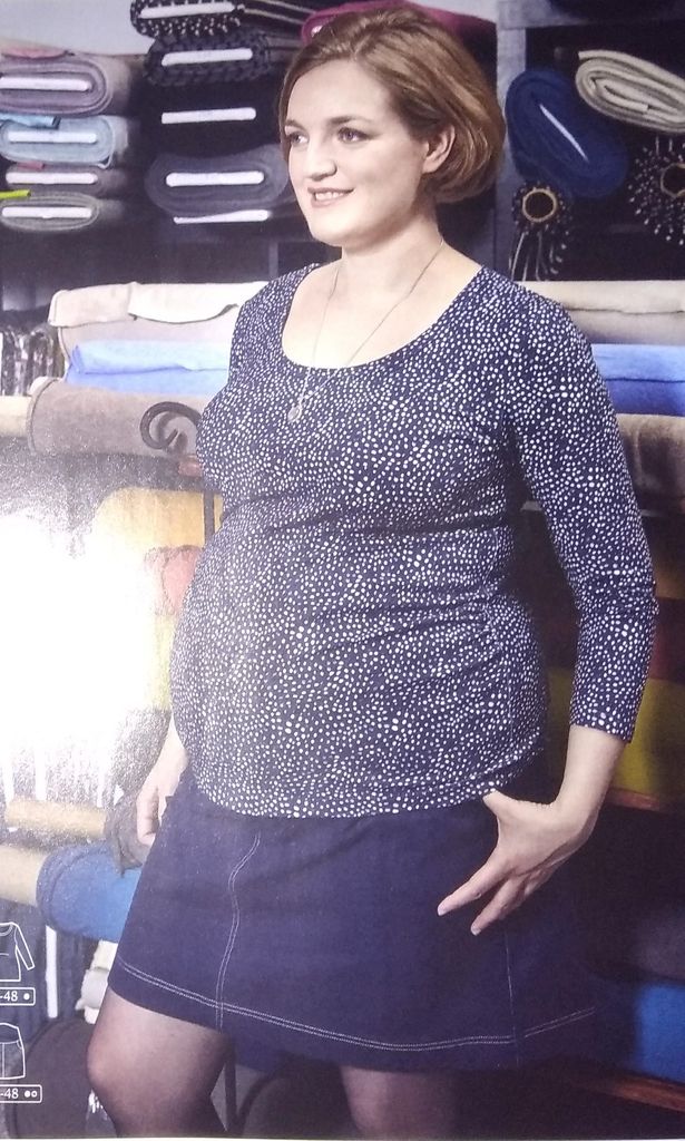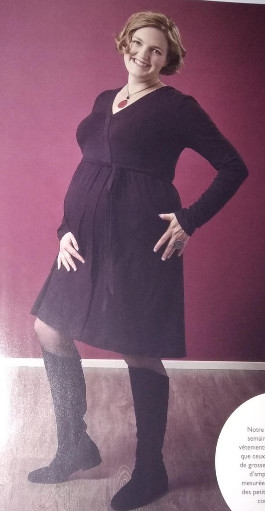 Une robe de grossesse je crois que c’est une première dans les revues couture. Non? Ces patrons sont très rares! Cette robe est de forme faux cache-cœur, car les pans du corsage sont cousus sur l’encolure, tout comme la jupe qui voit un panneau supplémentaire accentuer cet effet. Des fronces à la ceinture permettent de la porter tout le long de la grossesse et même après quand le petit ventre n’aura pas disparu. Elle va de la taille 34 au 48.