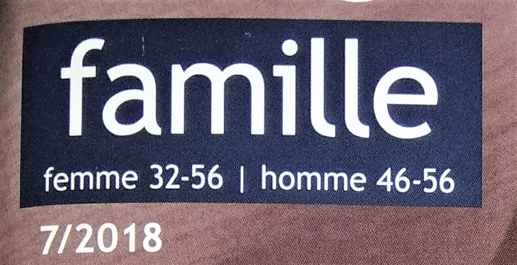 Et oui pas d’abondance de titres, ou de blocs titres ni de pages de couverture surchargée. C’est la politique « OTTOBRE ». Leur réputation suffit et le bouche à oreilles. Cet unique bloc nous apprend qu’il s’agit du numéro Famille. Que l’amplitude des tailles va du 32 au 56 pour les femmes. Pour les hommes elle s’étale du 46 au 56.