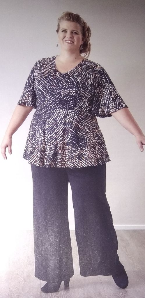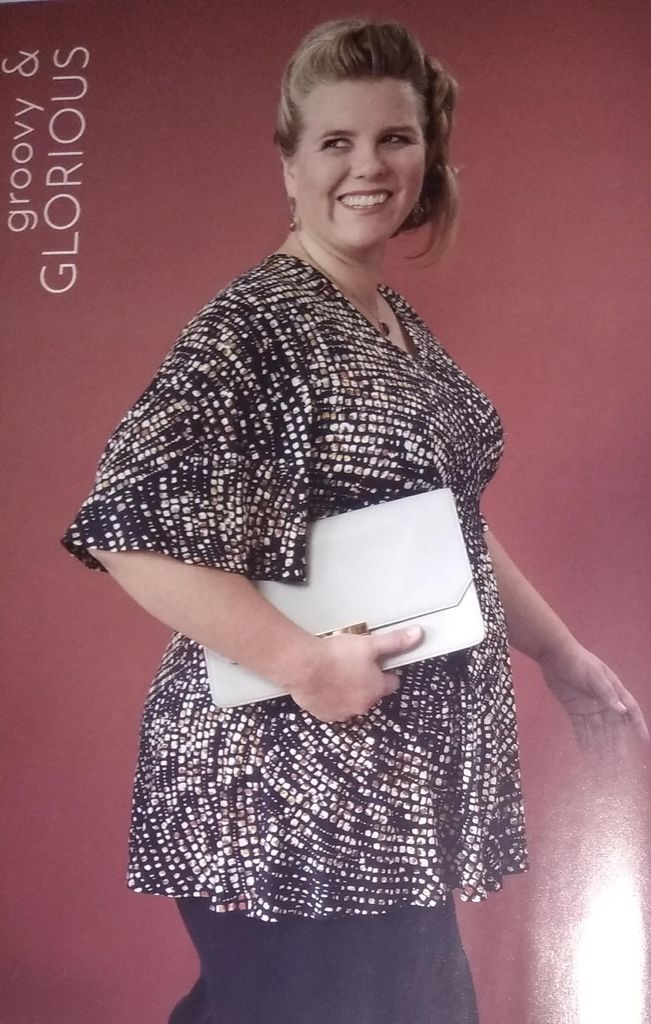 J ‘adore cette tunique pour femme en grandes tailles. Son encolure est en V, mais pas assez profonde à mon goût. Les manches courtes sont de forme cloche, la tunique est coupée à la taille avec un bas de forme trapèze, tout en fluidité. Elle va du 46 au 56.