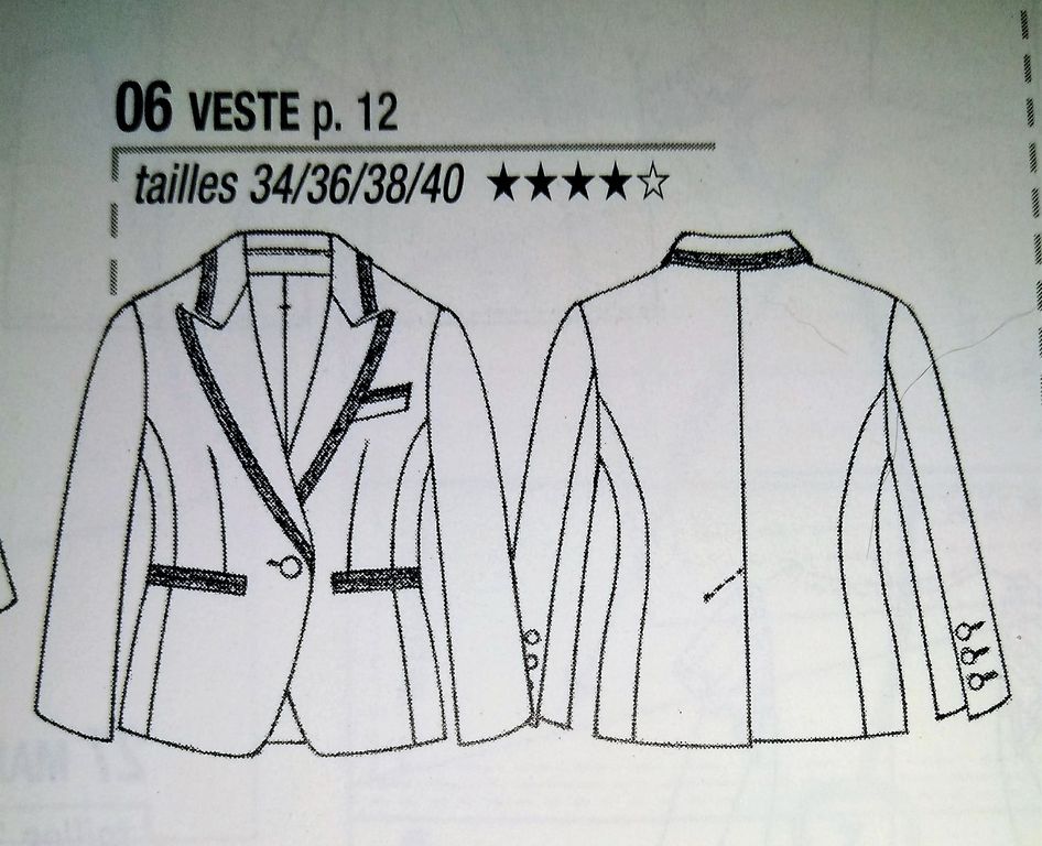 Cette petite veste est superbe elle aussi. Elle est de forme officier cintrée avec découpes princesses. Elle se porte ouverte deux rangées de boutons bordent l’ouverture devant. Les têtes de manches comportent une série de plis sur un empiècement. Elle va de la taille 34 au 40.