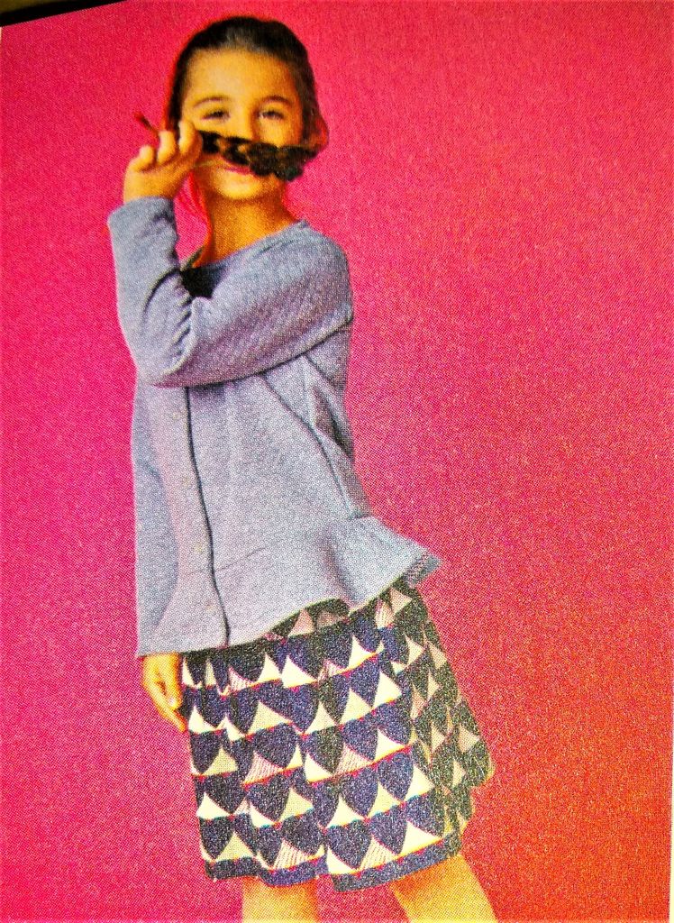 Ce gilet à basque est superbe lui aussi. Il est simple sans découpes et se ferme à l’aide de pressions. Je verrai bien des pressions Kam en étoiles comme ici, ce serait superbe! Il va de la taille 6 au 12 ans.