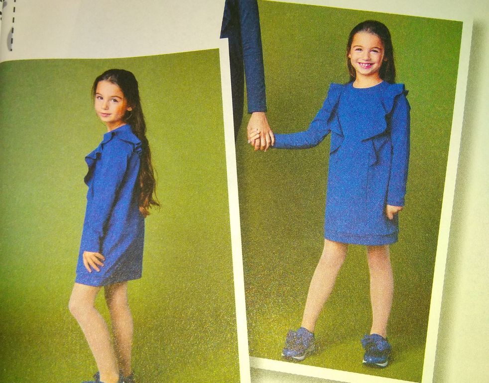 Mon dernier coup de cœur est pour cette robe, j’aime beaucoup la version femme et celle pour enfant. Elles sont toutes les deux à manches longues. Des découpes verticales sur le devant allongent la silhouette. Un volant orne le buste et se termine en arrondi sur le dos.