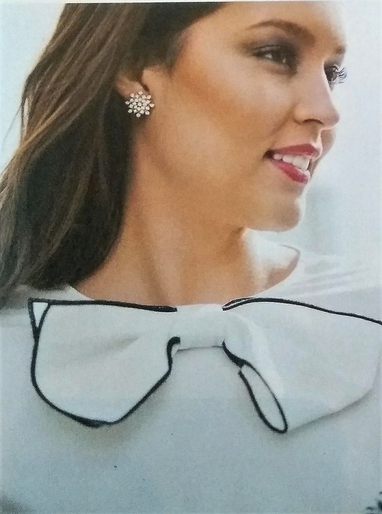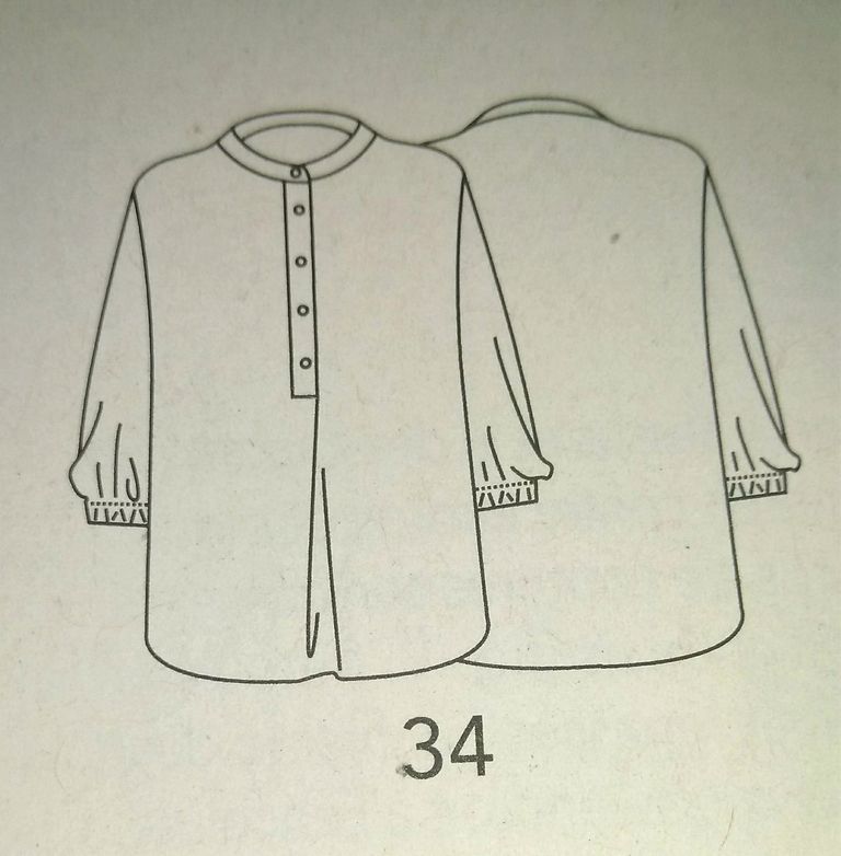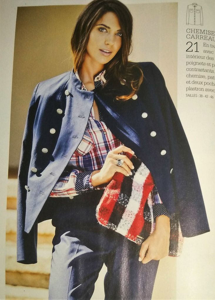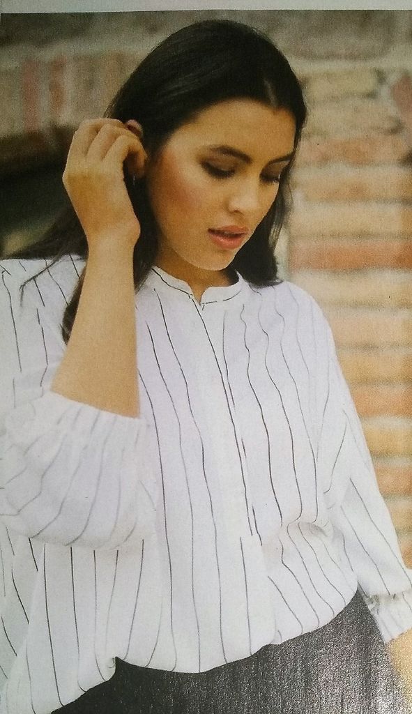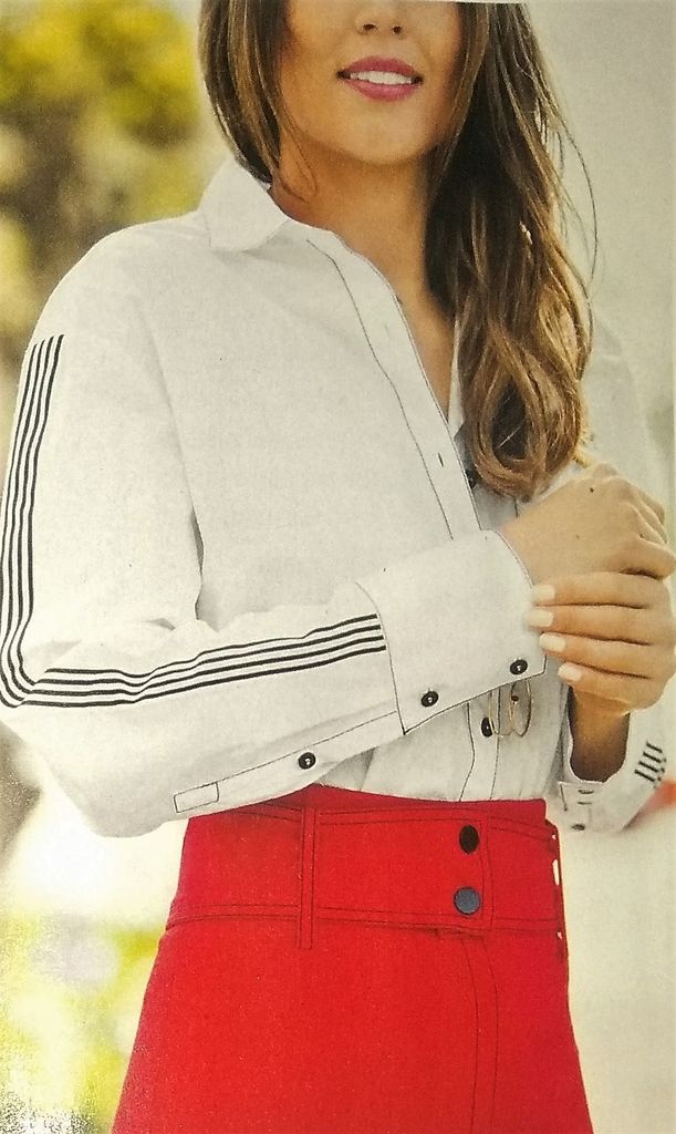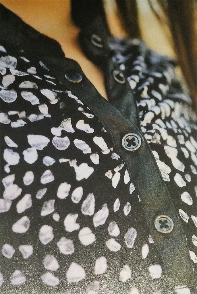 Pour ce coup de cœur je suis frustrée car on ne voit pas la totalité du chemisier. C’est son nœud sur l’encolure ronde qui m’a plu. Le dos est agrémenté d’une fente fermée par un bouton. Les bas de manches eux sont fermés à l’aide de deux boutons. Il est en tailles 38 – 42 – 46.