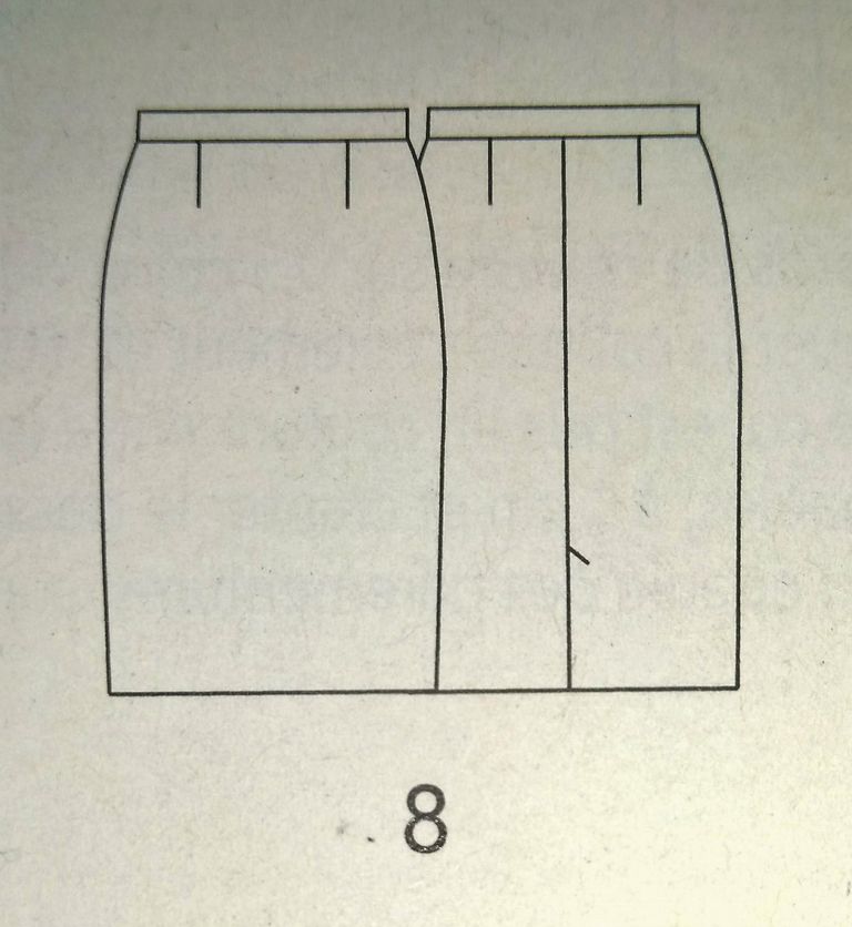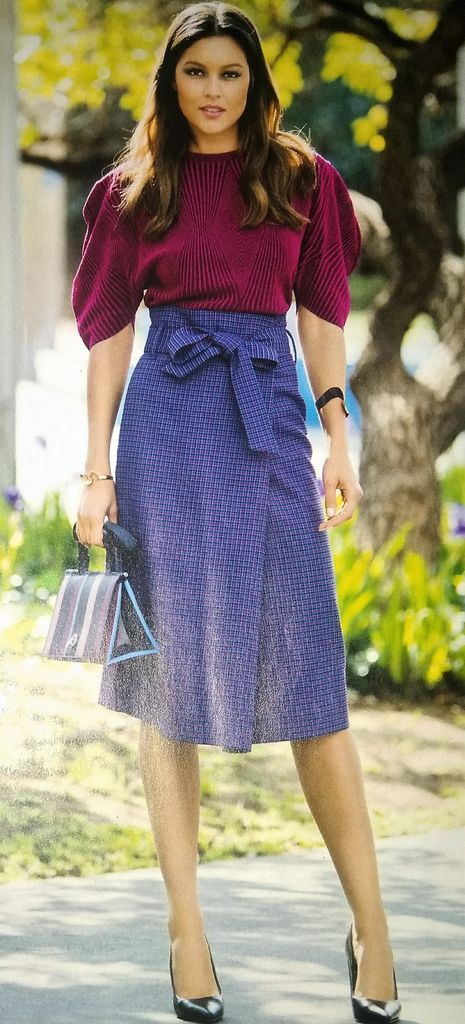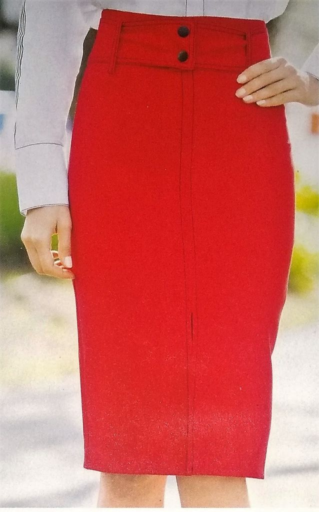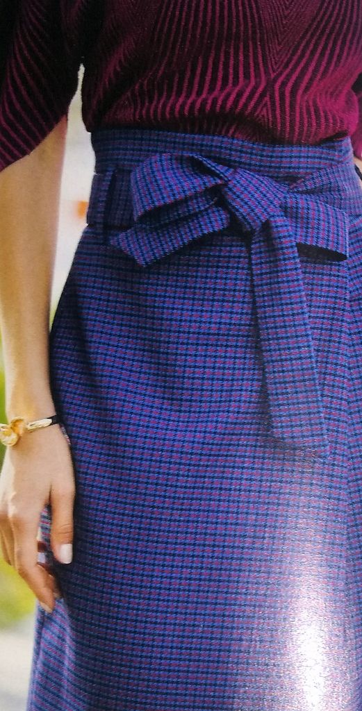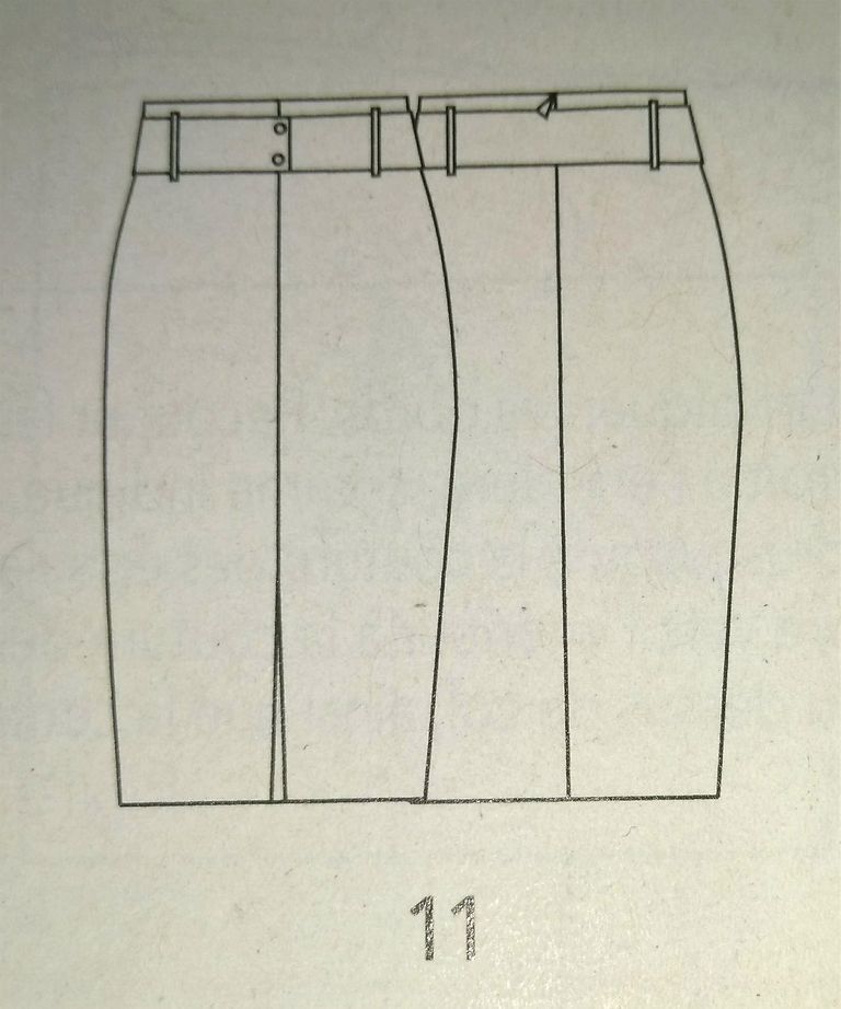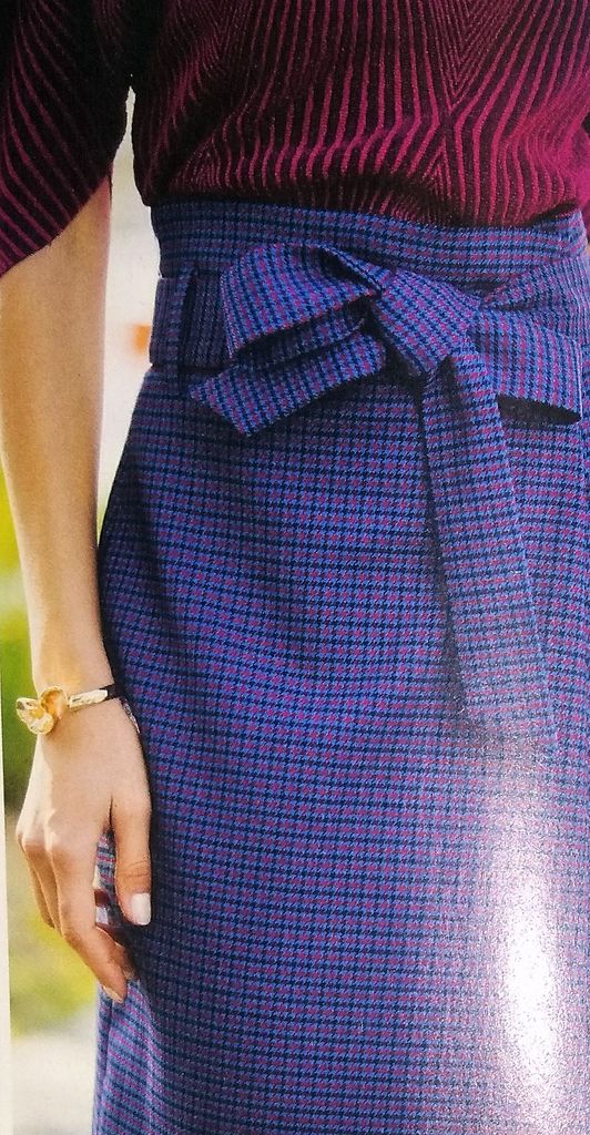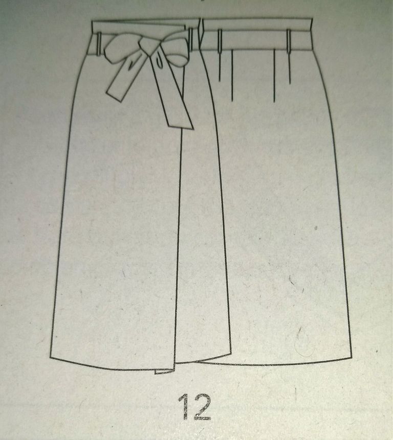 Voici une jolie jupe avec le panneau devant qui se plie pour former un faux portefeuille. Elle est légèrement évasée dans le bas. La taille est haute, pour fermer la jupe il suffit de nouer la ceinture. Elle est en tailles 40 – 44 – 48.