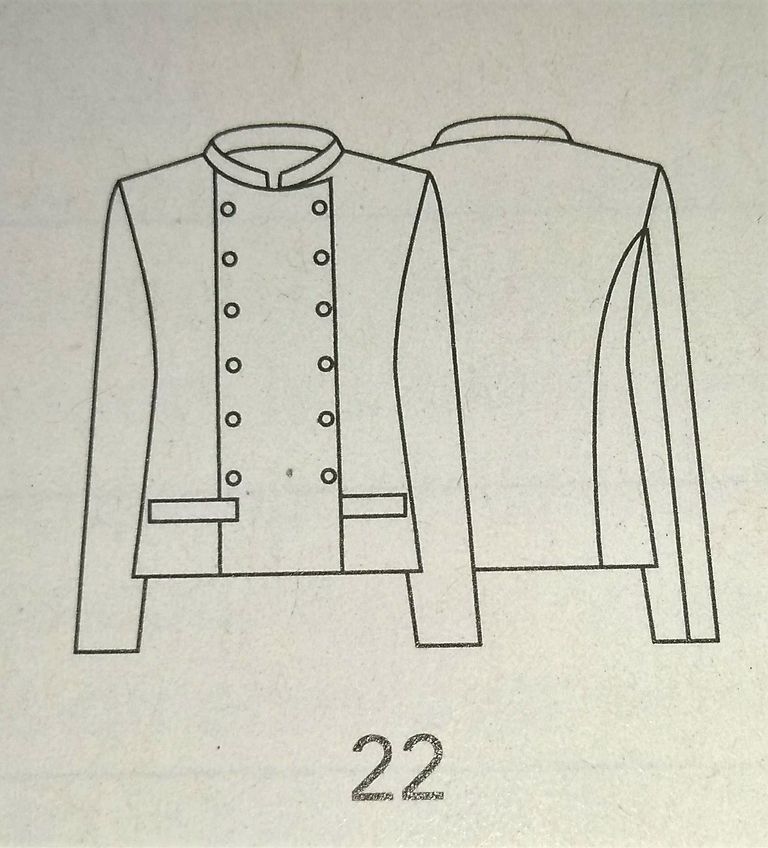 Encore une veste dans mes coups de cœur. Il s’agit d’un modèle de style officier. Ses manches sont longues et son col est de forme Mao. Le point de mire est ce double boutonnage, avec des boutons métalliques. Dommage que l’on ne puisse la voir fermée. Elle est en taille 38 – 42 – 46.