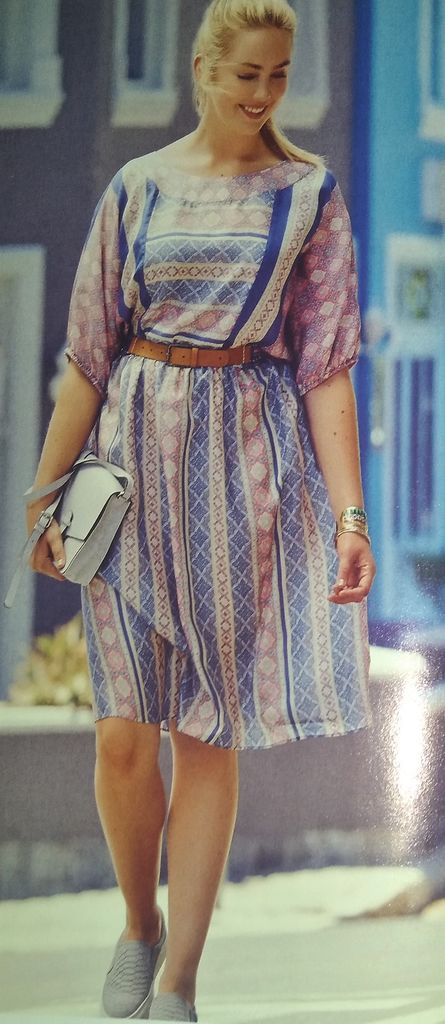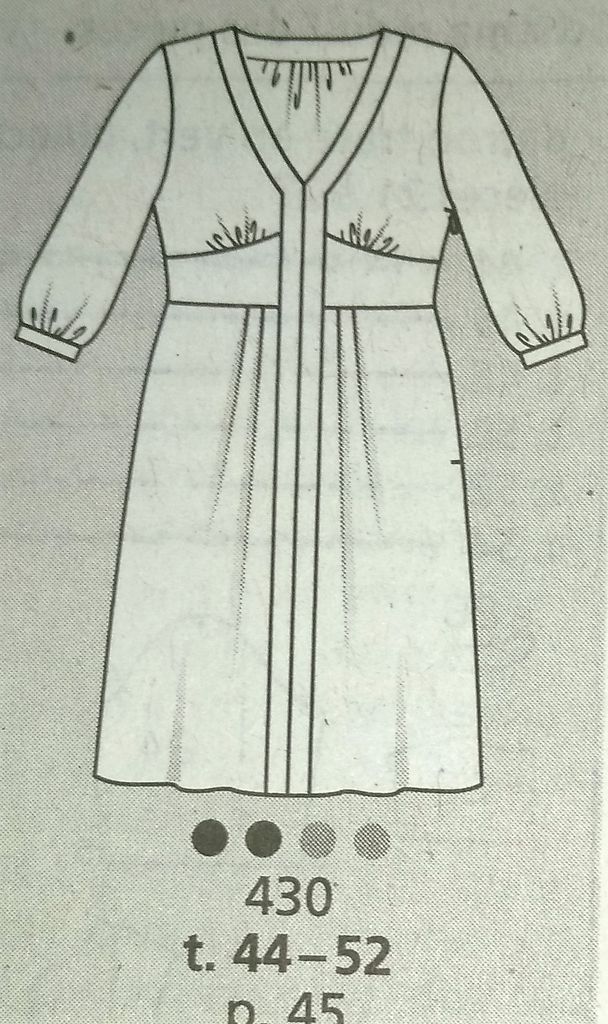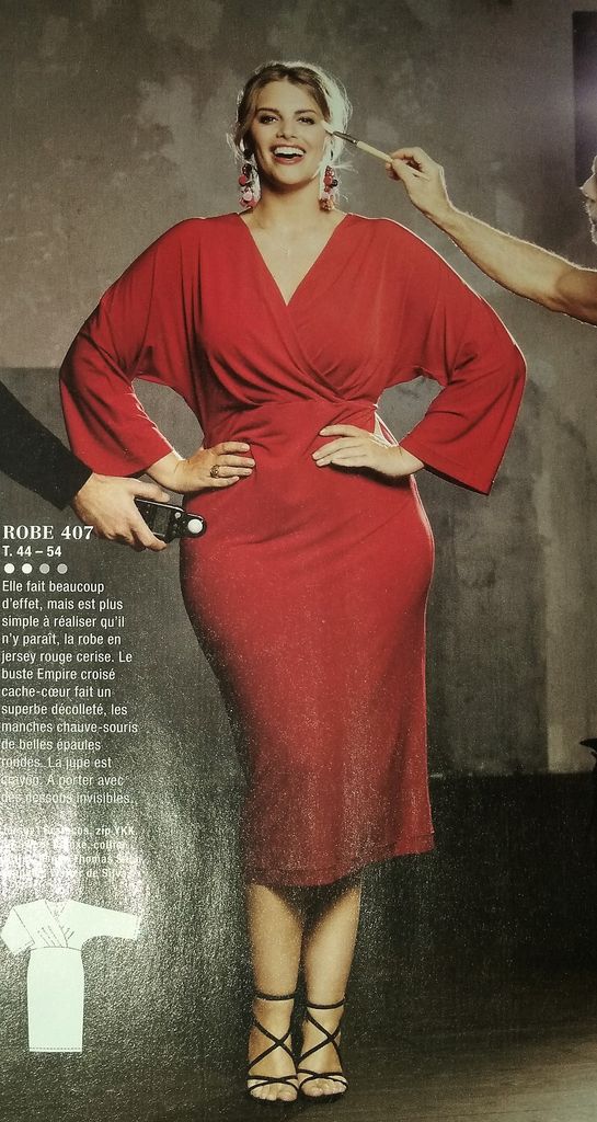 J’adore le glamour de cette robe. Elle est réalisée en jersey. Le buste est de forme empire croisé avec des plis, les manches kimonos sont assez large. La jupe est fourreau. Elle va de la taille 44 au 54.