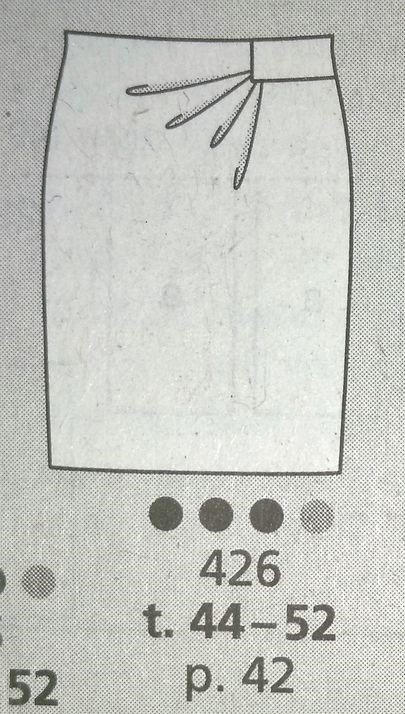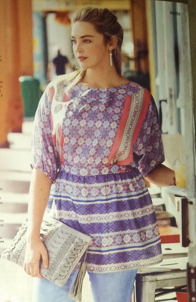 Ce top à basque est superbe lui aussi. Le décolleté en v est profond, le buste est orné de découpes. Les manches sont terminée par un volant. La large basque est plus longue dans le dos. Il va de la taille 44 au 54.