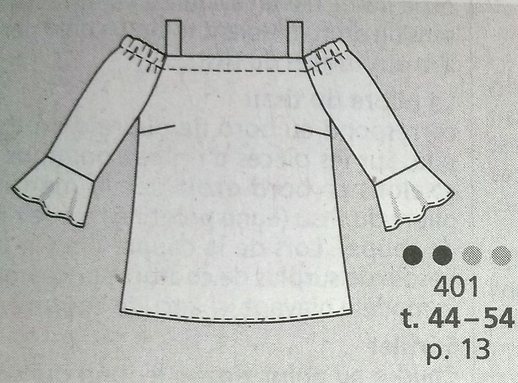 Un grand classique certes, mais toujours plein de charme. Il s’agit de la blouse aux épaules dégagées. Elle est évasée, avec des pinces de poitrine et de large bretelles. Ses manches sont de longueur trois-quart et ornées d’un large volant. Elle va de la taille 44 au 54.